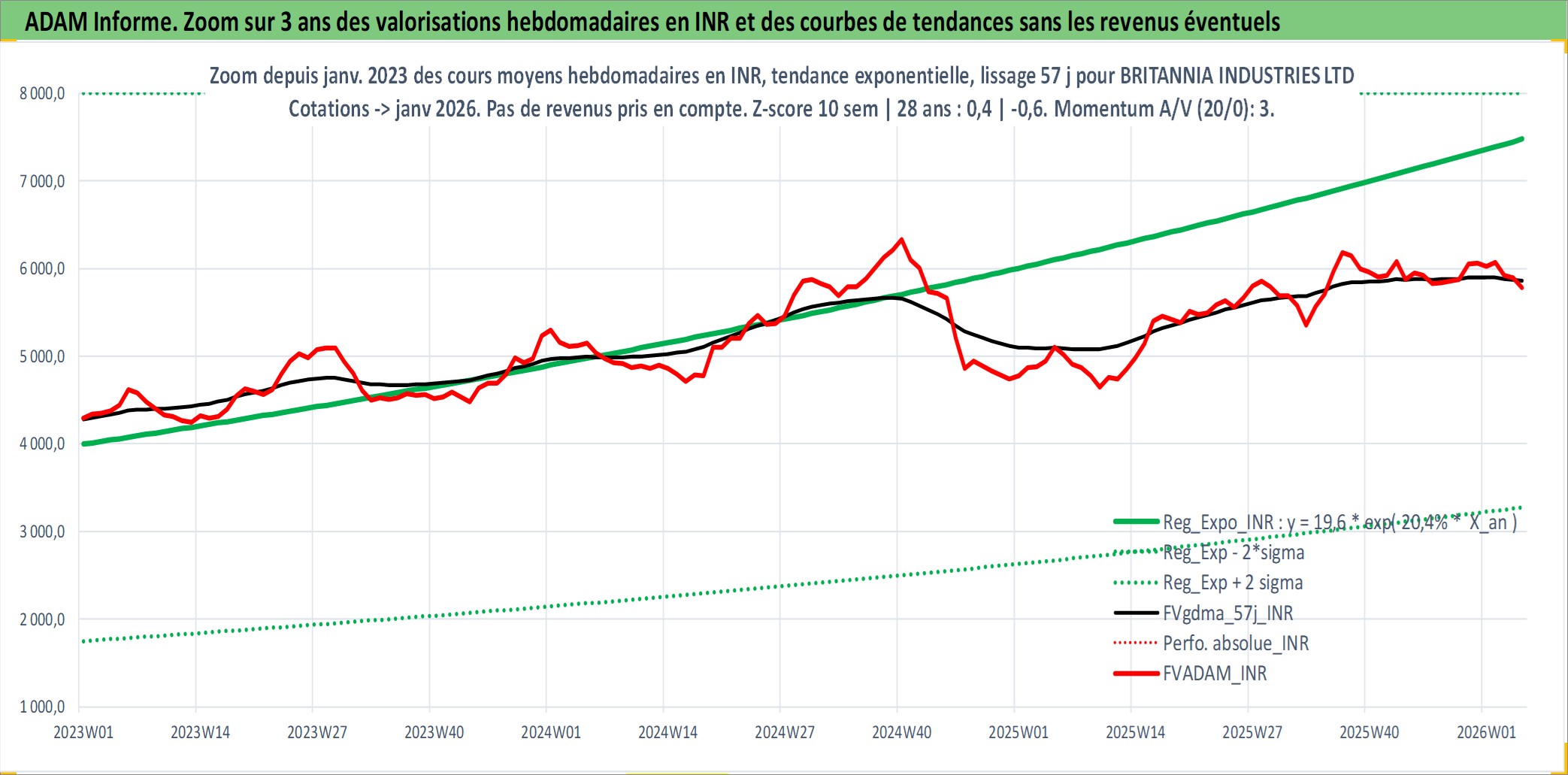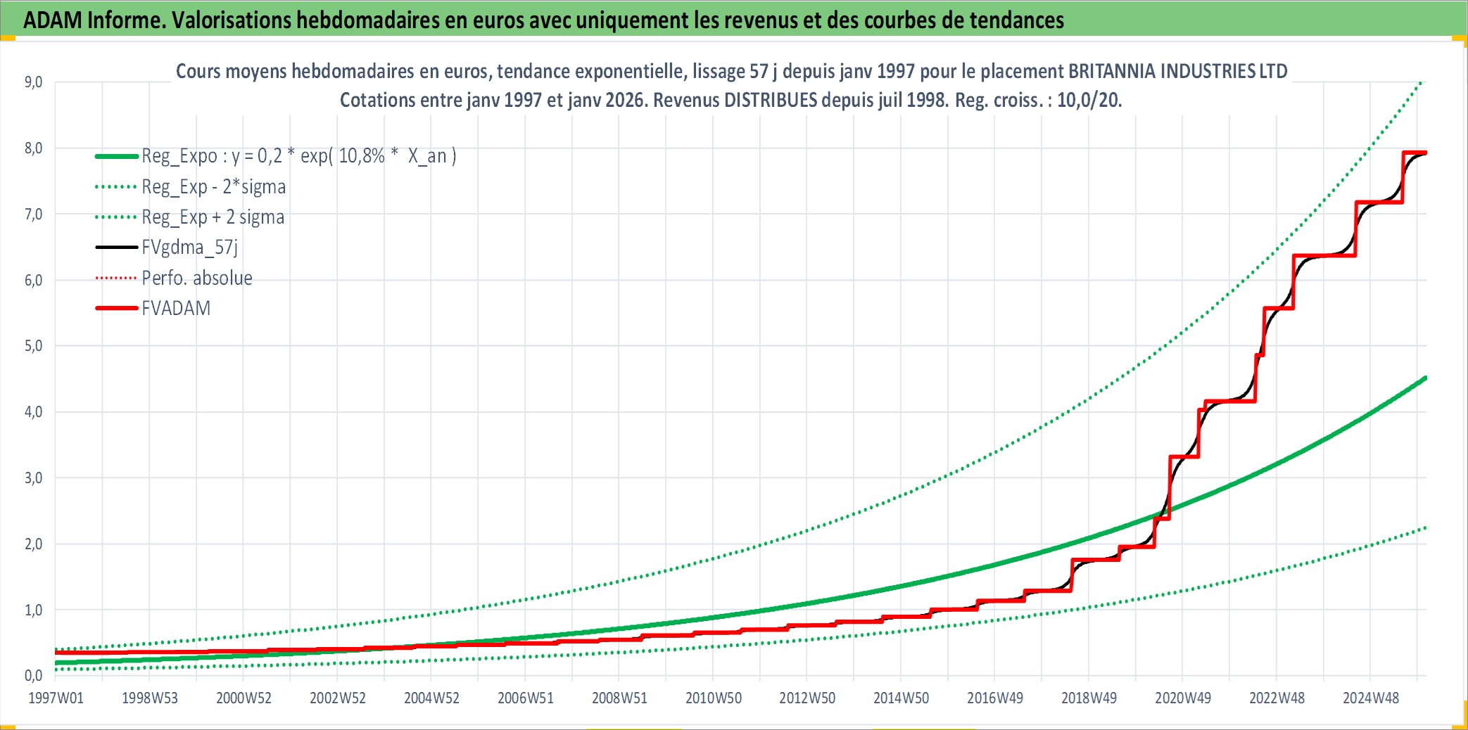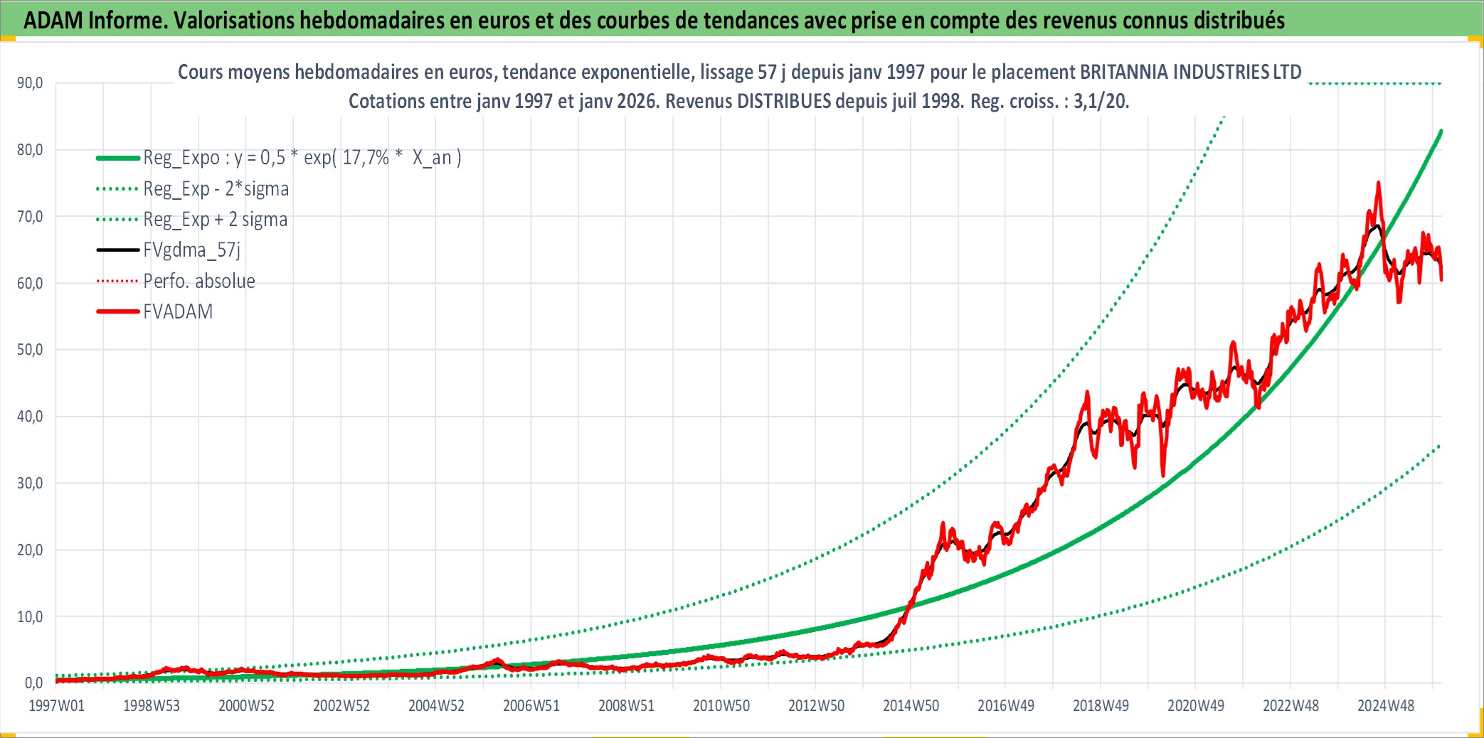 Site dédié aux investisseursPage dédiée sur site financeAnalyse des valorisations hebdomadaires de l'action BRITANNIA INDUSTRIES LTD. Cet actif est cote en INR. Les valorisations sont en contrevaleur EURO et couvrent les semaines 1997W01 a 2026W05. Les revenus de cet actif financier sont pris en compte depuis la semaine 1998W29. La note ESG de cet actif n'est pas connue.