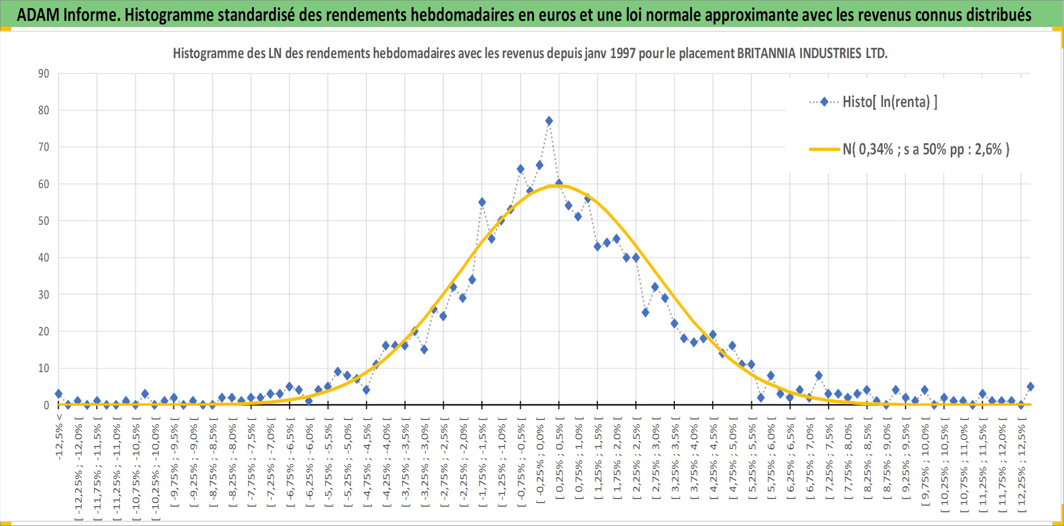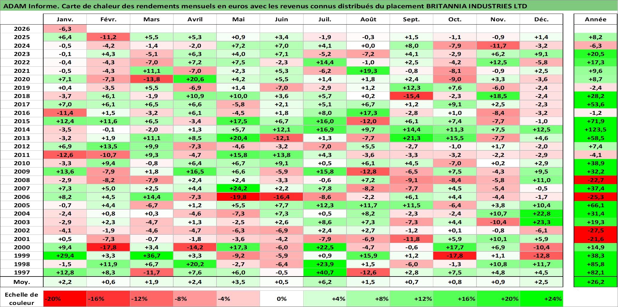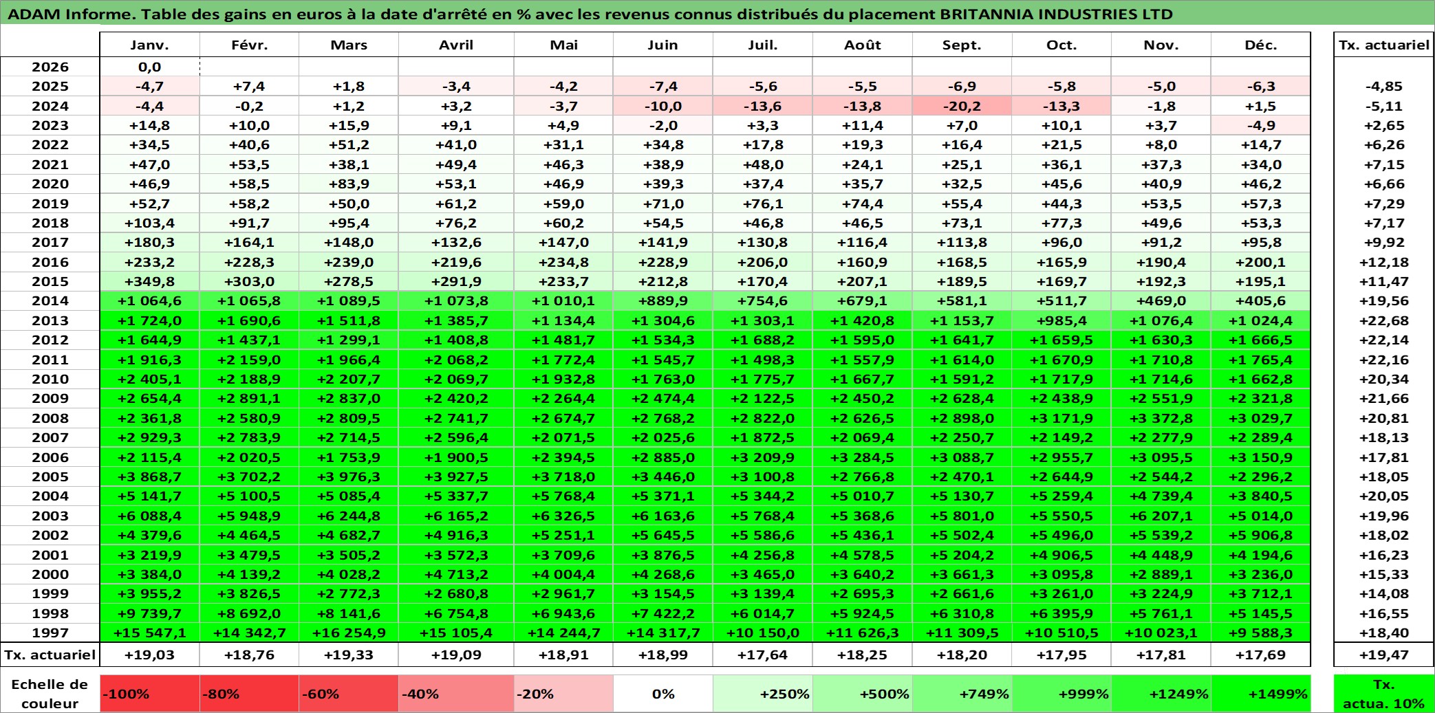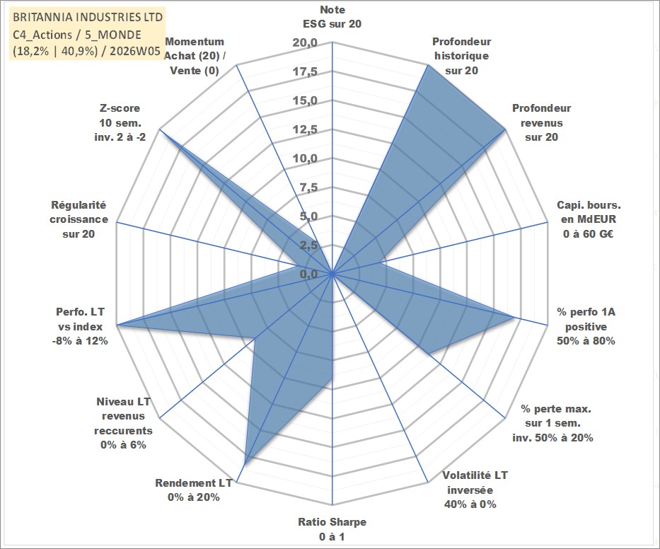 Site dédié aux investisseursPage dédiée sur site financeAnalyse des valorisations hebdomadaires de l'action BRITANNIA INDUSTRIES LTD. Cet actif est cote en INR. Les valorisations sont en contrevaleur EURO et couvrent les semaines 1997W01 a 2026W05. Les revenus de cet actif financier sont pris en compte depuis la semaine 1998W29. La note ESG de cet actif n'est pas connue.