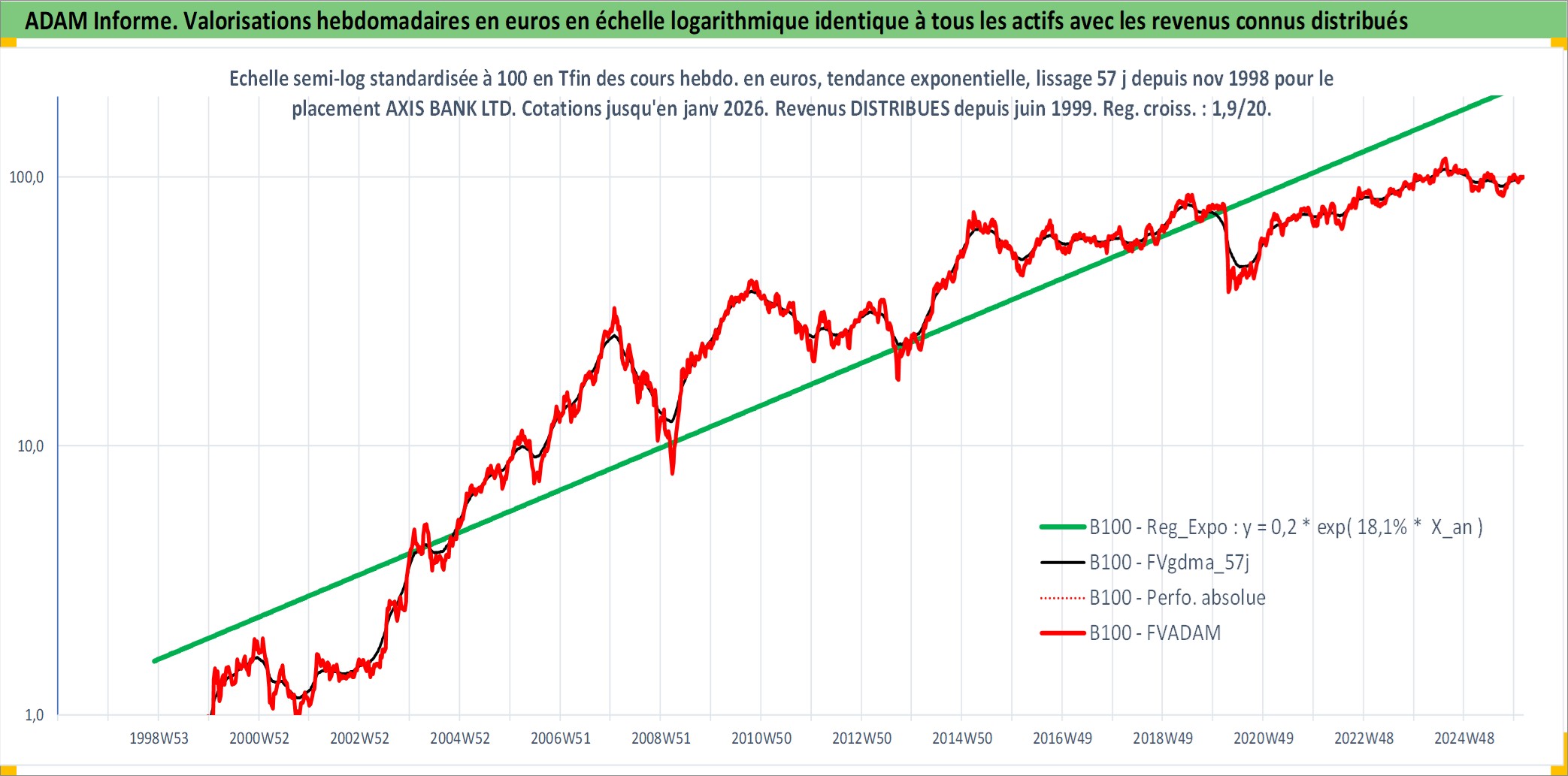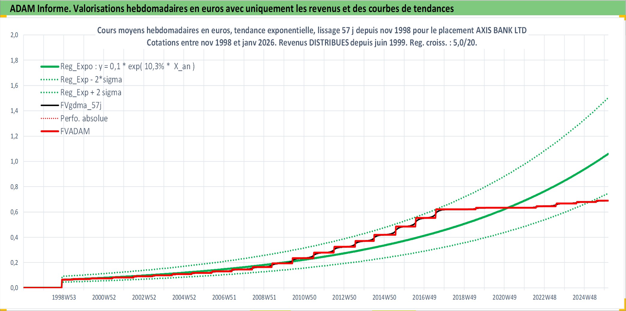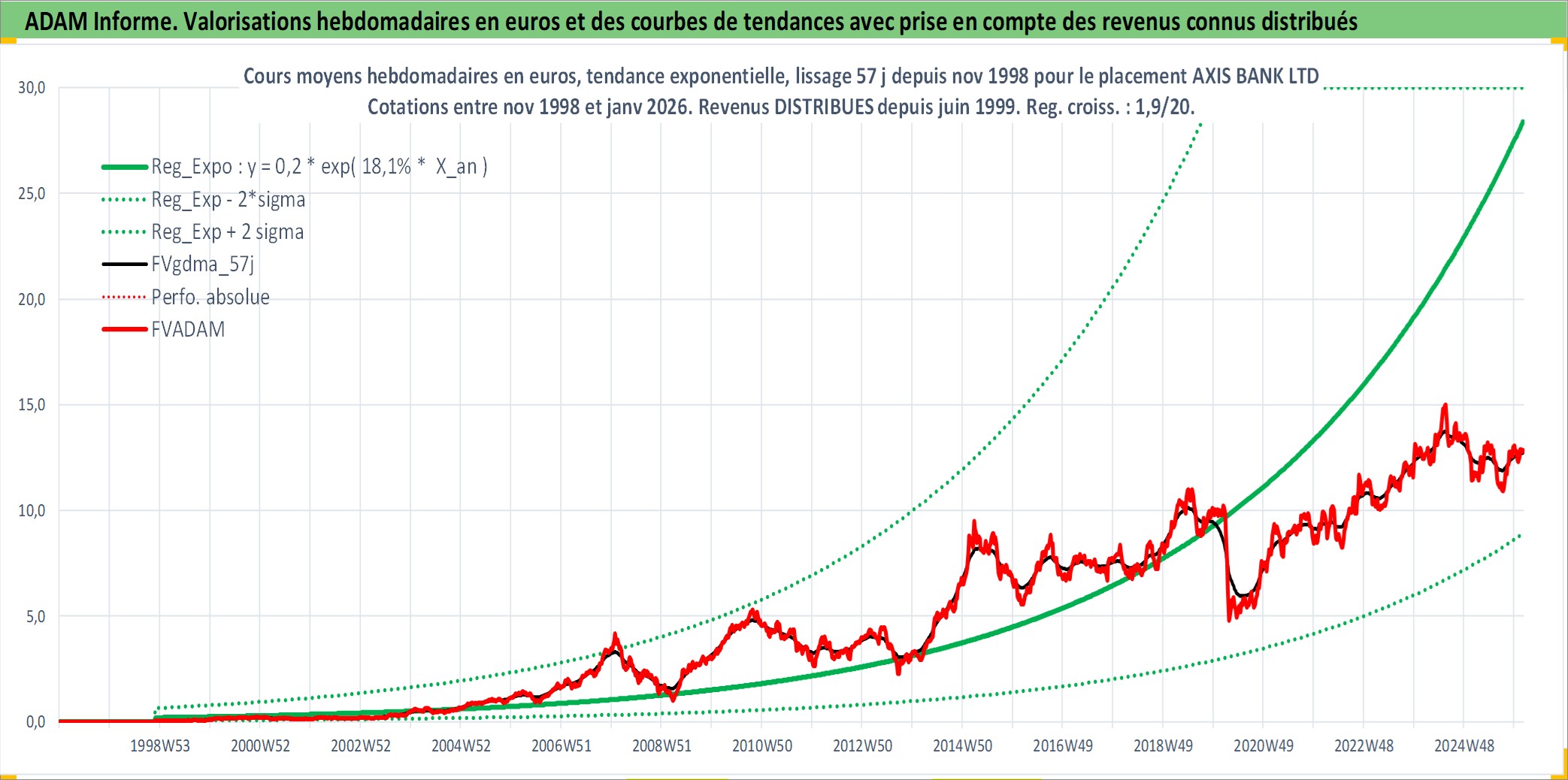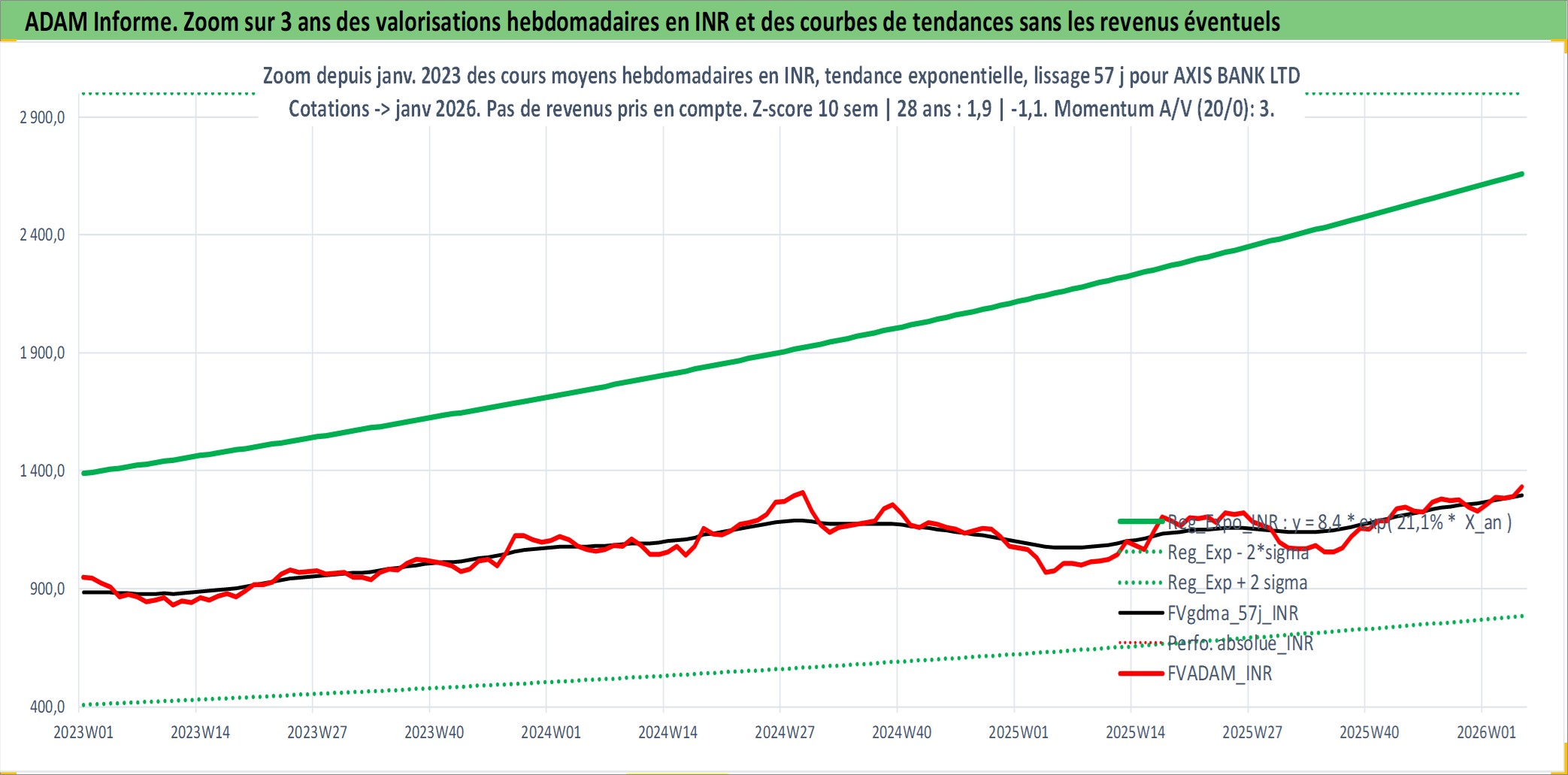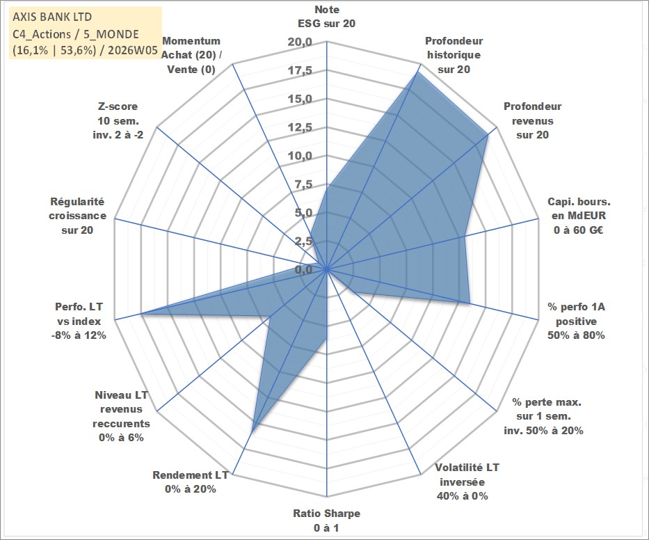 Site dédié aux investisseursPage dédiée sur site financeAnalyse des valorisations hebdomadaires de l'action AXIS BANK LTD. Cet actif est cote en INR. Les valorisations sont en contrevaleur EURO et couvrent les semaines 1998W48 a 2026W05. Les revenus de cet actif financier sont pris en compte depuis la semaine 1999W24. La note globale ESG de cet actif est estimee a 7.0 (apres rebasage entre 0 et 20).