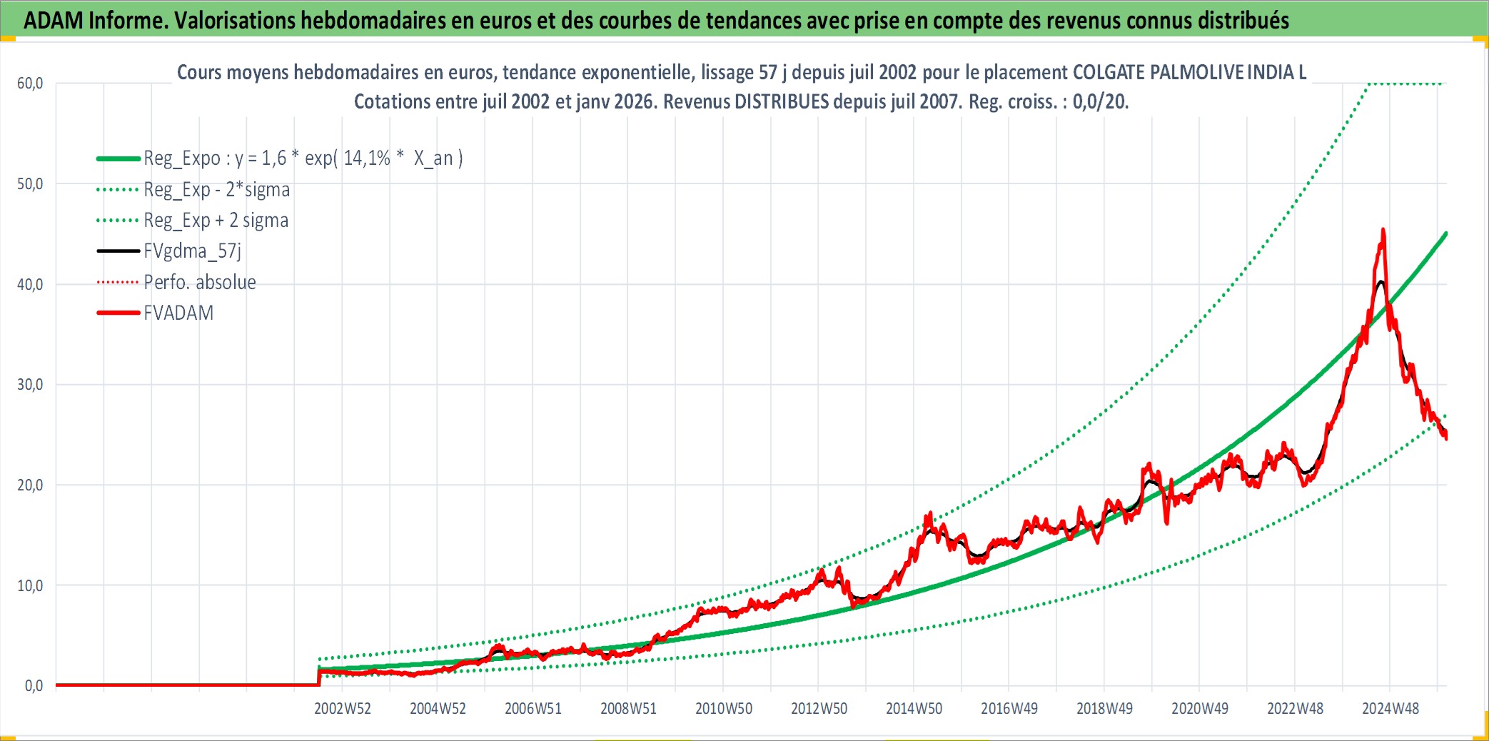 Site dédié aux investisseursPage dédiée sur site financeAnalyse des valorisations hebdomadaires de l'action COLGATE PALMOLIVE INDIA LTD. Cet actif est cote en INR. Les valorisations sont en contrevaleur EURO et couvrent les semaines 2002W27 a 2026W05. Les revenus de cet actif financier sont pris en compte depuis la semaine 2007W29. La note ESG de cet actif n'est pas connue.