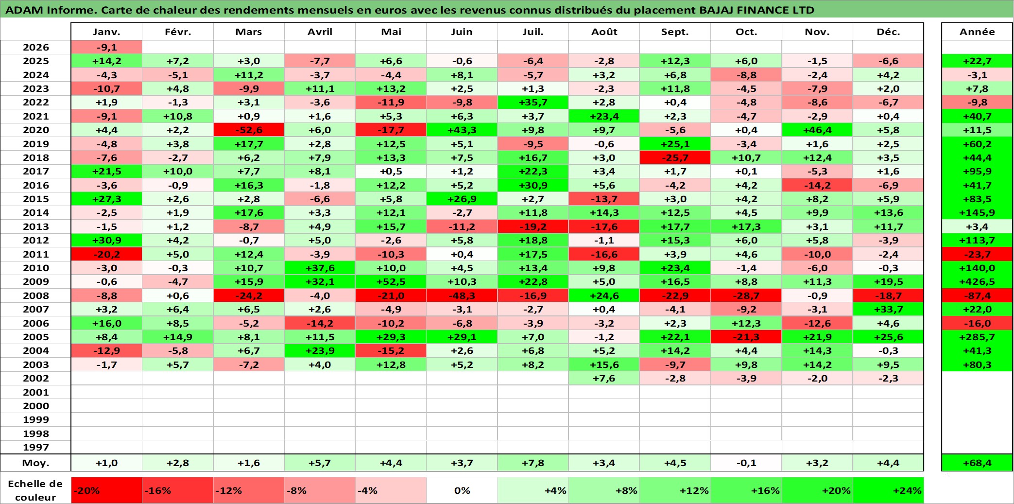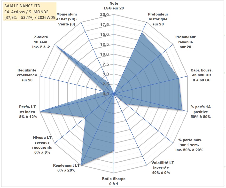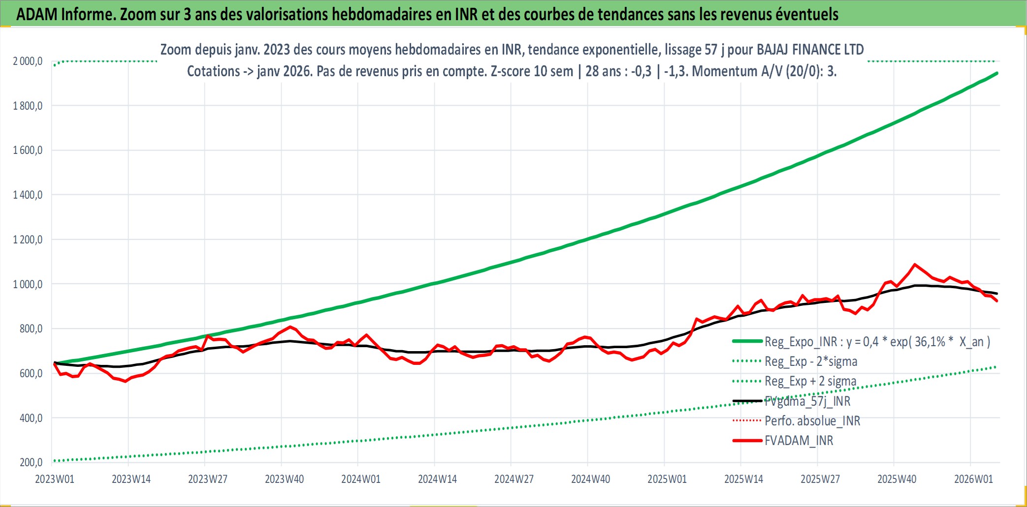 Site dédié aux investisseursPage dédiée sur site financeAnalyse des valorisations hebdomadaires de l'action BAJAJ FINANCE LTD. Cet actif est cote en INR. Les valorisations sont en contrevaleur EURO et couvrent les semaines 2002W27 a 2026W05. Les revenus de cet actif financier sont pris en compte depuis la semaine 2003W28. La note ESG de cet actif n'est pas connue.