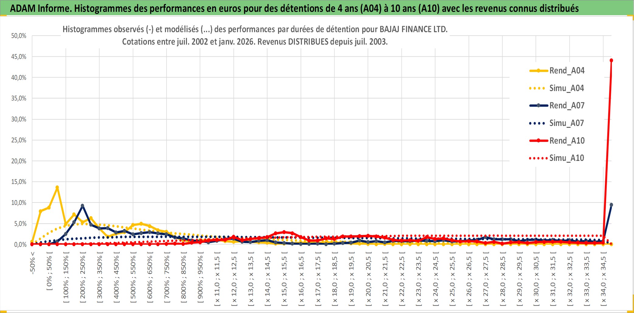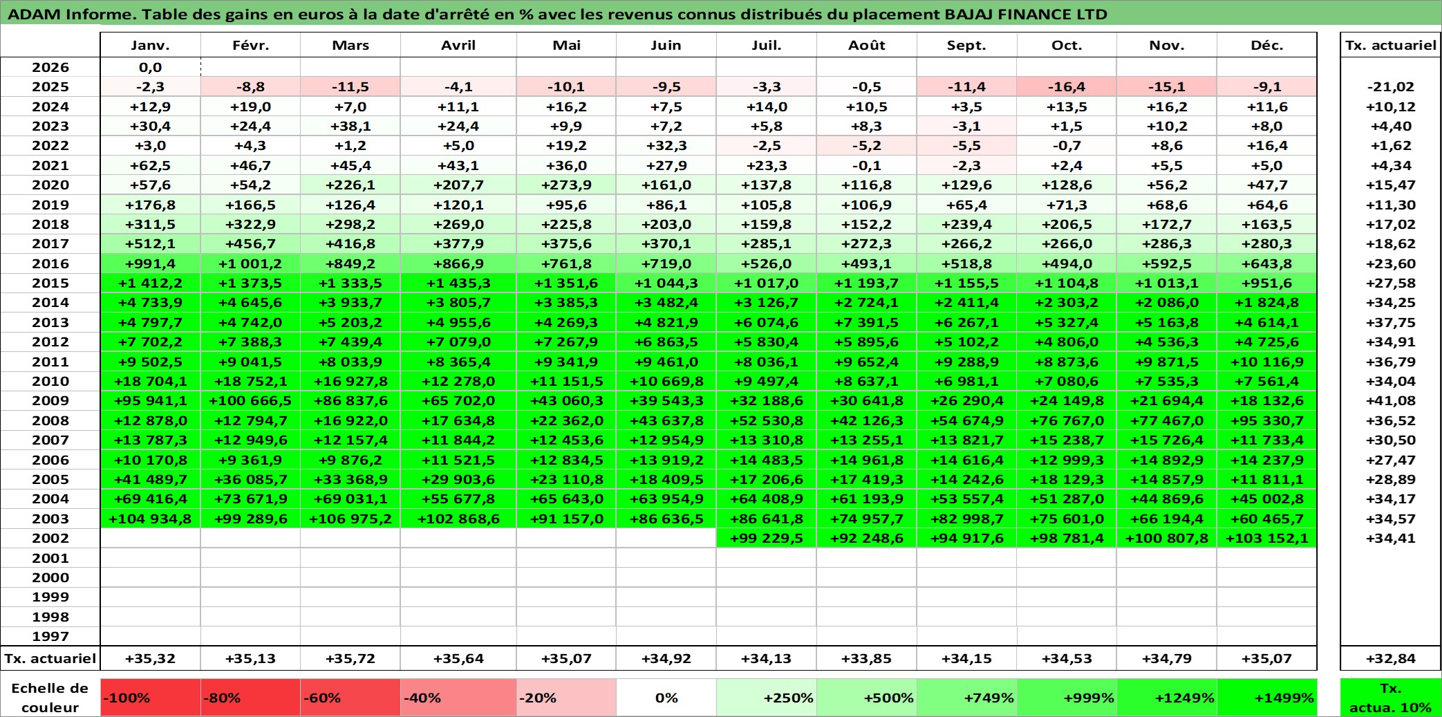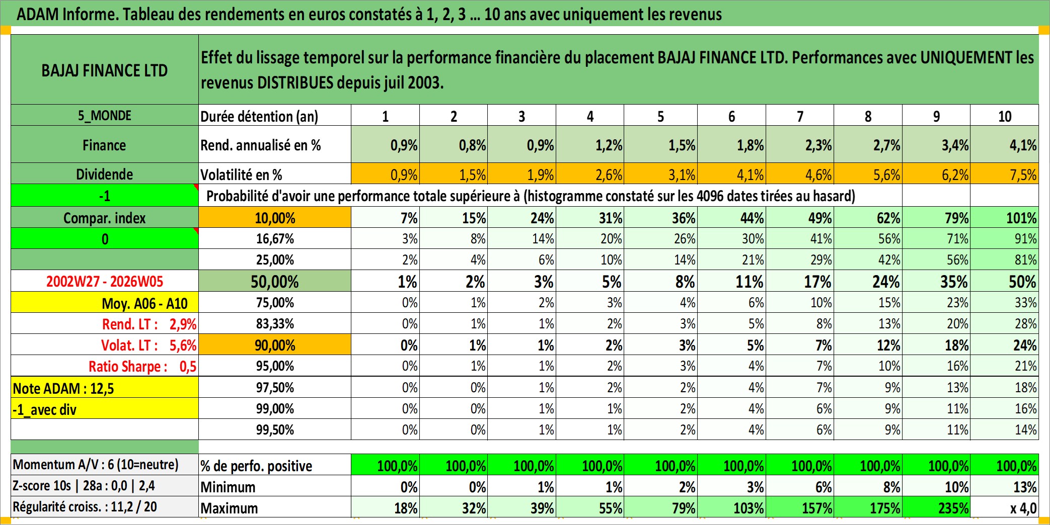 Site dédié aux investisseursPage dédiée sur site financeAnalyse des valorisations hebdomadaires de l'action BAJAJ FINANCE LTD. Cet actif est cote en INR. Les valorisations sont en contrevaleur EURO et couvrent les semaines 2002W27 a 2026W05. Les revenus de cet actif financier sont pris en compte depuis la semaine 2003W28. La note ESG de cet actif n'est pas connue.