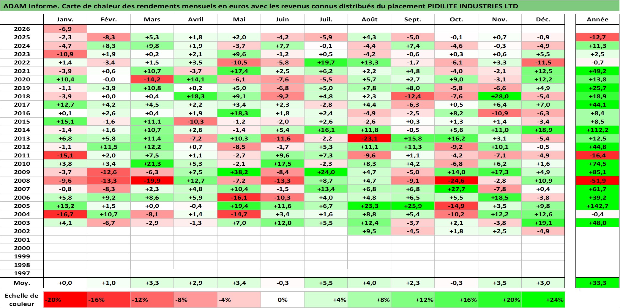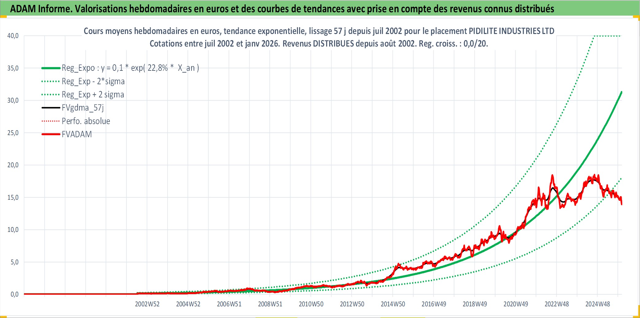 Site dédié aux investisseursPage dédiée sur site financeAnalyse des valorisations hebdomadaires de l'action PIDILITE INDUSTRIES LTD. Cet actif est cote en INR. Les valorisations sont en contrevaleur EURO et couvrent les semaines 2002W27 a 2026W05. Les revenus de cet actif financier sont pris en compte depuis la semaine 2002W34. La note ESG de cet actif n'est pas connue.