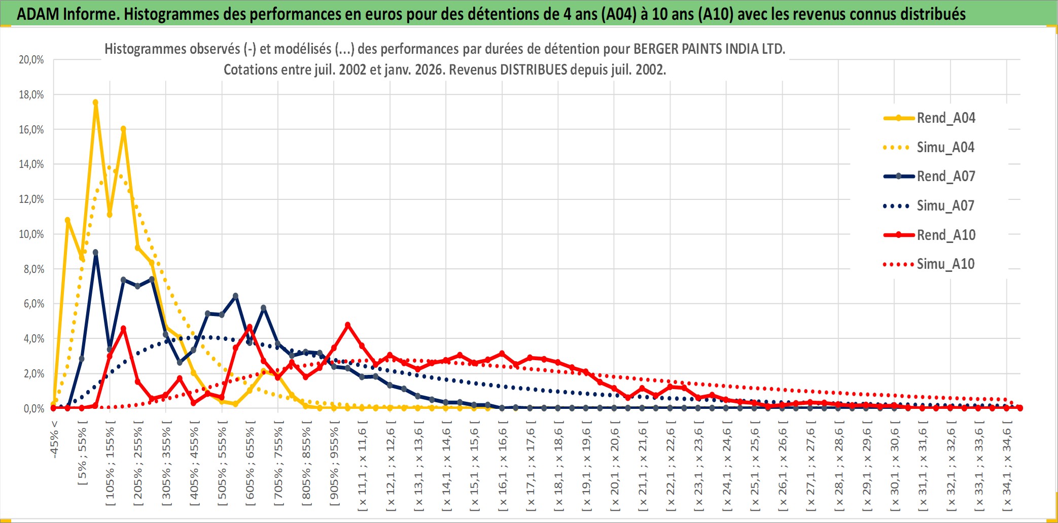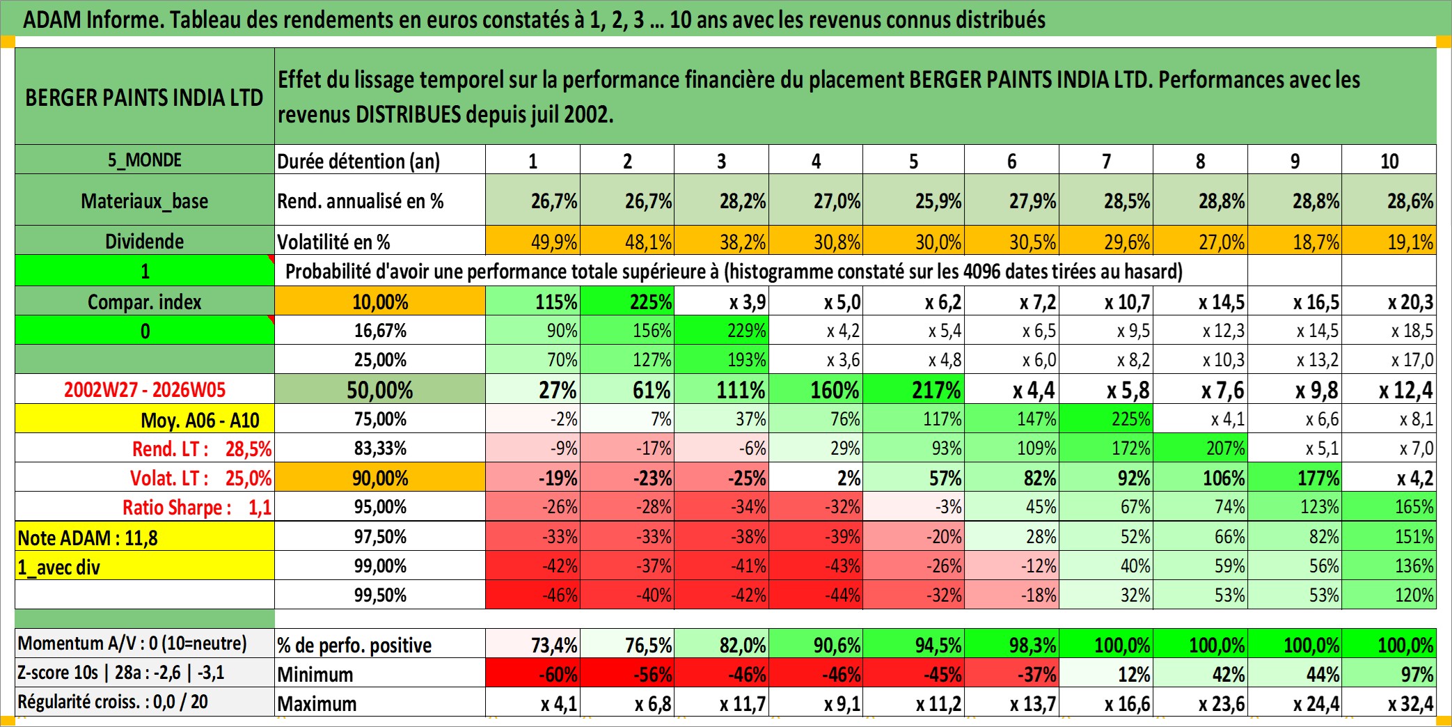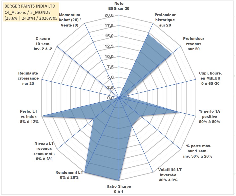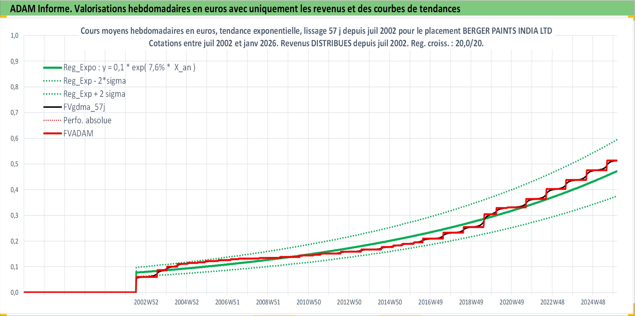 Site dédié aux investisseursPage dédiée sur site financeAnalyse des valorisations hebdomadaires de l'action BERGER PAINTS INDIA LTD. Cet actif est cote en INR. Les valorisations sont en contrevaleur EURO et couvrent les semaines 2002W27 a 2026W05. Les revenus de cet actif financier sont pris en compte depuis la semaine 2002W28. La note ESG de cet actif n'est pas connue.