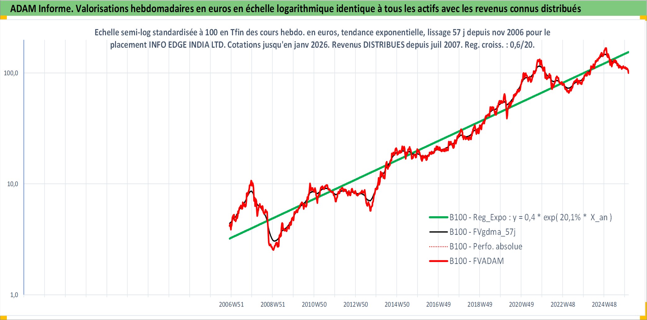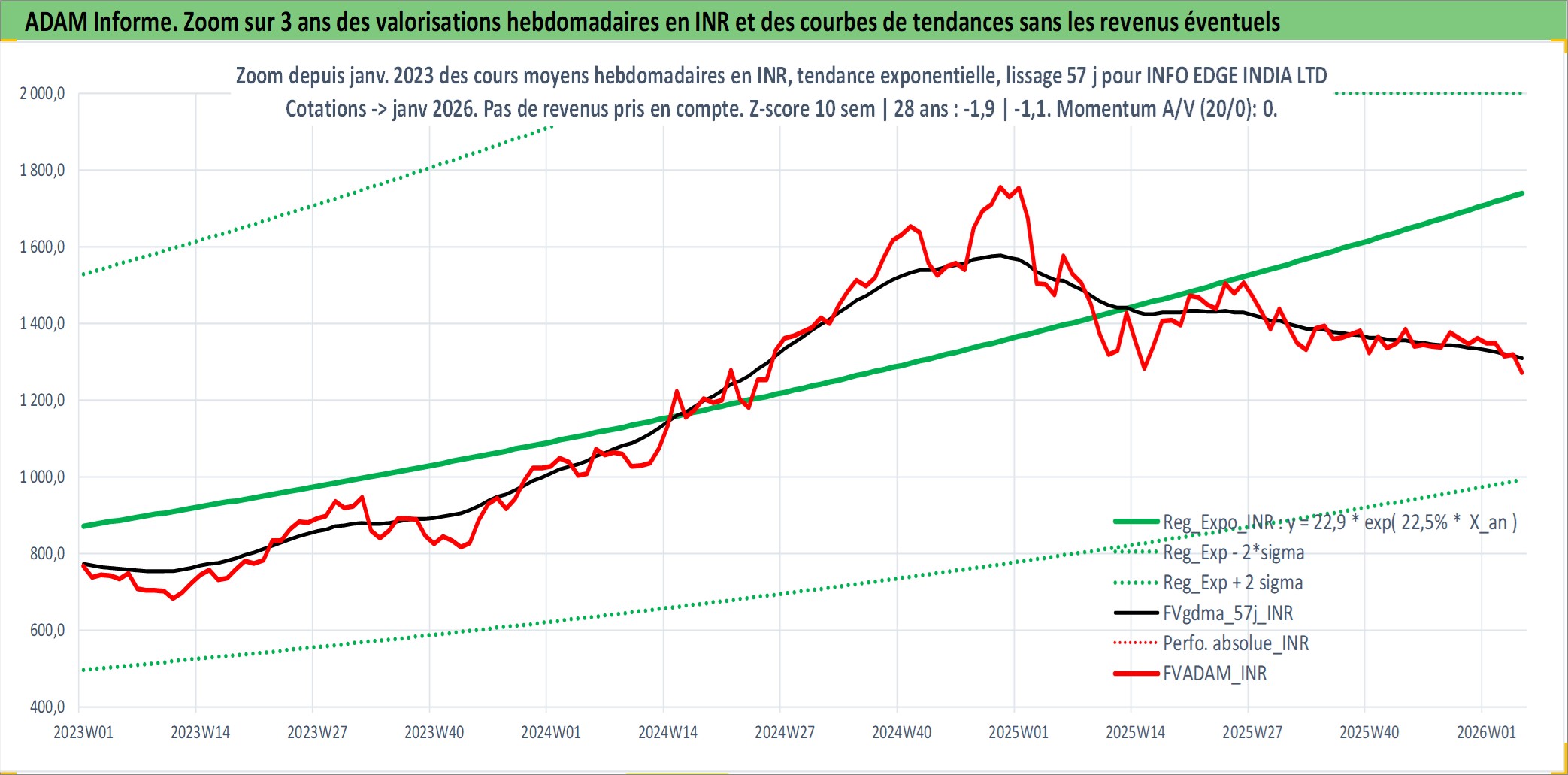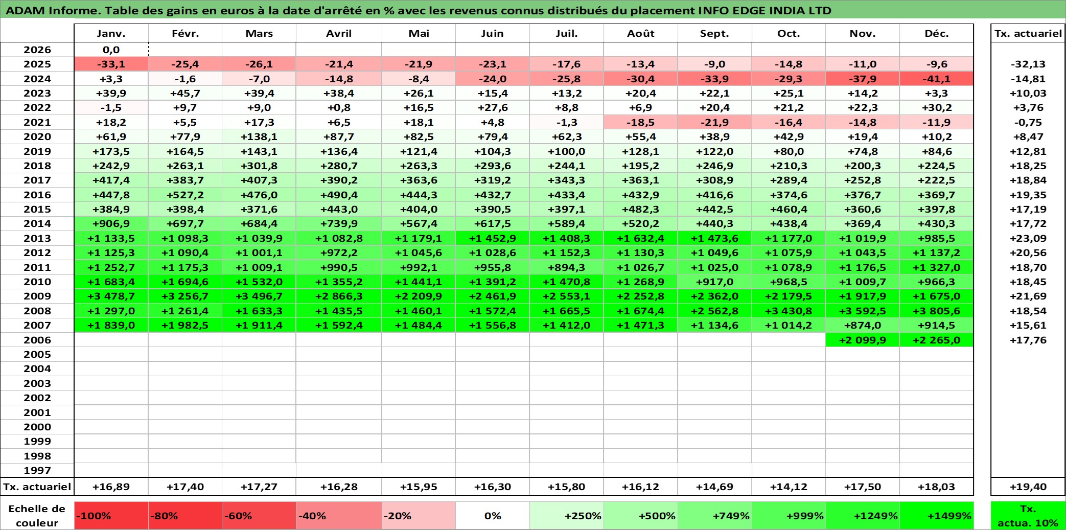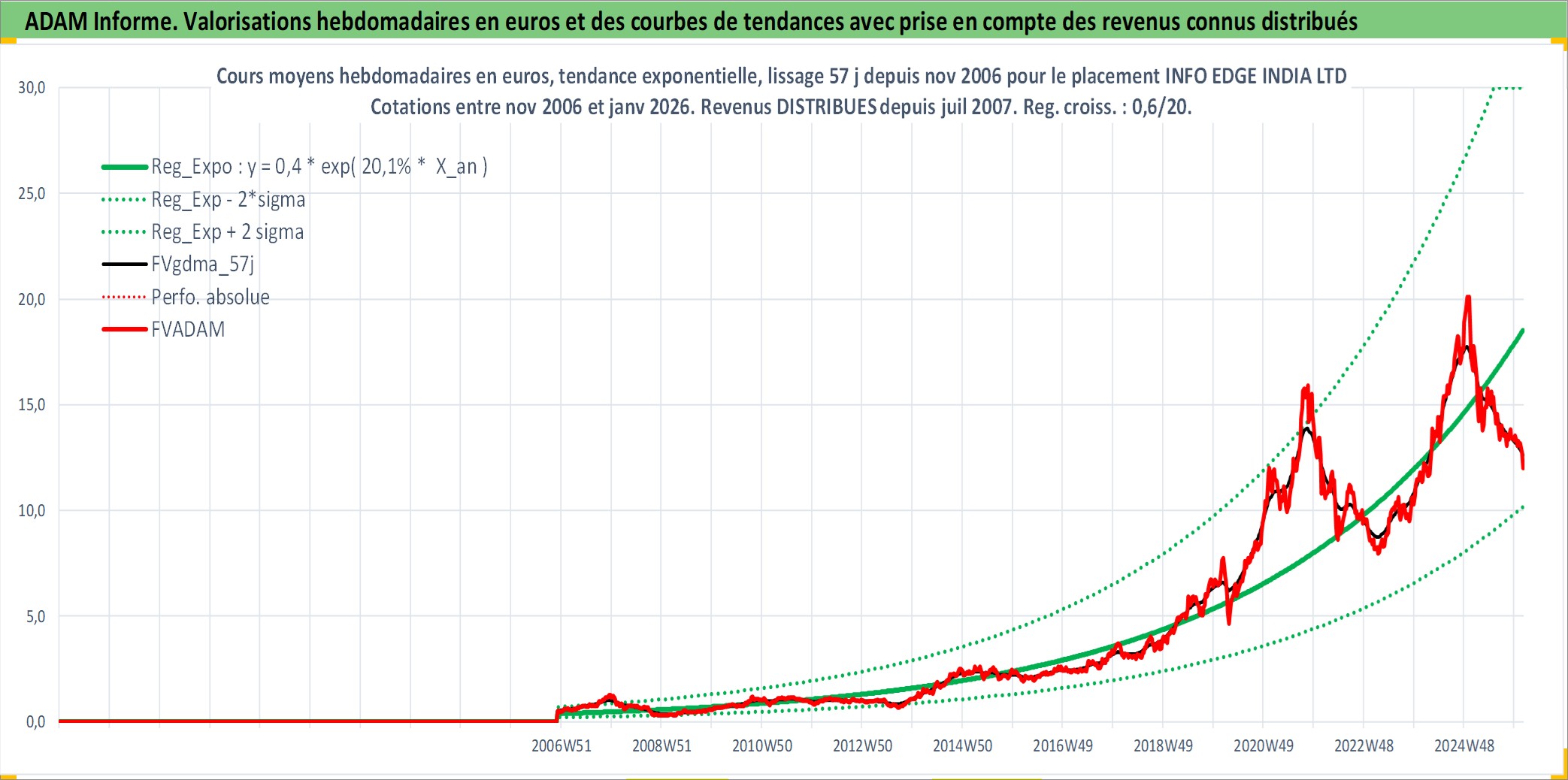 Site dédié aux investisseursPage dédiée sur site financeAnalyse des valorisations hebdomadaires de l'action INFO EDGE INDIA LTD. Cet actif est cote en INR. Les valorisations sont en contrevaleur EURO et couvrent les semaines 2006W47 a 2026W05. Les revenus de cet actif financier sont pris en compte depuis la semaine 2007W29. La note ESG de cet actif n'est pas connue.