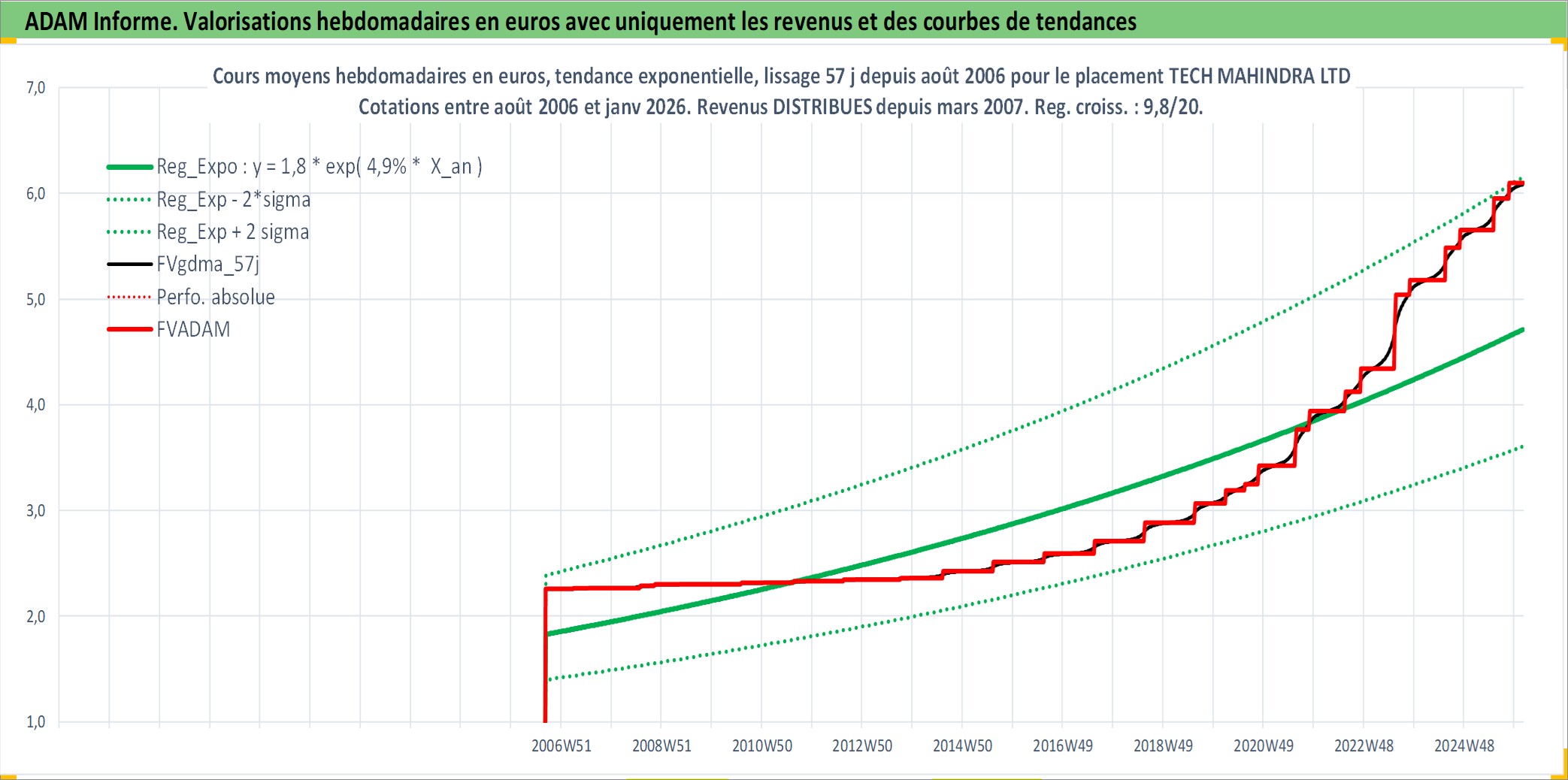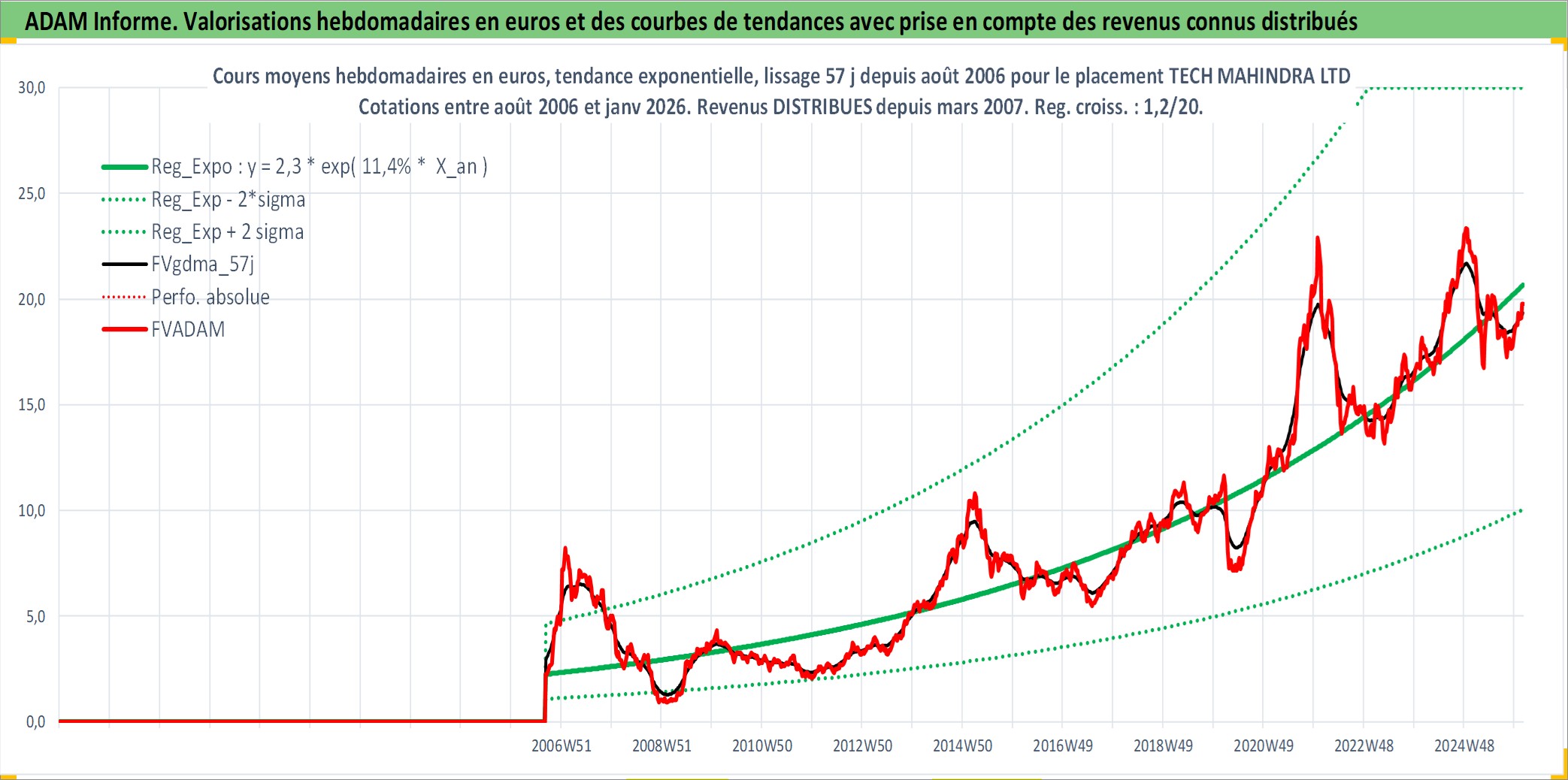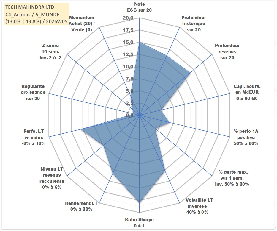 Site dédié aux investisseursPage dédiée sur site financeAnalyse des valorisations hebdomadaires de l'action TECH MAHINDRA LTD. Cet actif est cote en INR. Les valorisations sont en contrevaleur EURO et couvrent les semaines 2006W35 a 2026W05. Les revenus de cet actif financier sont pris en compte depuis la semaine 2007W12. La note globale ESG de cet actif est estimee a 15.0 (apres rebasage entre 0 et 20).