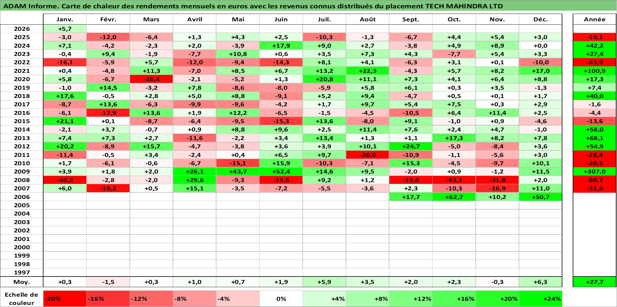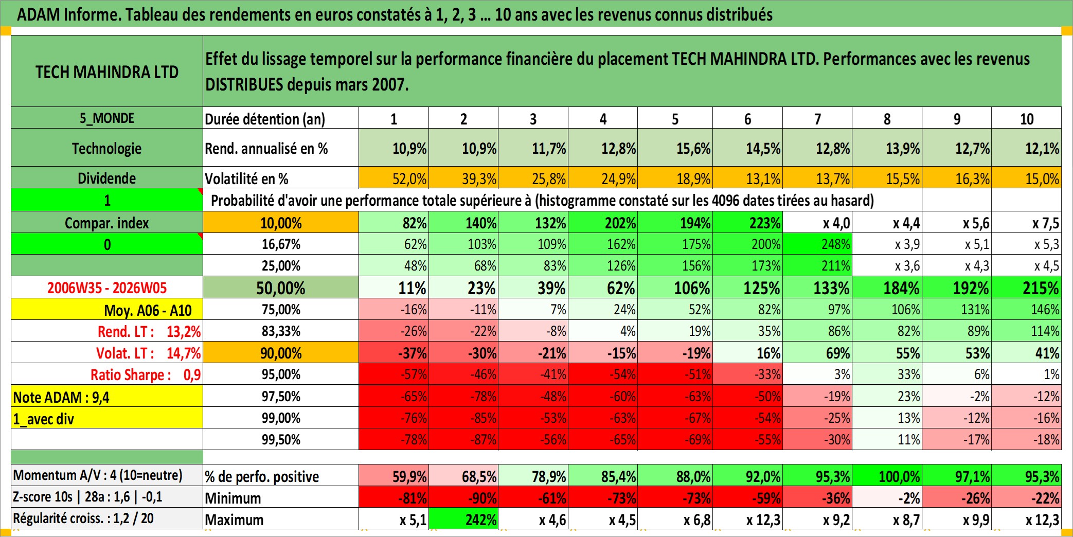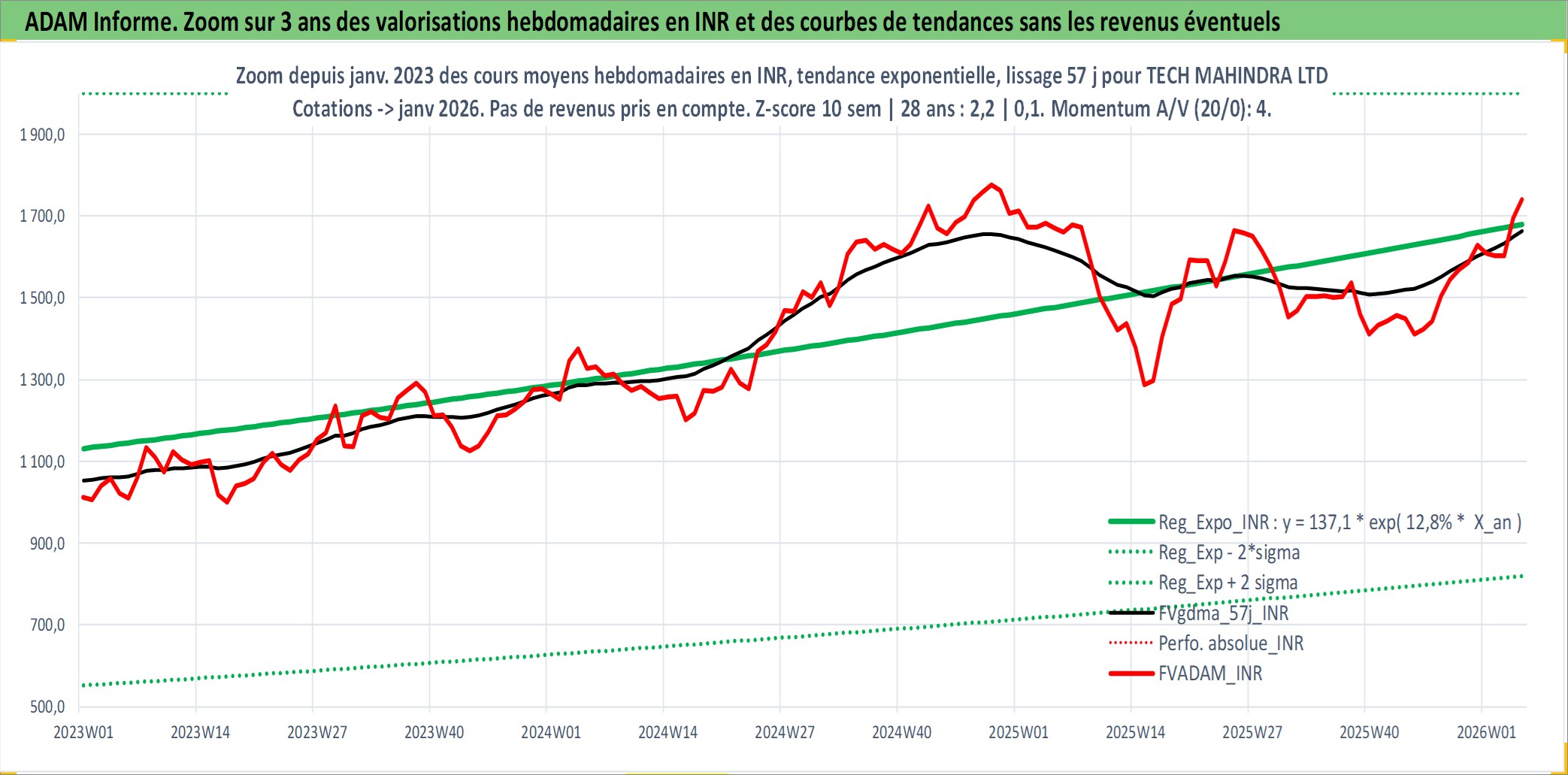 Site dédié aux investisseursPage dédiée sur site financeAnalyse des valorisations hebdomadaires de l'action TECH MAHINDRA LTD. Cet actif est cote en INR. Les valorisations sont en contrevaleur EURO et couvrent les semaines 2006W35 a 2026W05. Les revenus de cet actif financier sont pris en compte depuis la semaine 2007W12. La note globale ESG de cet actif est estimee a 15.0 (apres rebasage entre 0 et 20).