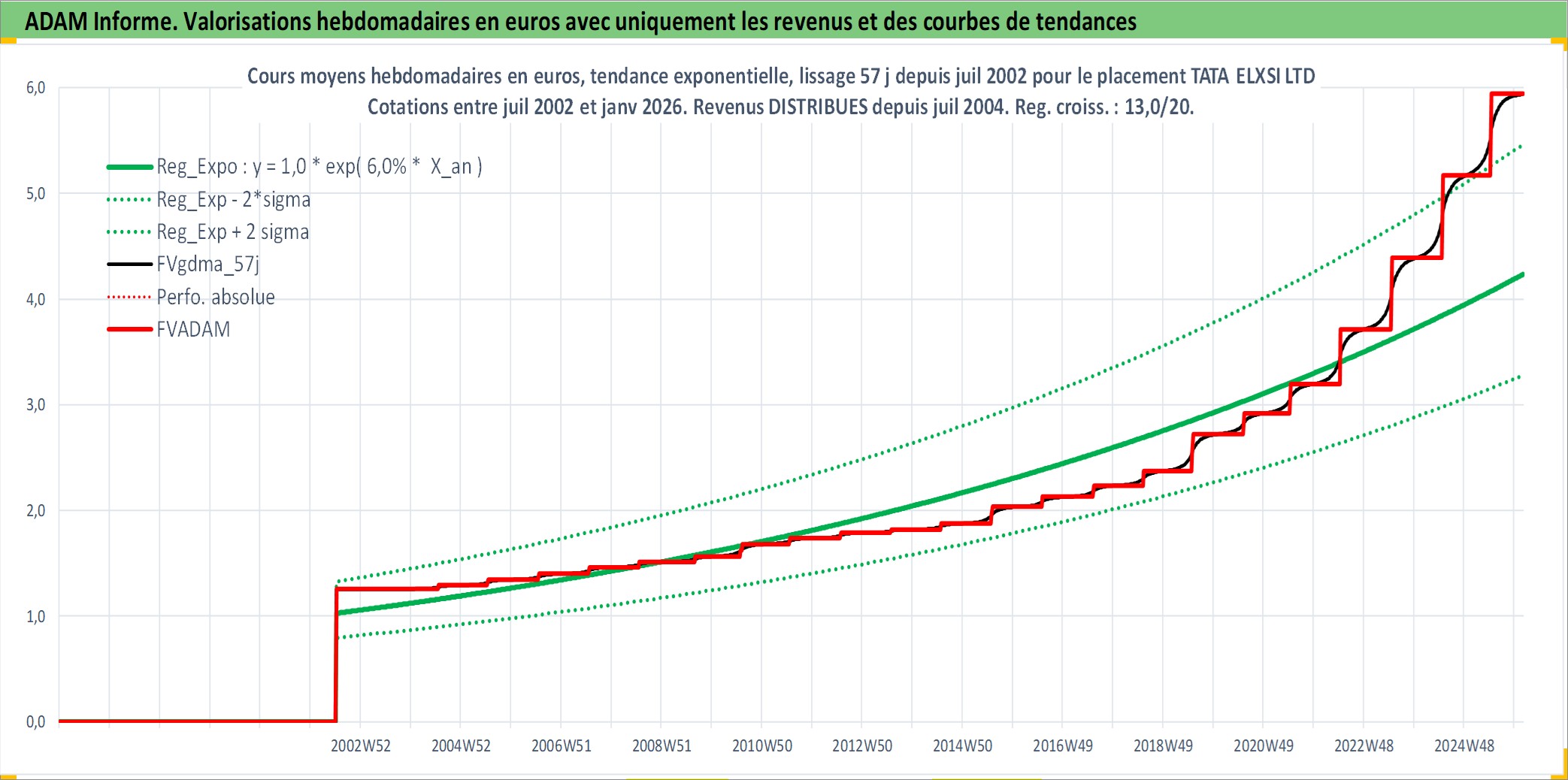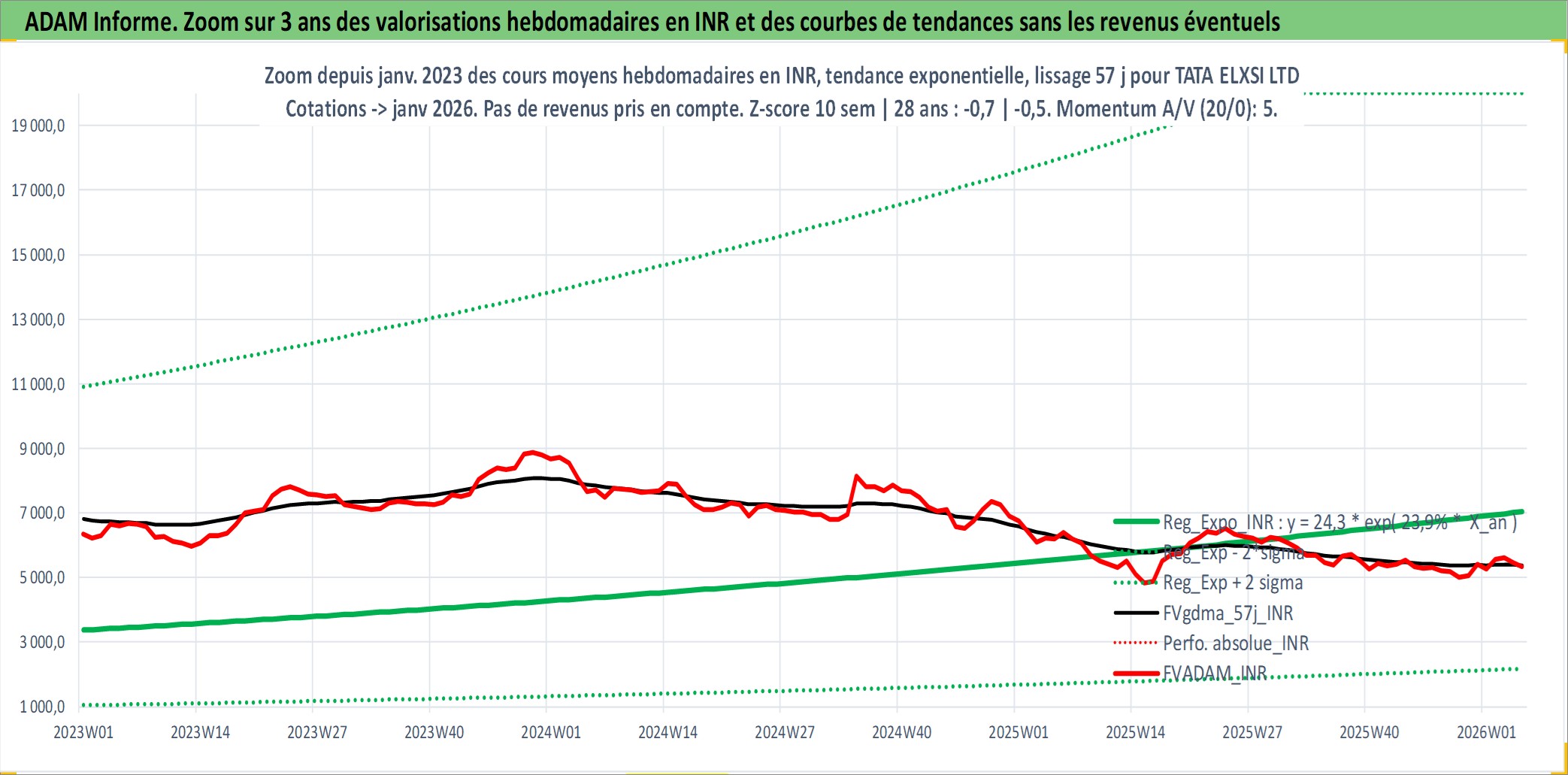 Site dédié aux investisseursPage dédiée sur site financeAnalyse des valorisations hebdomadaires de l'action TATA ELXSI LTD. Cet actif est cote en INR. Les valorisations sont en contrevaleur EURO et couvrent les semaines 2002W27 a 2026W05. Les revenus de cet actif financier sont pris en compte depuis la semaine 2004W29. La note ESG de cet actif n'est pas connue.
