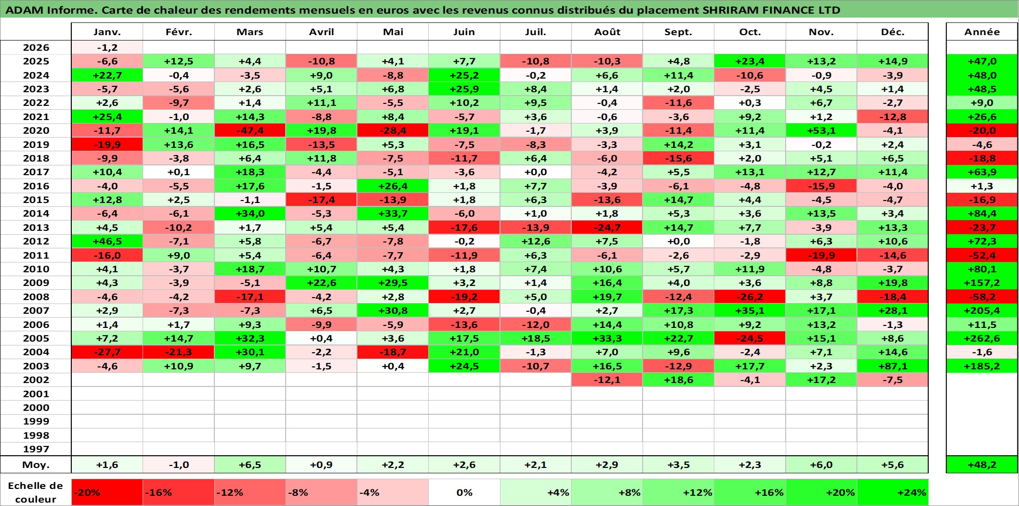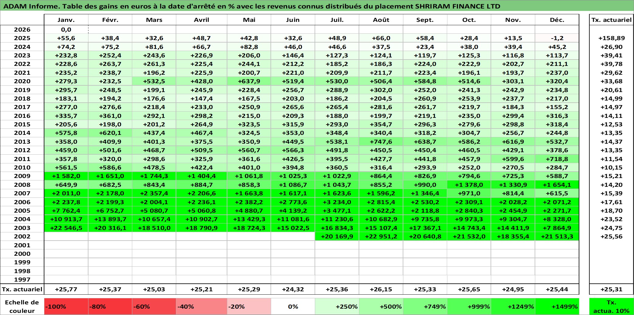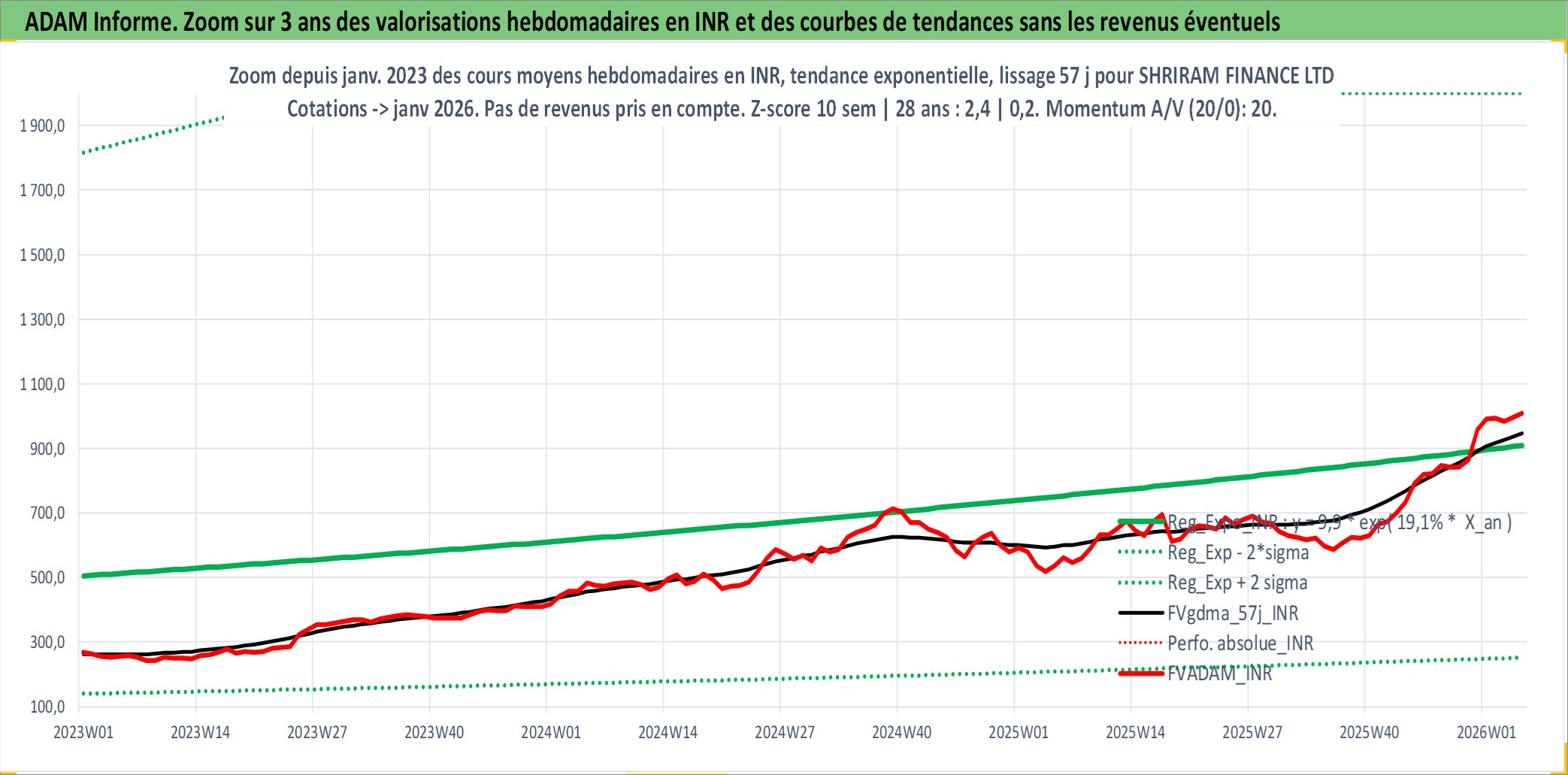 Site dédié aux investisseursPage dédiée sur site financeAnalyse des valorisations hebdomadaires de l'action SHRIRAM FINANCE LTD. Cet actif est cote en INR. Les valorisations sont en contrevaleur EURO et couvrent les semaines 2002W27 a 2026W05. Les revenus de cet actif financier sont pris en compte depuis la semaine 2002W37. La note ESG de cet actif n'est pas connue.