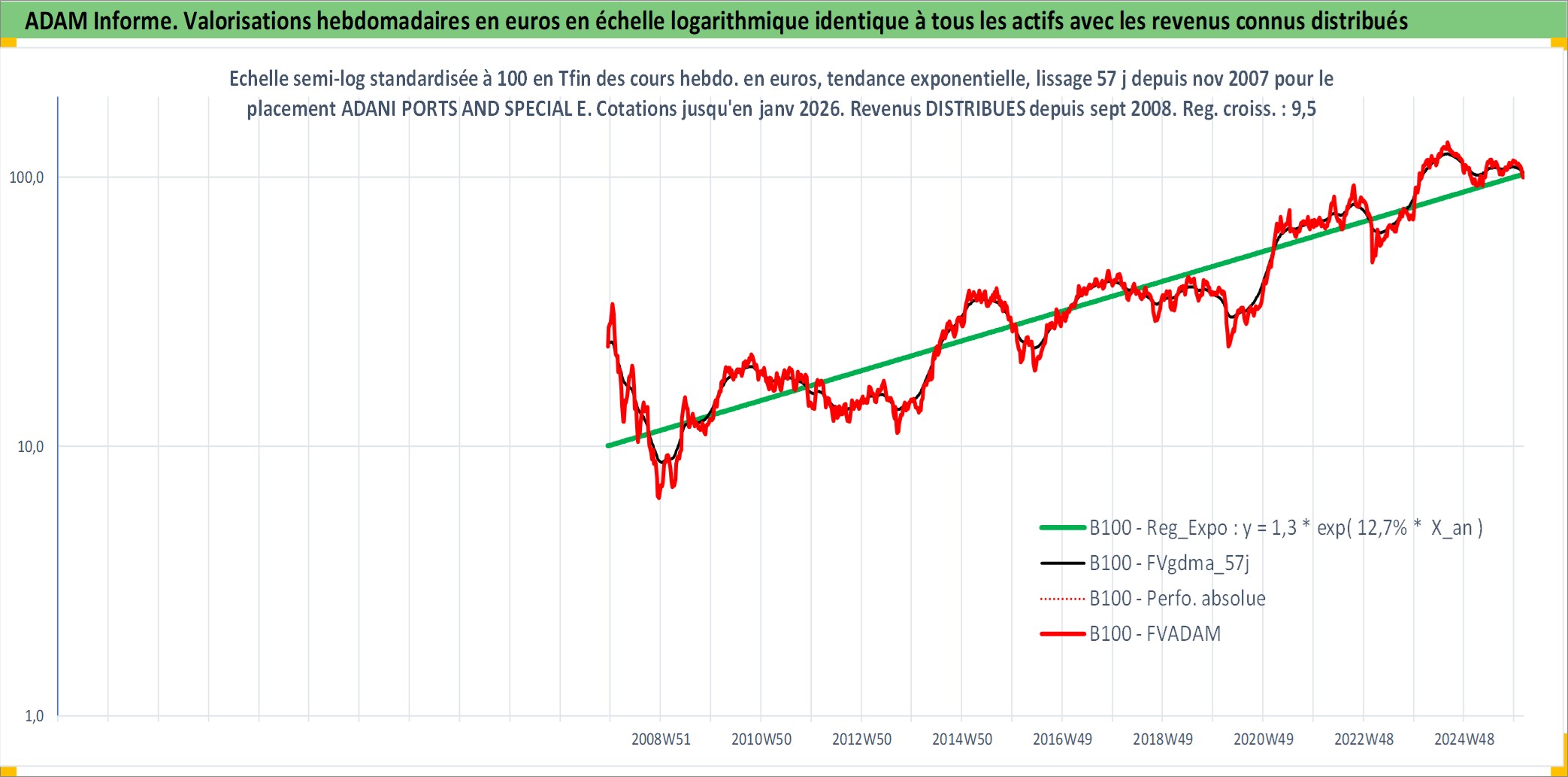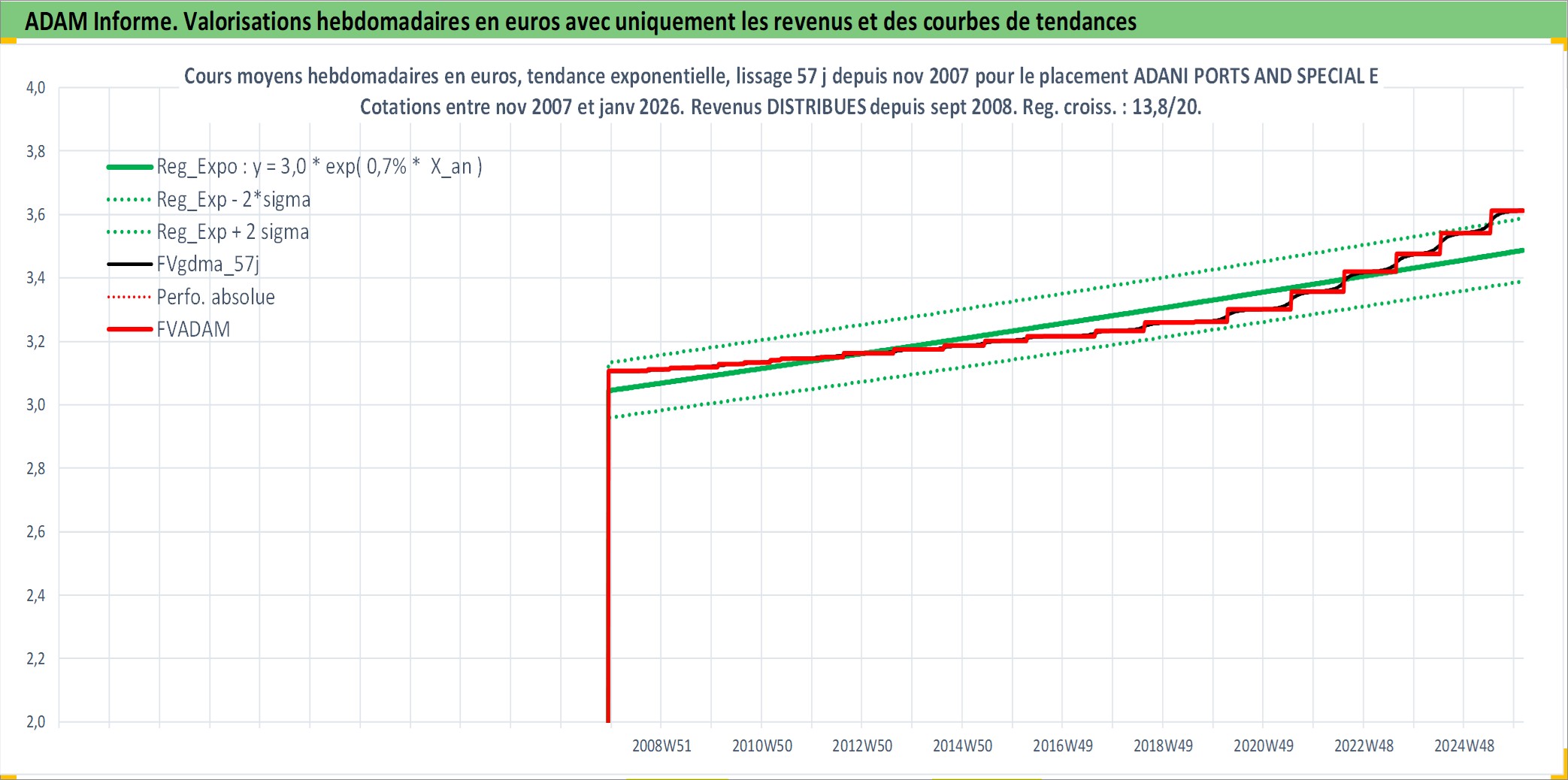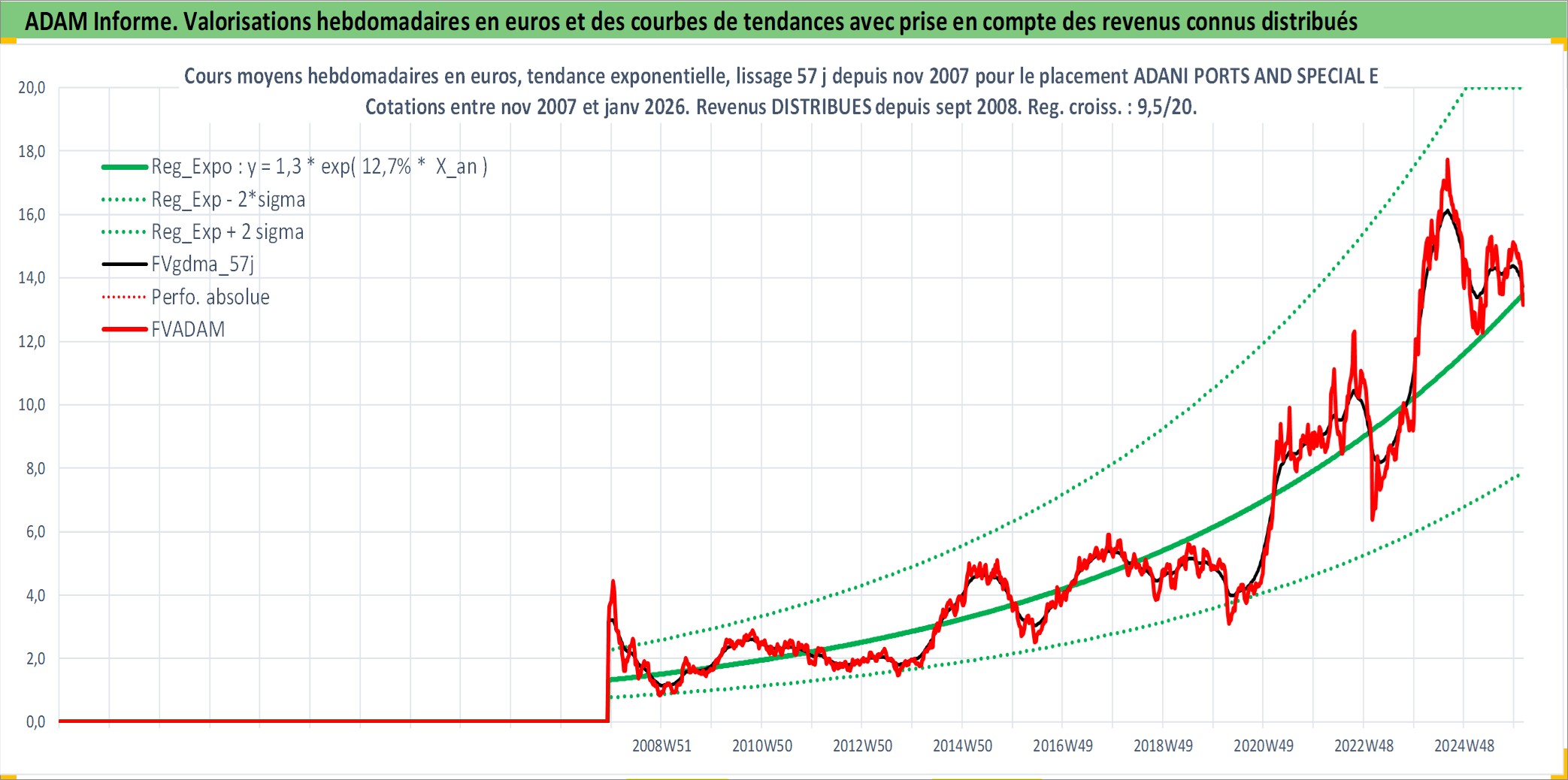 Site dédié aux investisseursPage dédiée sur site financeAnalyse des valorisations hebdomadaires de l'action ADANI PORTS AND SPECIAL ECONOMIC Z. Cet actif est cote en INR. Les valorisations sont en contrevaleur EURO et couvrent les semaines 2007W48 a 2026W05. Les revenus de cet actif financier sont pris en compte depuis la semaine 2008W37. La note globale ESG de cet actif est estimee a 15.0 (apres rebasage entre 0 et 20).