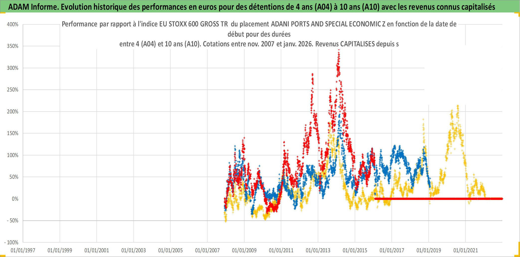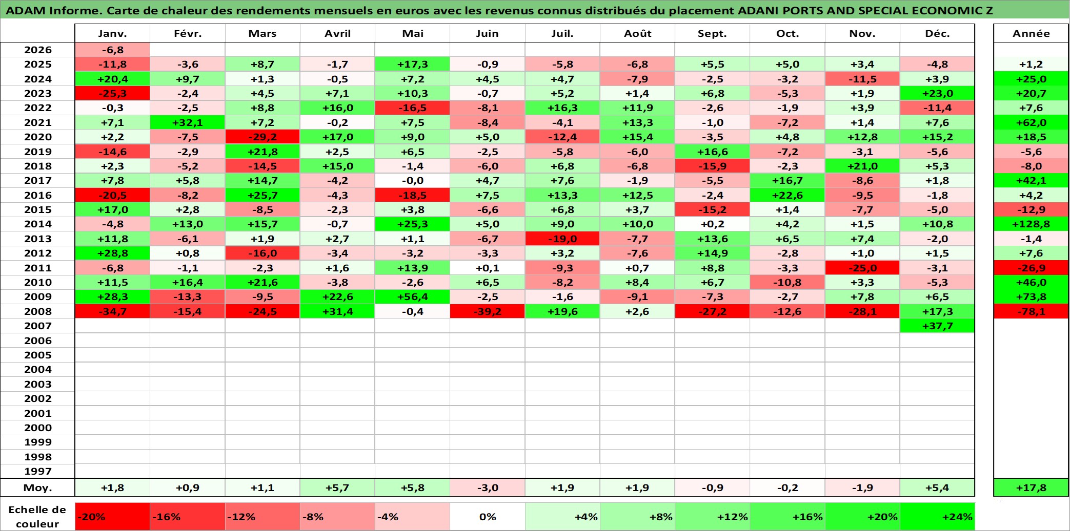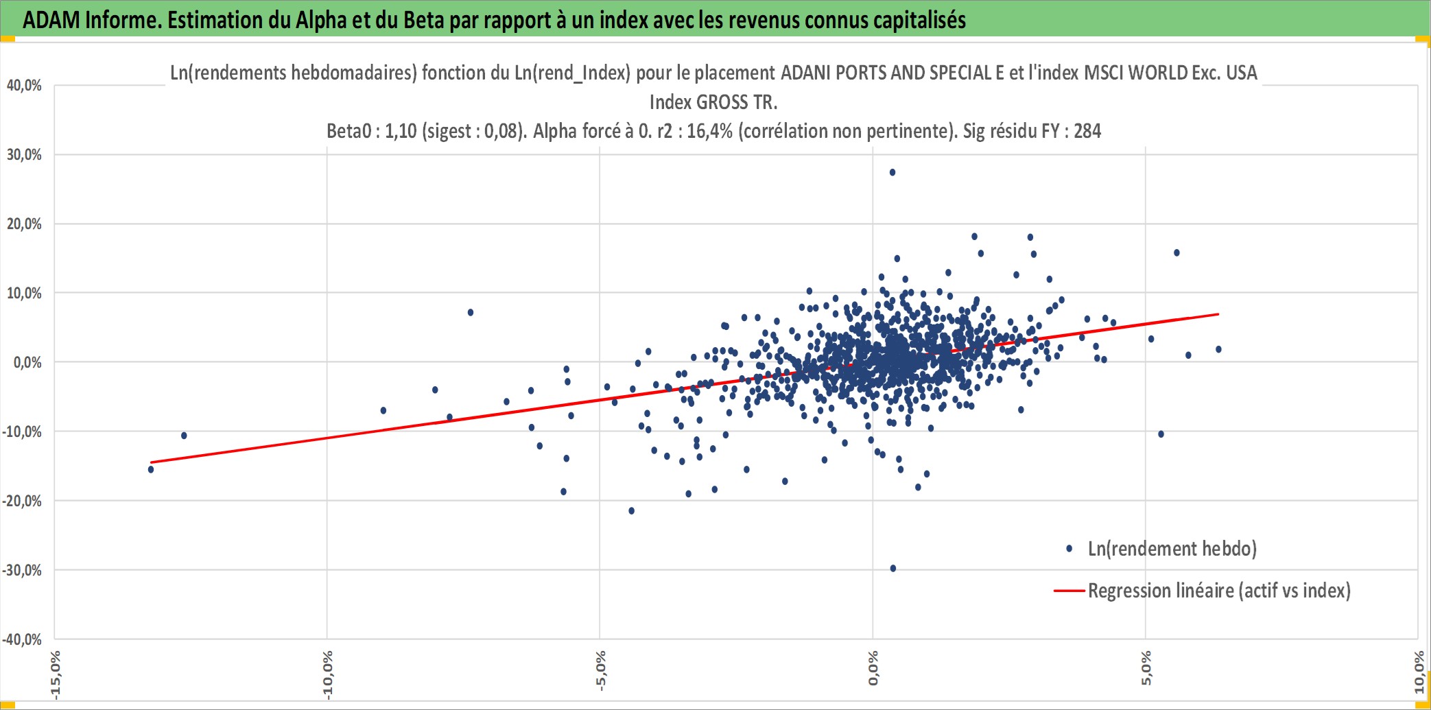 Site dédié aux investisseursPage dédiée sur site financeAnalyse des valorisations hebdomadaires de l'action ADANI PORTS AND SPECIAL ECONOMIC Z. Cet actif est cote en INR. Les valorisations sont en contrevaleur EURO et couvrent les semaines 2007W48 a 2026W05. Les revenus de cet actif financier sont pris en compte depuis la semaine 2008W37. La note globale ESG de cet actif est estimee a 15.0 (apres rebasage entre 0 et 20).