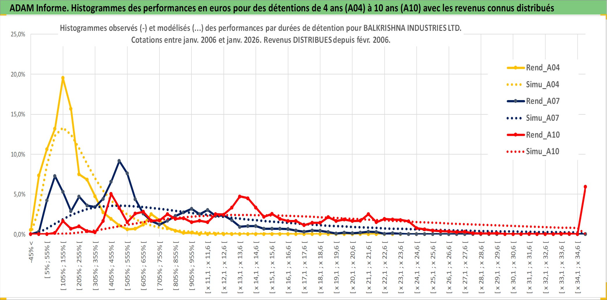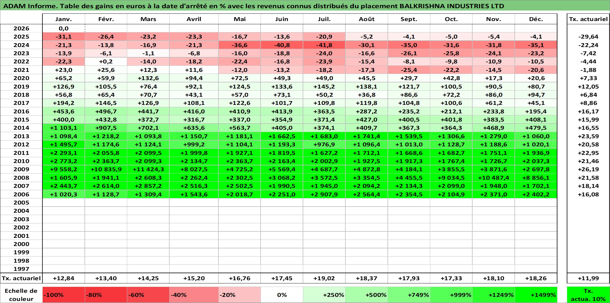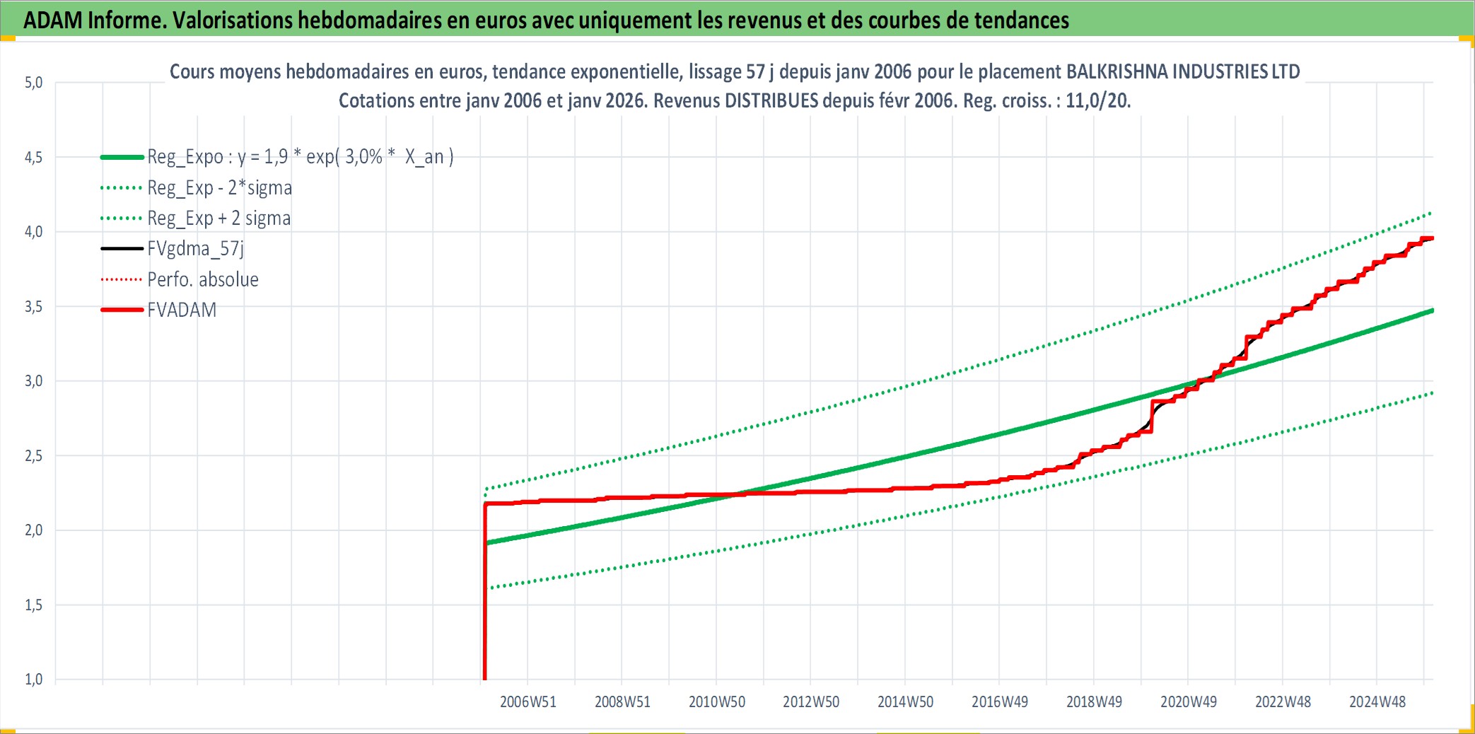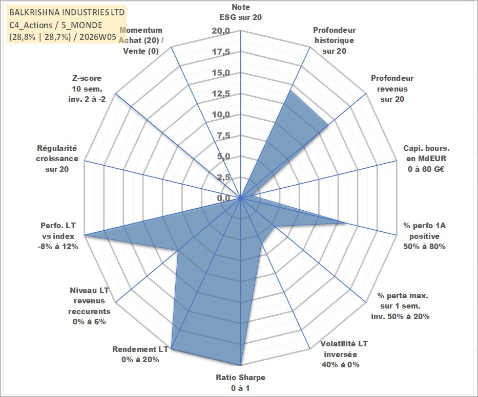 Site dédié aux investisseursPage dédiée sur site financeAnalyse des valorisations hebdomadaires de l'action BALKRISHNA INDUSTRIES LTD. Cet actif est cote en INR. Les valorisations sont en contrevaleur EURO et couvrent les semaines 2006W04 a 2026W05. Les revenus de cet actif financier sont pris en compte depuis la semaine 2006W06. La note ESG de cet actif n'est pas connue.