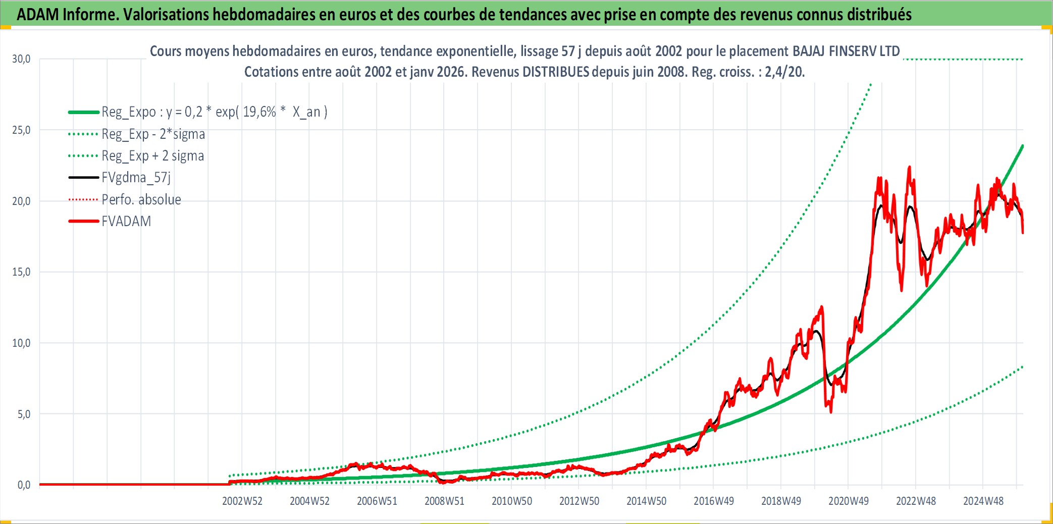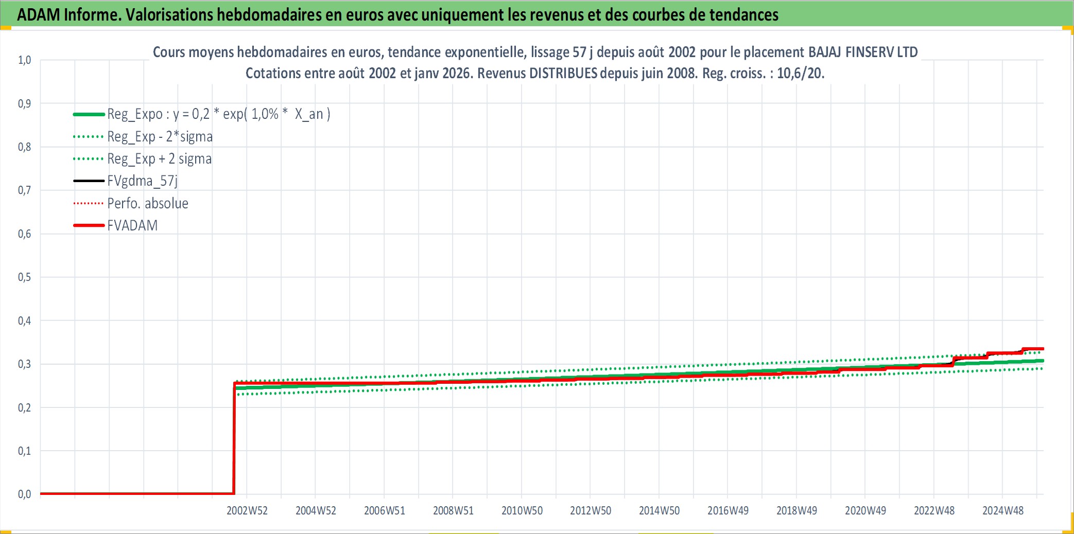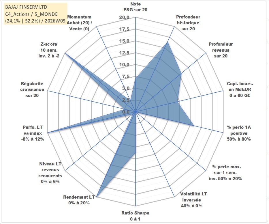 Site dédié aux investisseursPage dédiée sur site financeAnalyse des valorisations hebdomadaires de l'action BAJAJ FINSERV LTD. Cet actif est cote en INR. Les valorisations sont en contrevaleur EURO et couvrent les semaines 2002W33 a 2026W05. Les revenus de cet actif financier sont pris en compte depuis la semaine 2008W26. La note globale ESG de cet actif est estimee a 7.0 (apres rebasage entre 0 et 20).