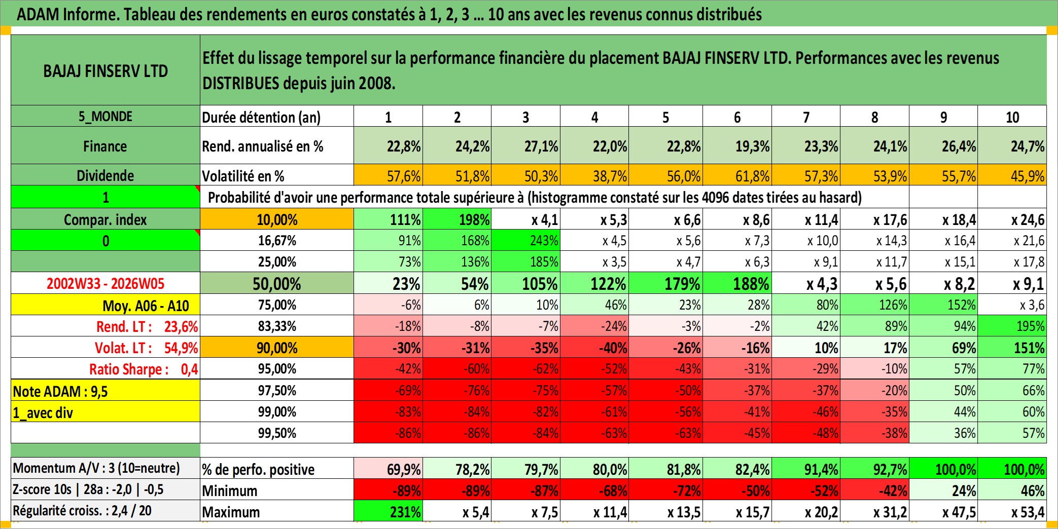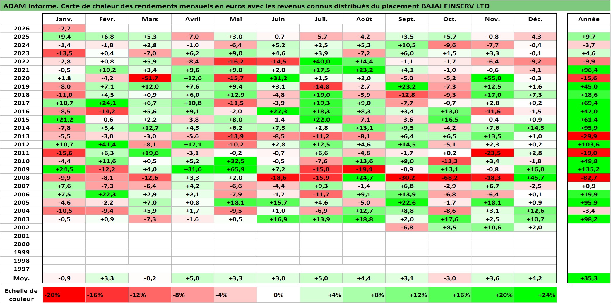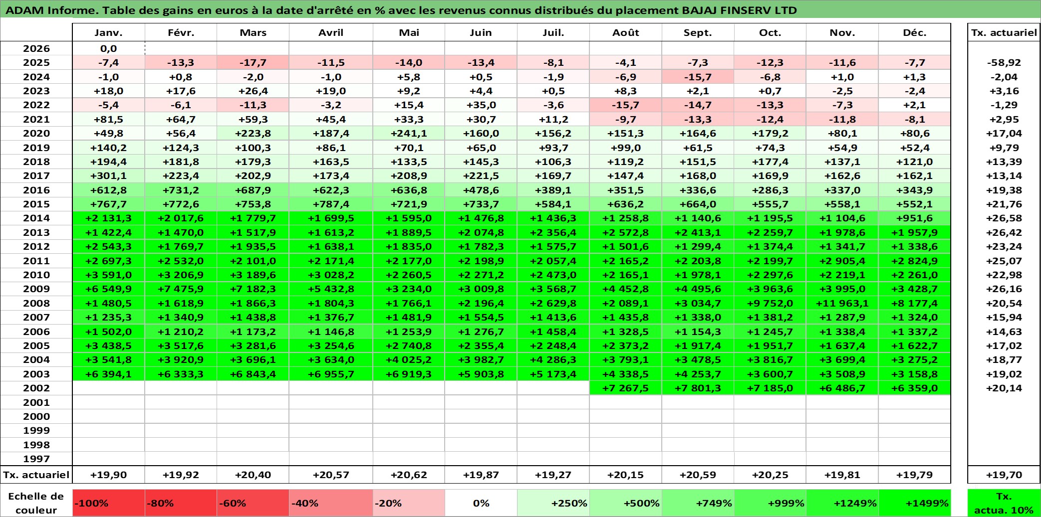 Site dédié aux investisseursPage dédiée sur site financeAnalyse des valorisations hebdomadaires de l'action BAJAJ FINSERV LTD. Cet actif est cote en INR. Les valorisations sont en contrevaleur EURO et couvrent les semaines 2002W33 a 2026W05. Les revenus de cet actif financier sont pris en compte depuis la semaine 2008W26. La note globale ESG de cet actif est estimee a 7.0 (apres rebasage entre 0 et 20).