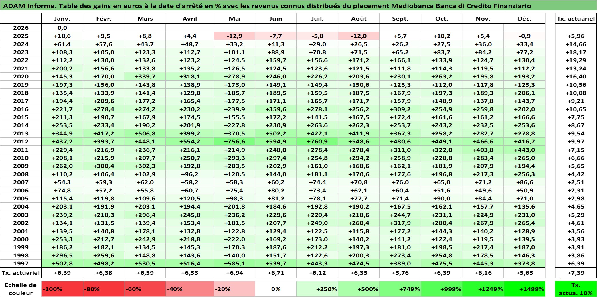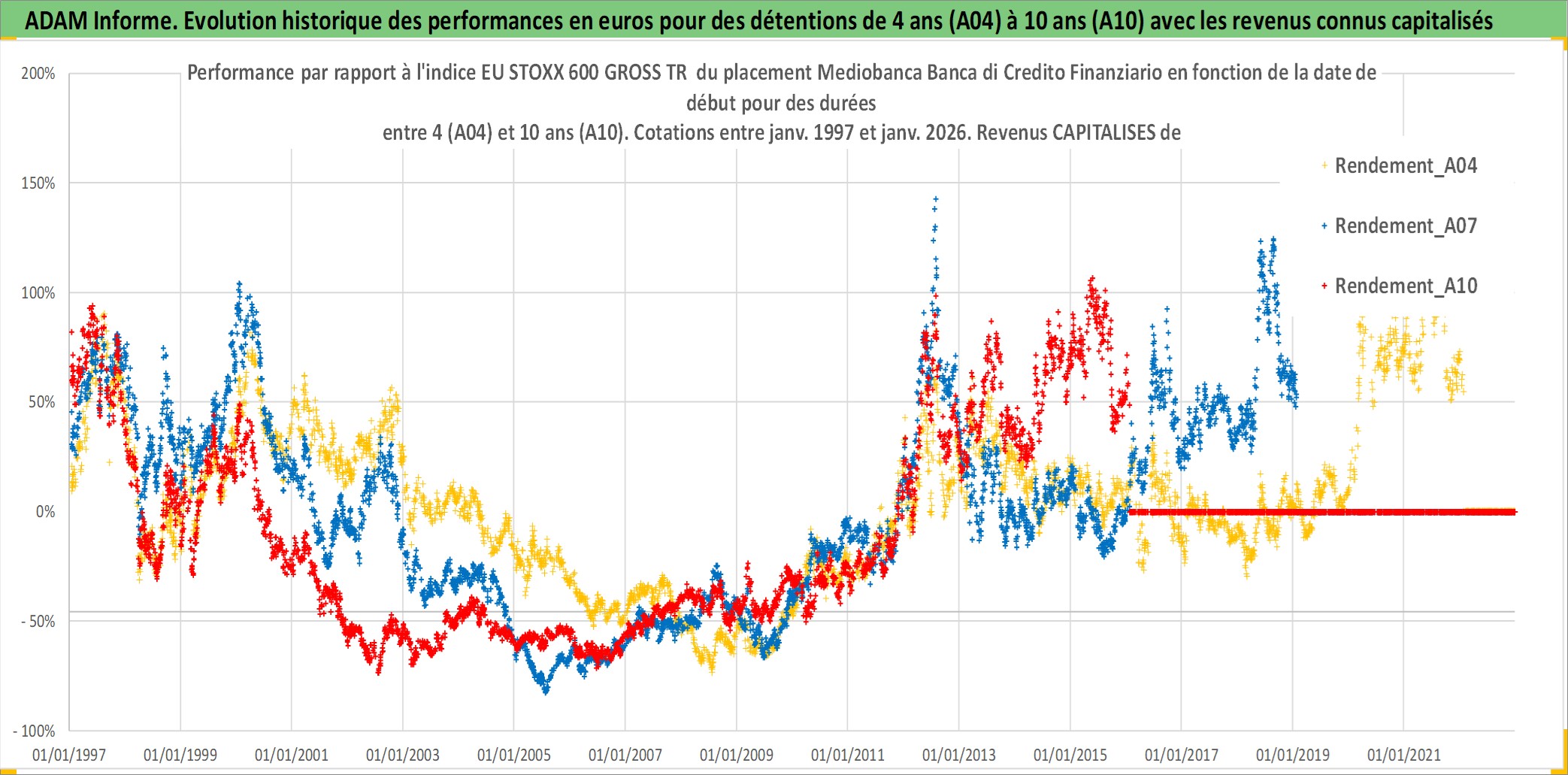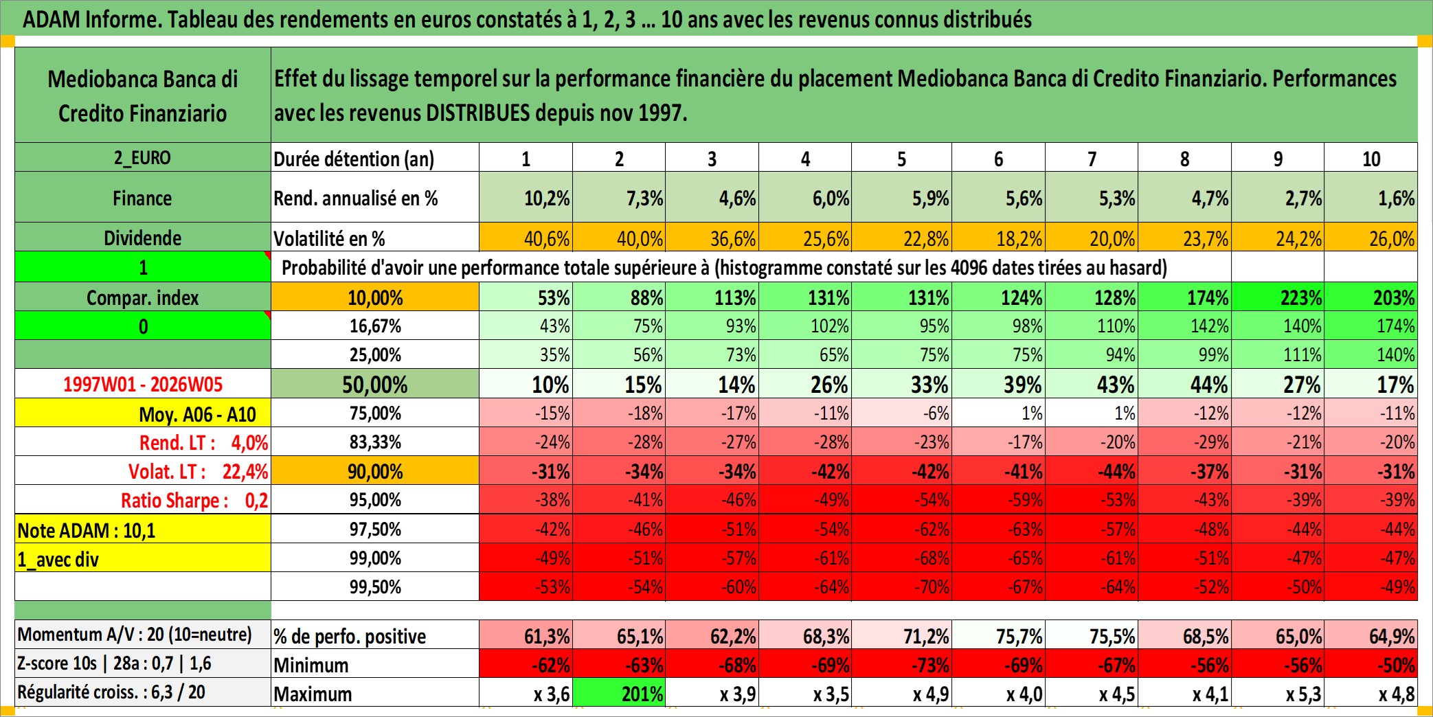 Site dédié aux investisseursPage dédiée sur site financeAnalyse des valorisations hebdomadaires de l'action Mediobanca Banca di Credito Finanziario. Cet actif est cote en EUR. Les valorisations couvrent les semaines 1997W01 a 2026W05. Les revenus de cet actif financier sont pris en compte depuis la semaine 1997W48. La note globale ESG de cet actif est estimee a 14.0 (apres rebasage entre 0 et 20).