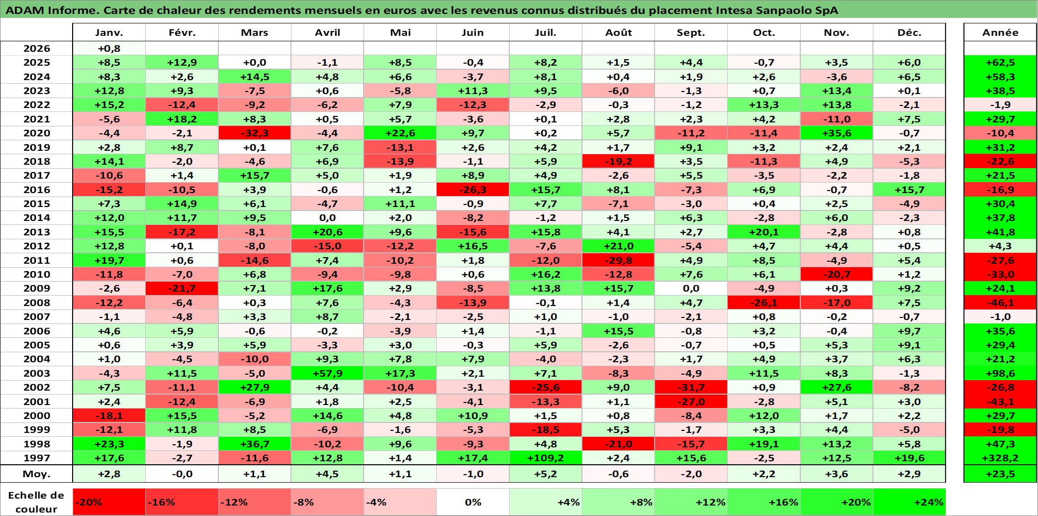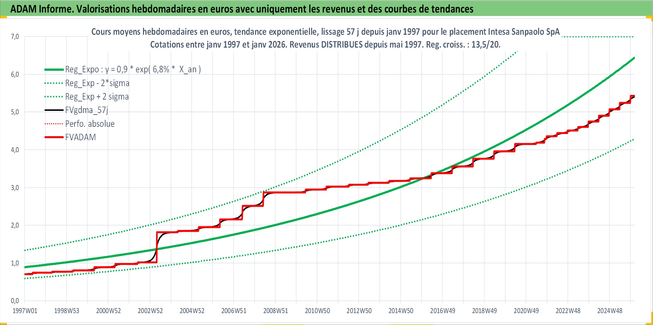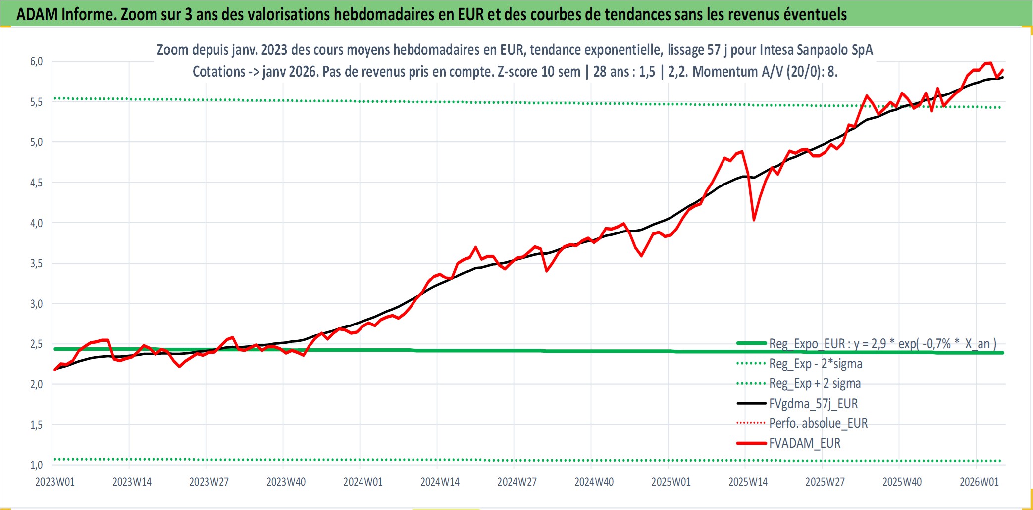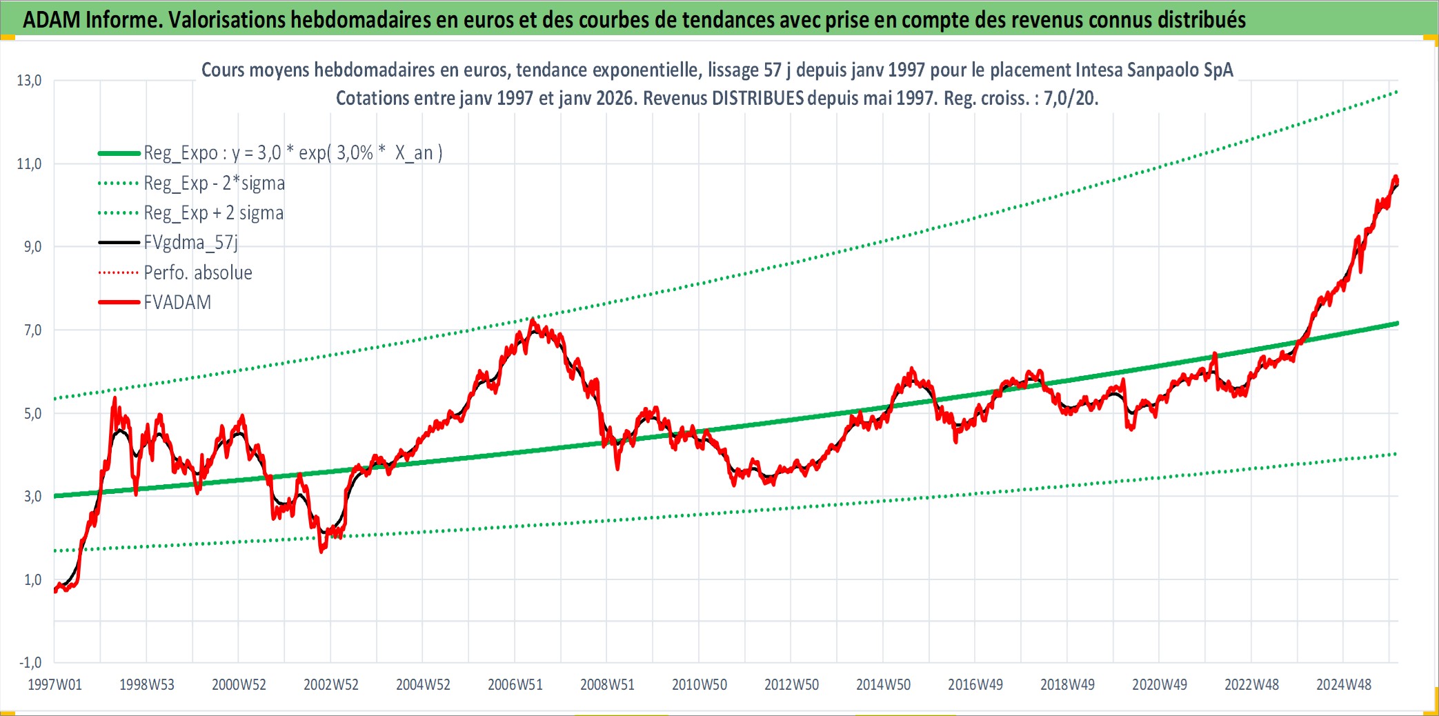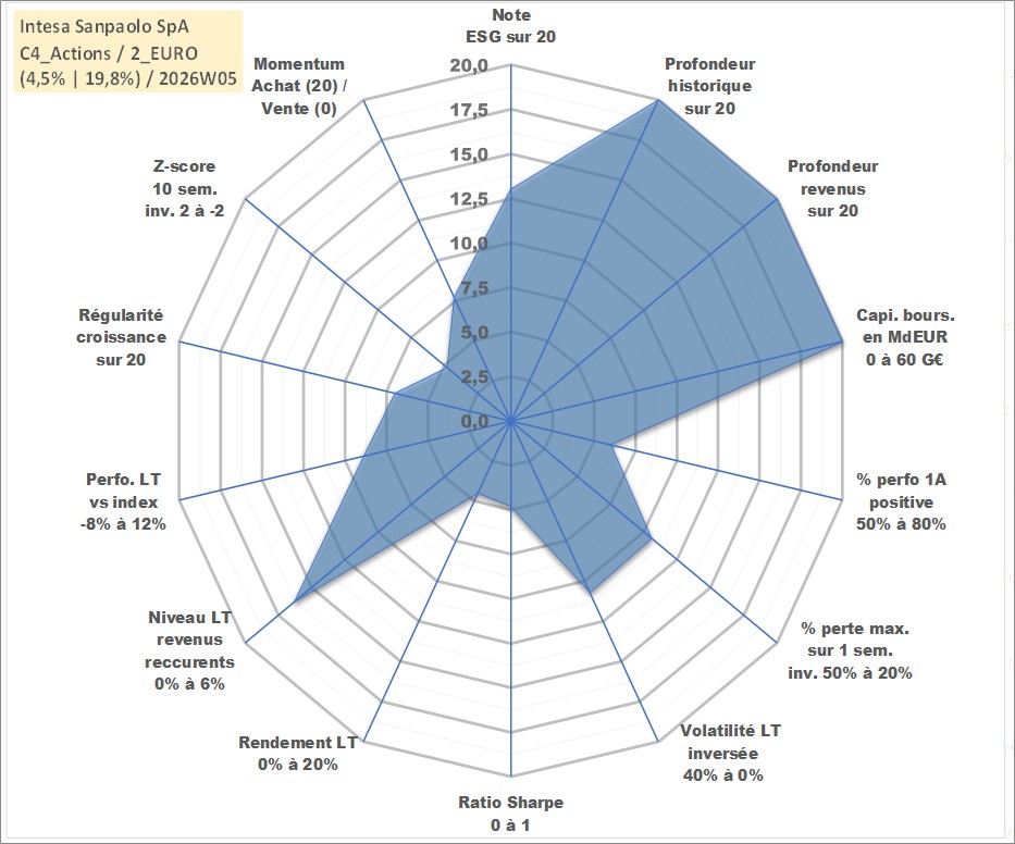 Site dédié aux investisseursPage dédiée sur site financeAnalyse des valorisations hebdomadaires de l'action Intesa Sanpaolo SpA. Cet actif est cote en EUR. Les valorisations couvrent les semaines 1997W01 a 2026W05. Les revenus de cet actif financier sont pris en compte depuis la semaine 1997W21. La note globale ESG de cet actif est estimee a 13.0 (apres rebasage entre 0 et 20).