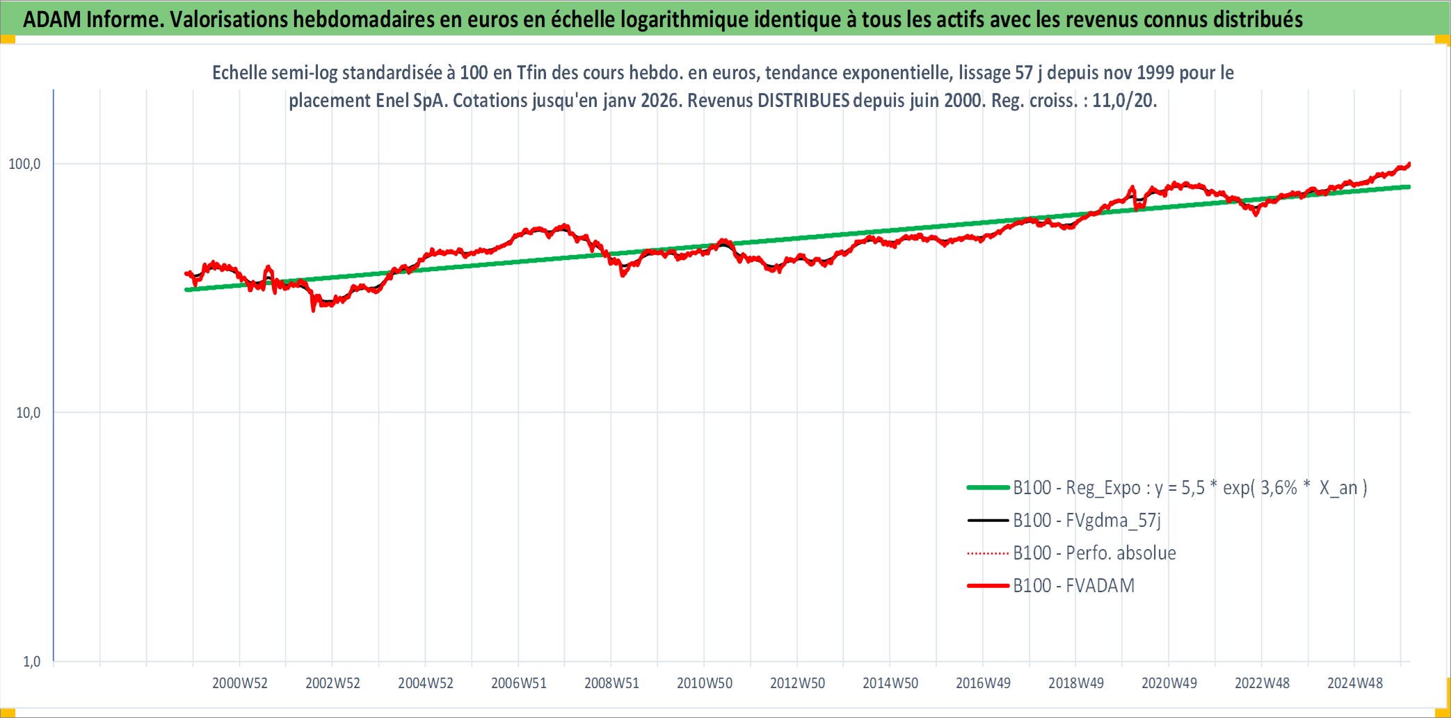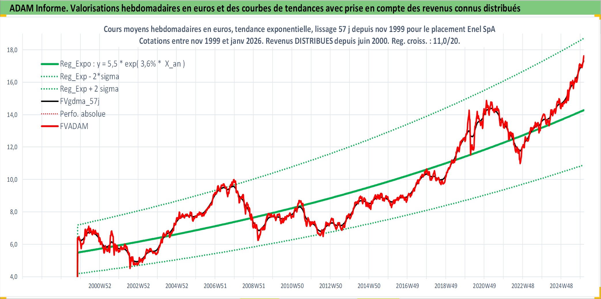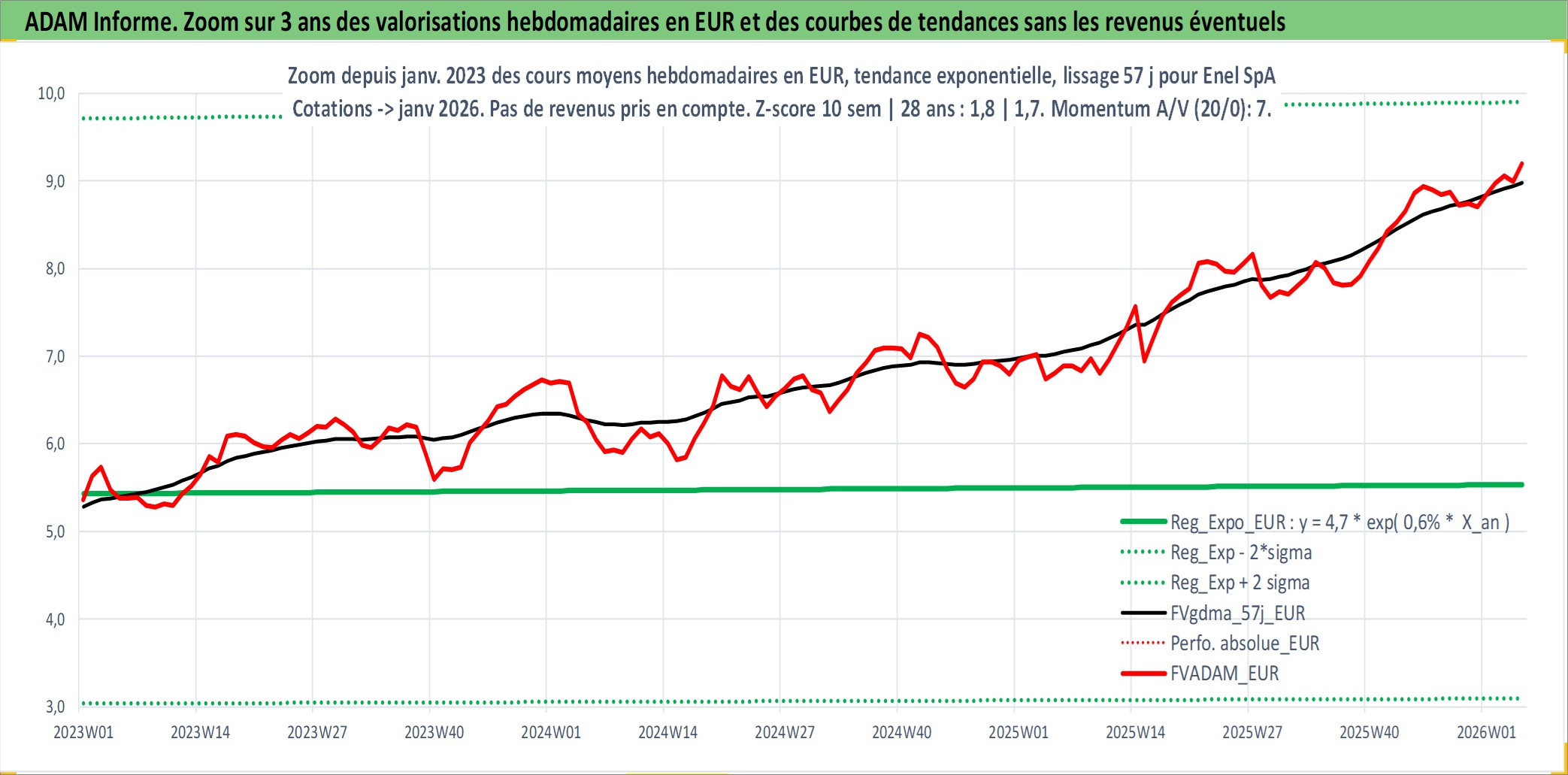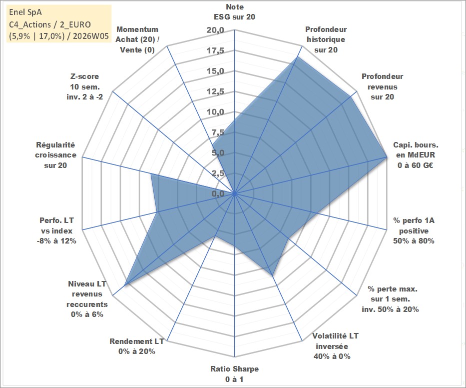 Site dédié aux investisseursPage dédiée sur site financeAnalyse des valorisations hebdomadaires de l'action Enel SpA. Cet actif est cote en EUR. Les valorisations couvrent les semaines 1999W44 a 2026W05. Les revenus de cet actif financier sont pris en compte depuis la semaine 2000W25. La note globale ESG de cet actif est estimee a 9.0 (apres rebasage entre 0 et 20).