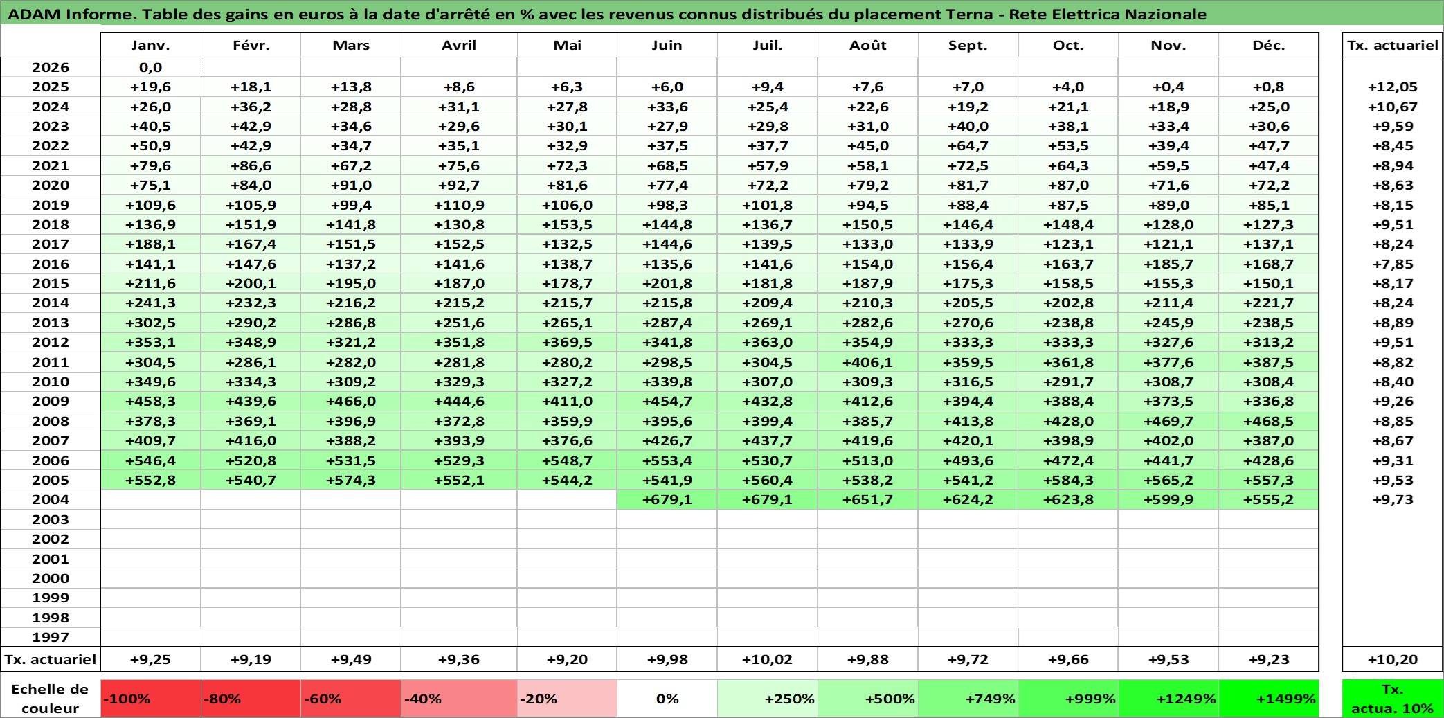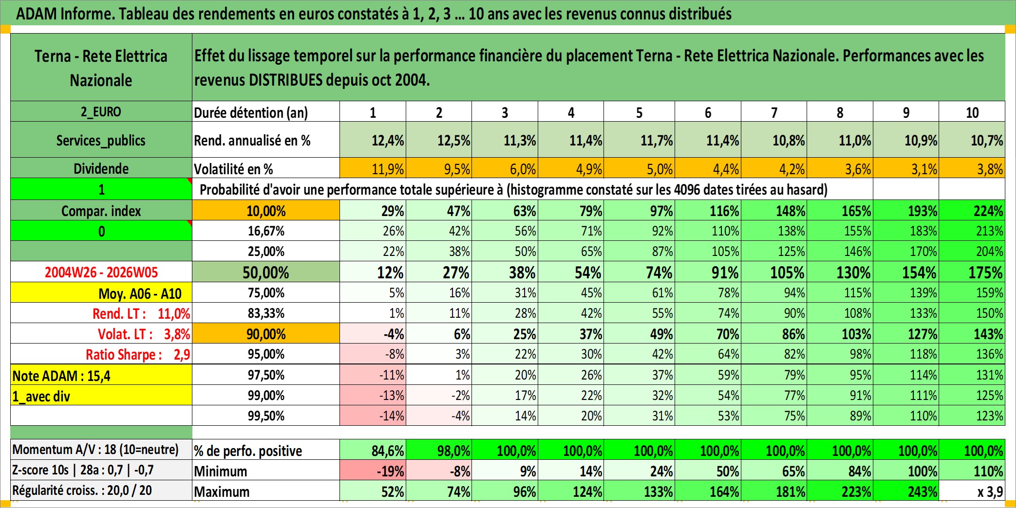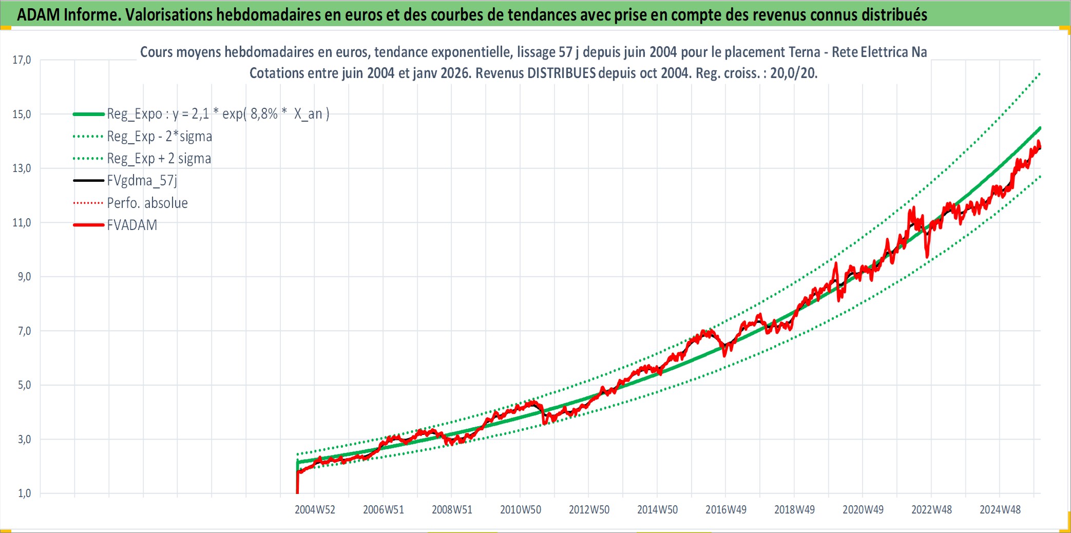 Site dédié aux investisseursPage dédiée sur site financeAnalyse des valorisations hebdomadaires de l'action Terna - Rete Elettrica Nazionale. Cet actif est cote en EUR. Les valorisations couvrent les semaines 2004W26 a 2026W05. Les revenus de cet actif financier sont pris en compte depuis la semaine 2004W43. La note globale ESG de cet actif est estimee a 18.0 (apres rebasage entre 0 et 20).