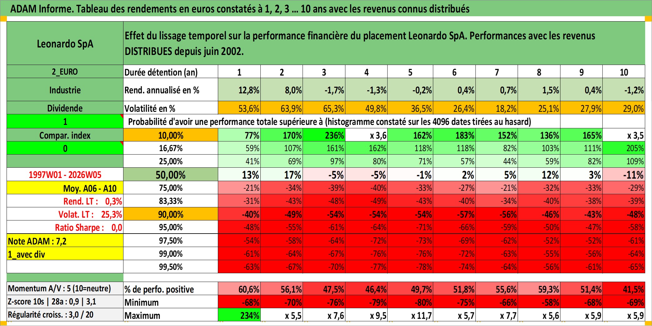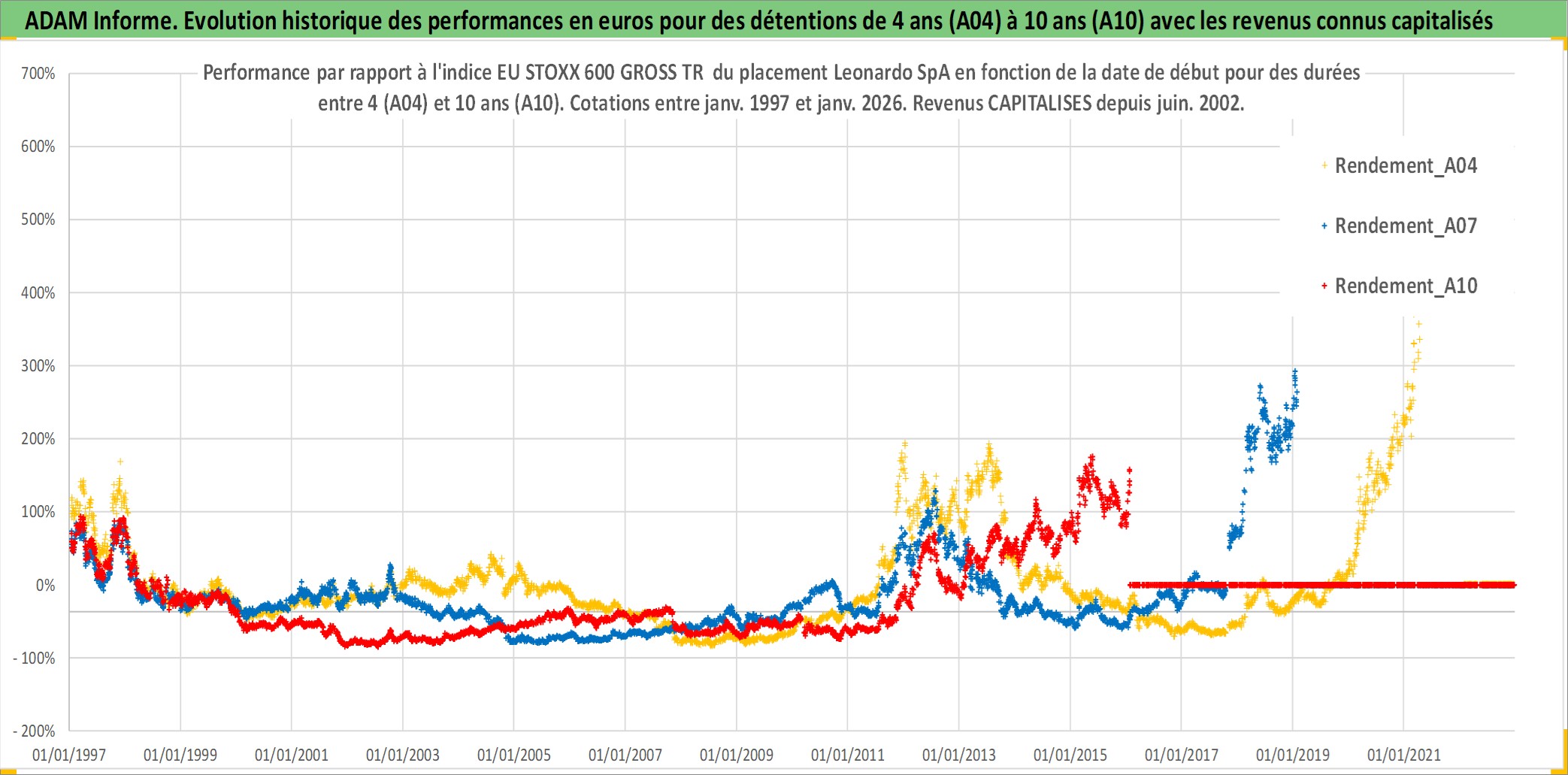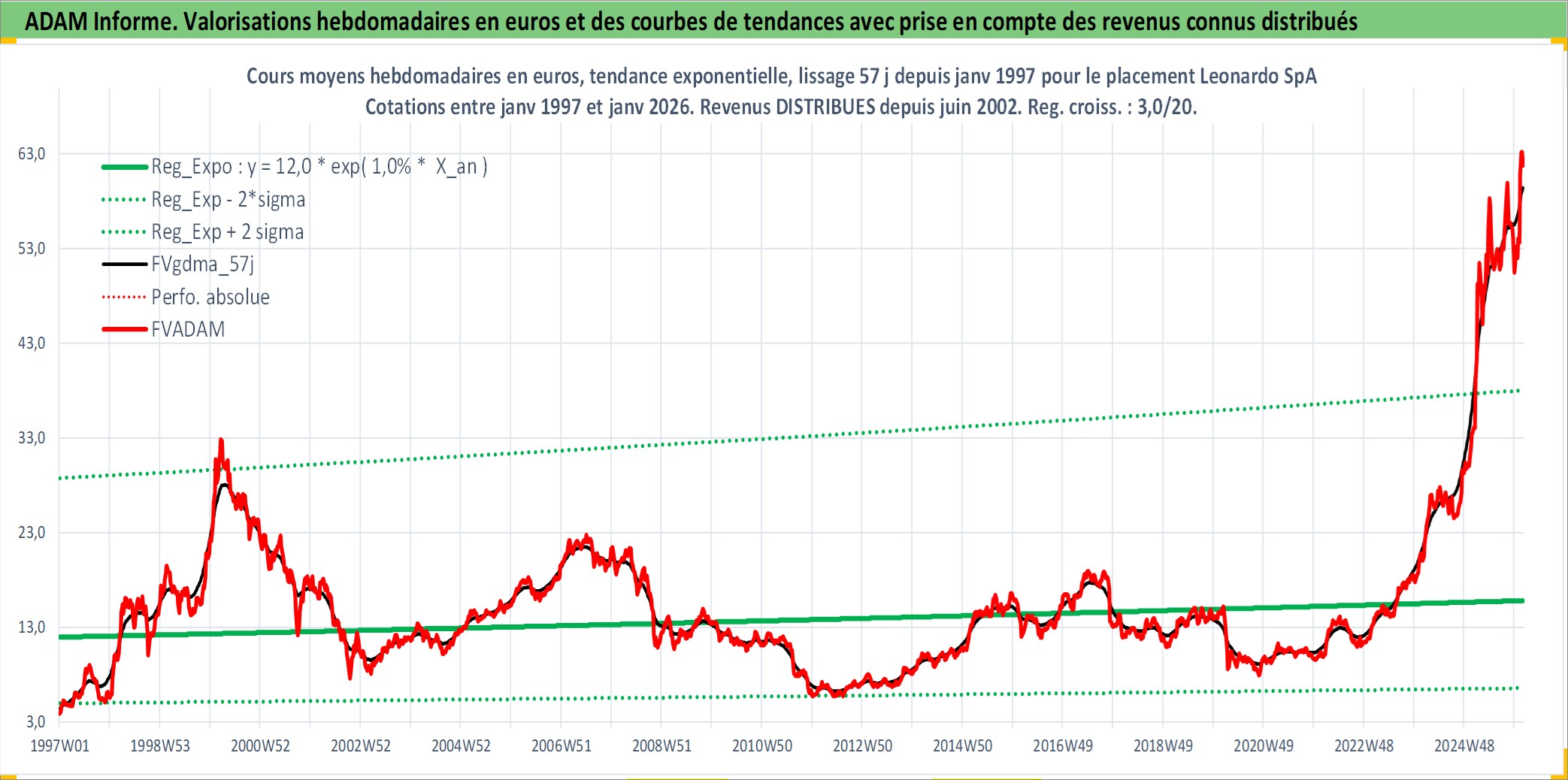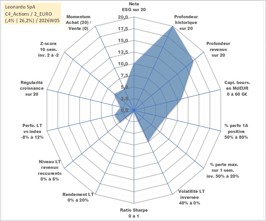 Site dédié aux investisseursPage dédiée sur site financeAnalyse des valorisations hebdomadaires de l'action Leonardo SpA. Cet actif est cote en EUR. Les valorisations couvrent les semaines 1997W01 a 2026W05. Les revenus de cet actif financier sont pris en compte depuis la semaine 2002W26. La note globale ESG de cet actif est estimee a 10.0 (apres rebasage entre 0 et 20).