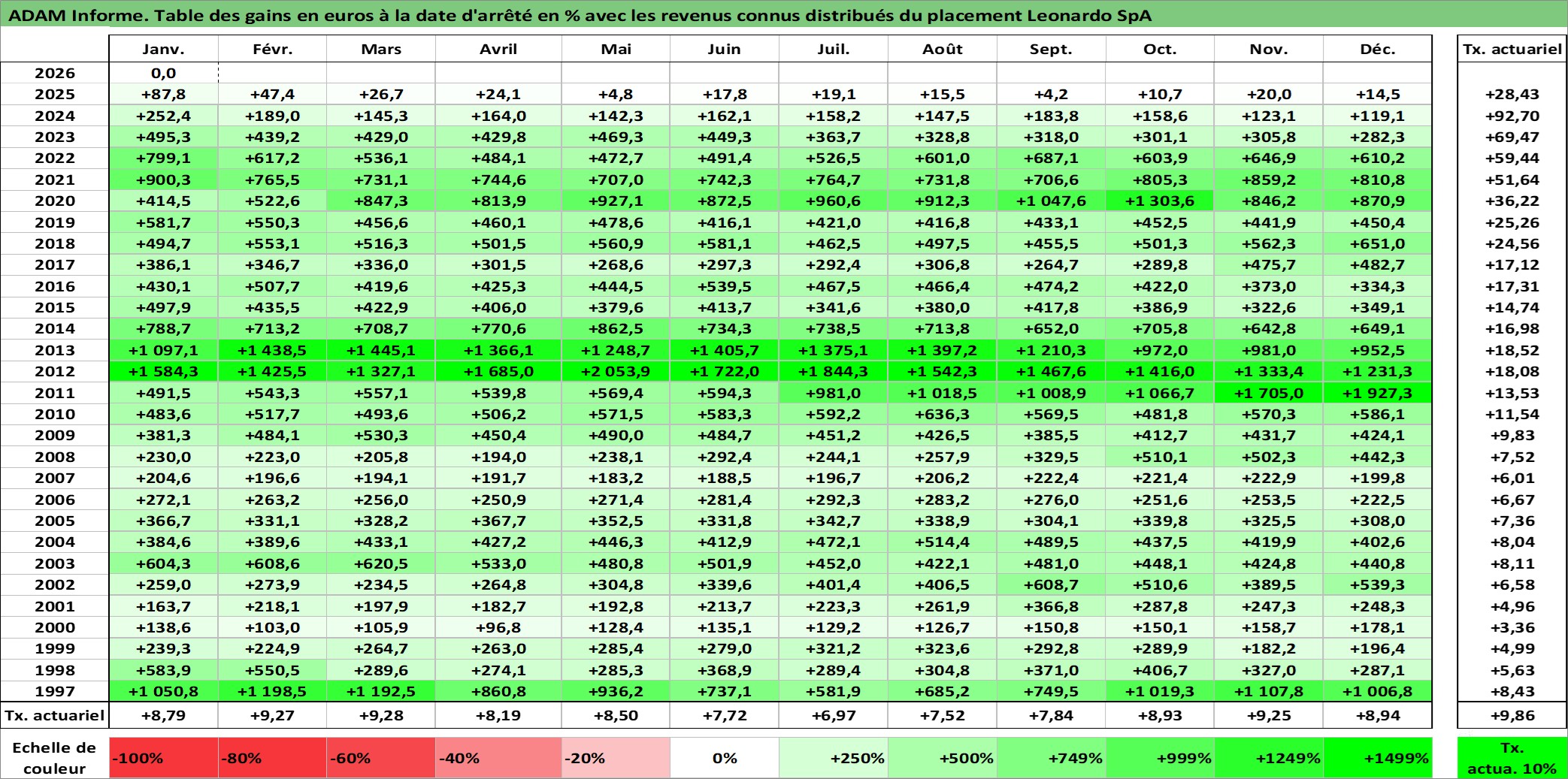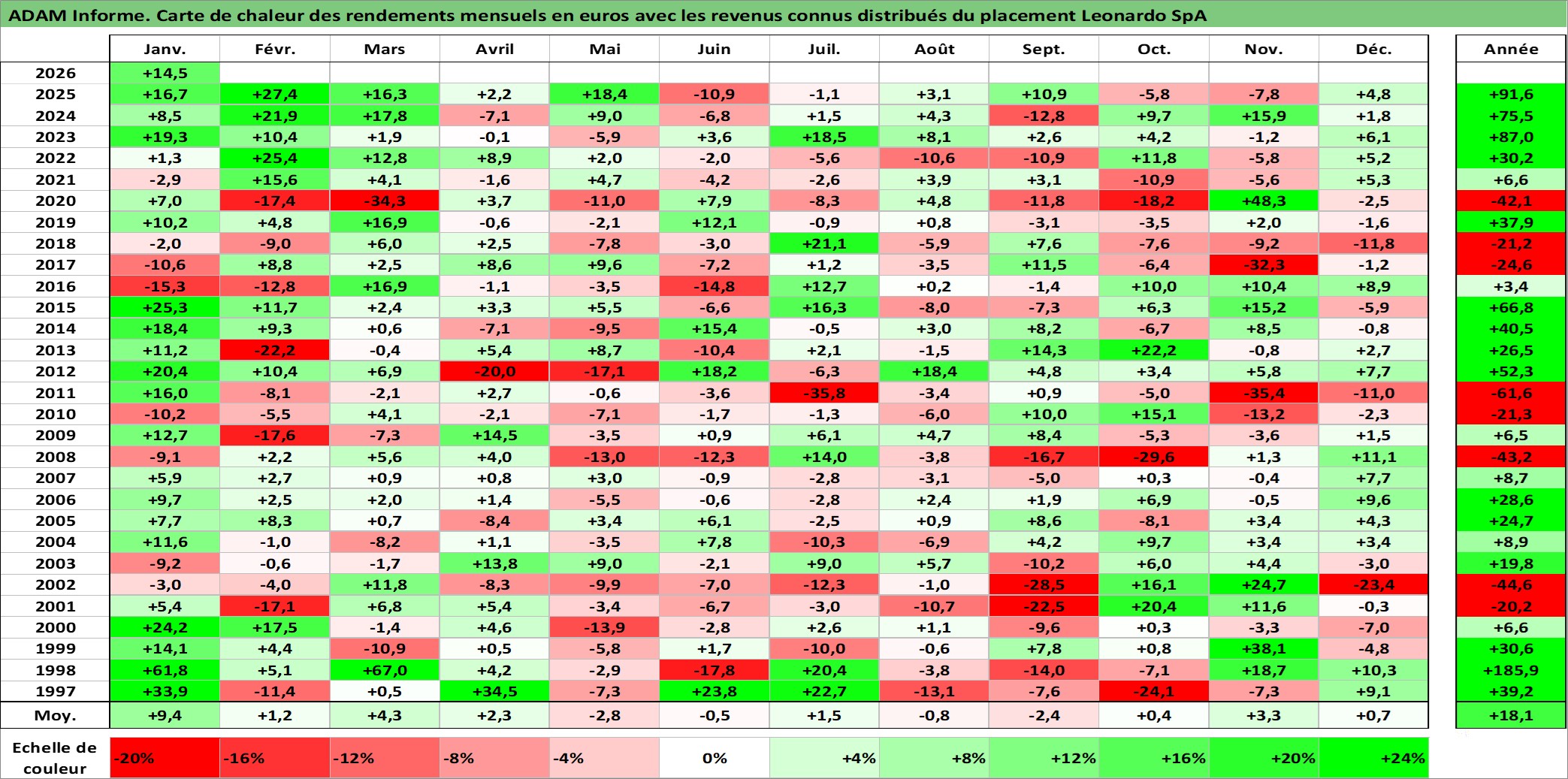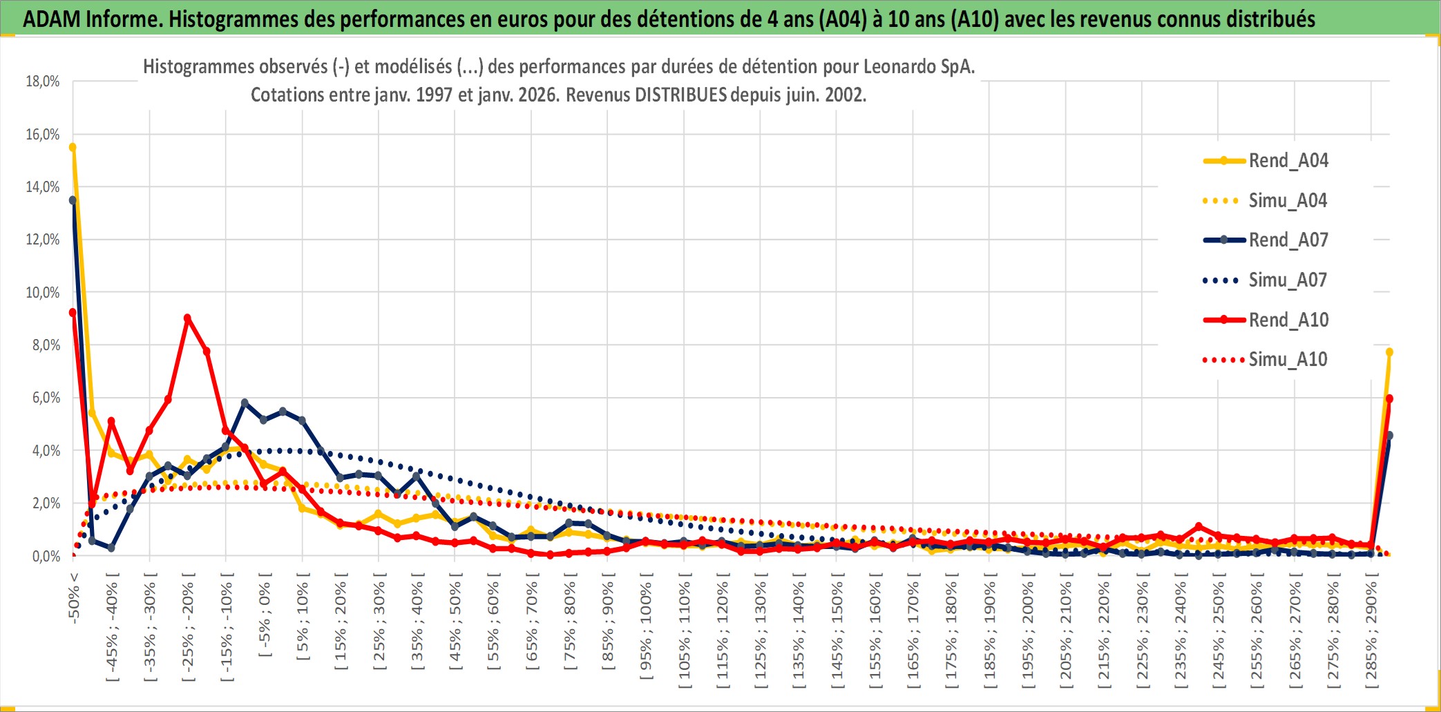 Site dédié aux investisseursPage dédiée sur site financeAnalyse des valorisations hebdomadaires de l'action Leonardo SpA. Cet actif est cote en EUR. Les valorisations couvrent les semaines 1997W01 a 2026W05. Les revenus de cet actif financier sont pris en compte depuis la semaine 2002W26. La note globale ESG de cet actif est estimee a 10.0 (apres rebasage entre 0 et 20).