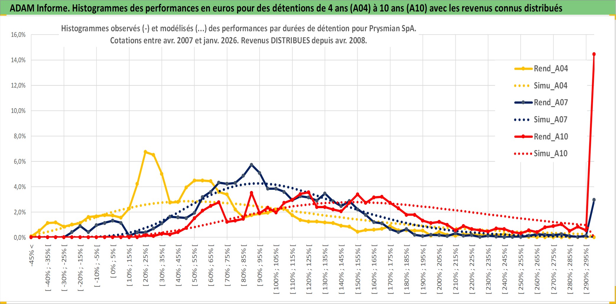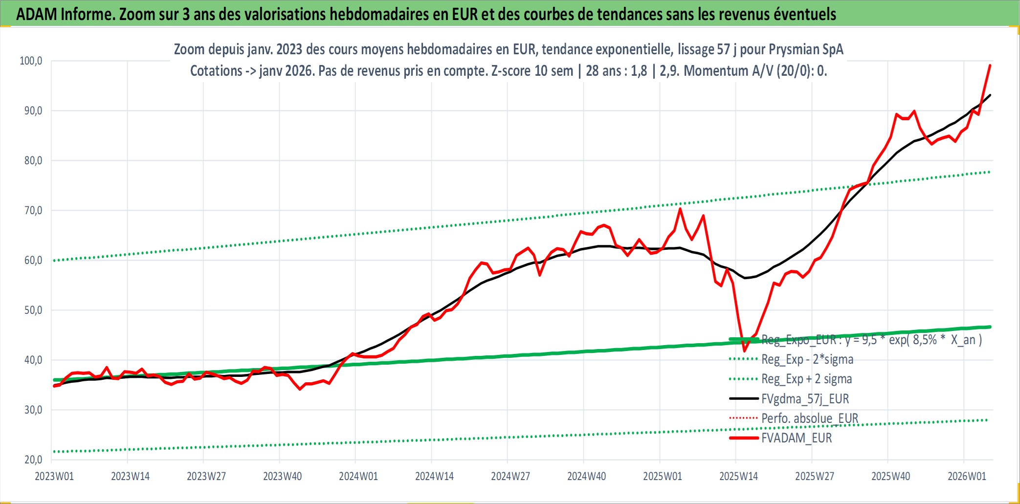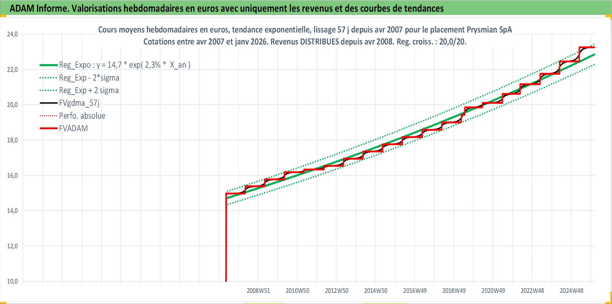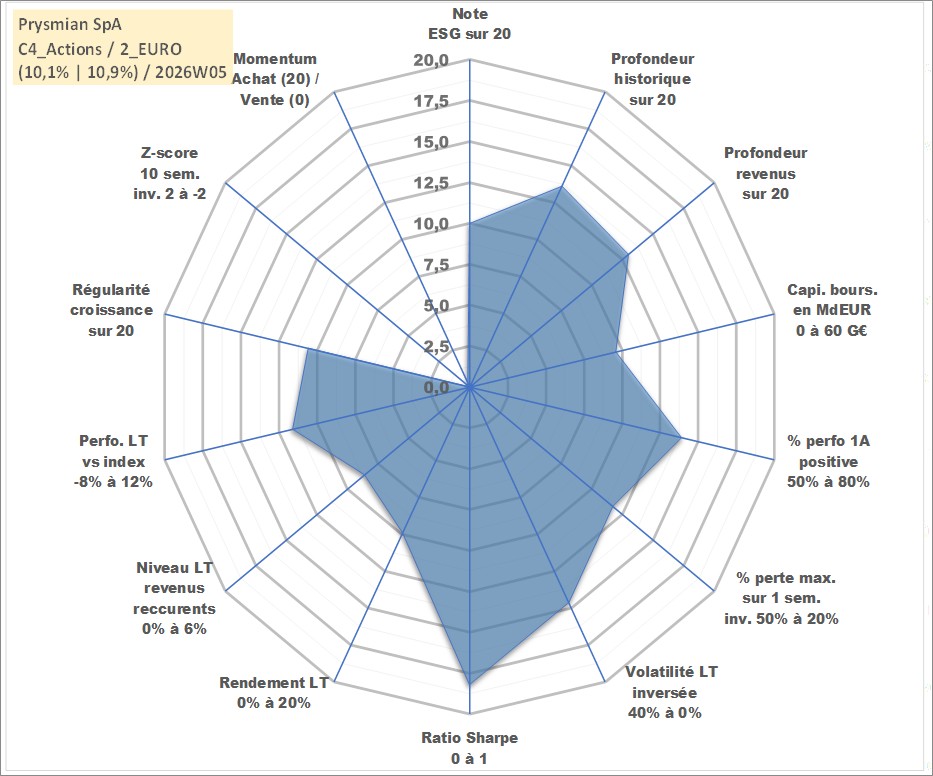 Site dédié aux investisseursPage dédiée sur site financeAnalyse des valorisations hebdomadaires de l'action Prysmian SpA. Cet actif est cote en EUR. Les valorisations couvrent les semaines 2007W18 a 2026W05. Les revenus de cet actif financier sont pris en compte depuis la semaine 2008W17. La note globale ESG de cet actif est estimee a 10.0 (apres rebasage entre 0 et 20).
