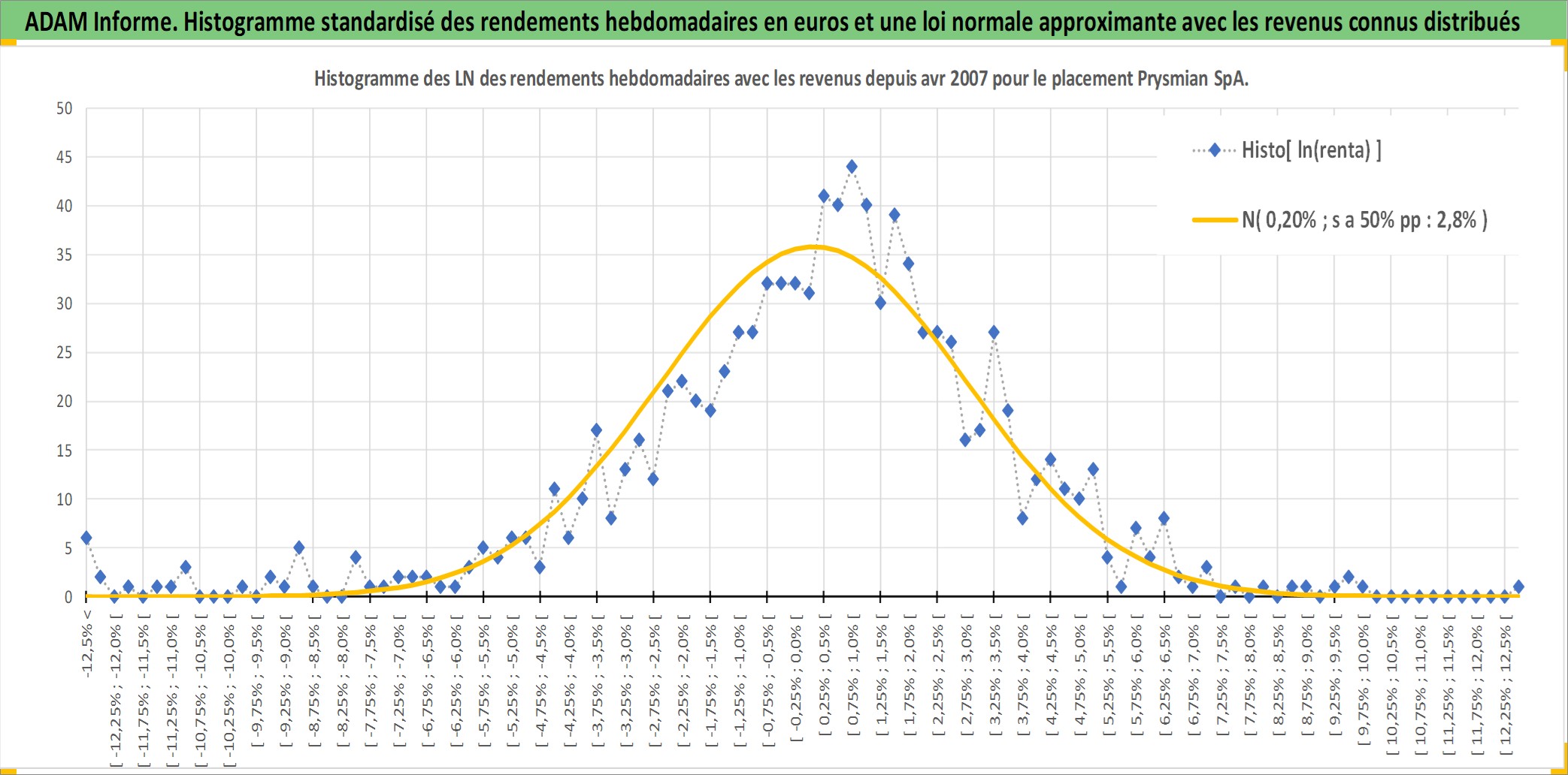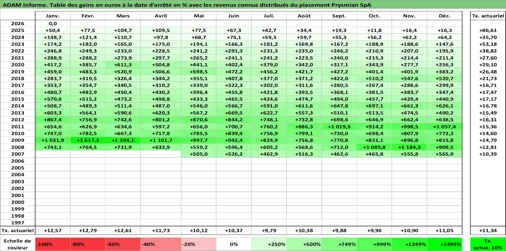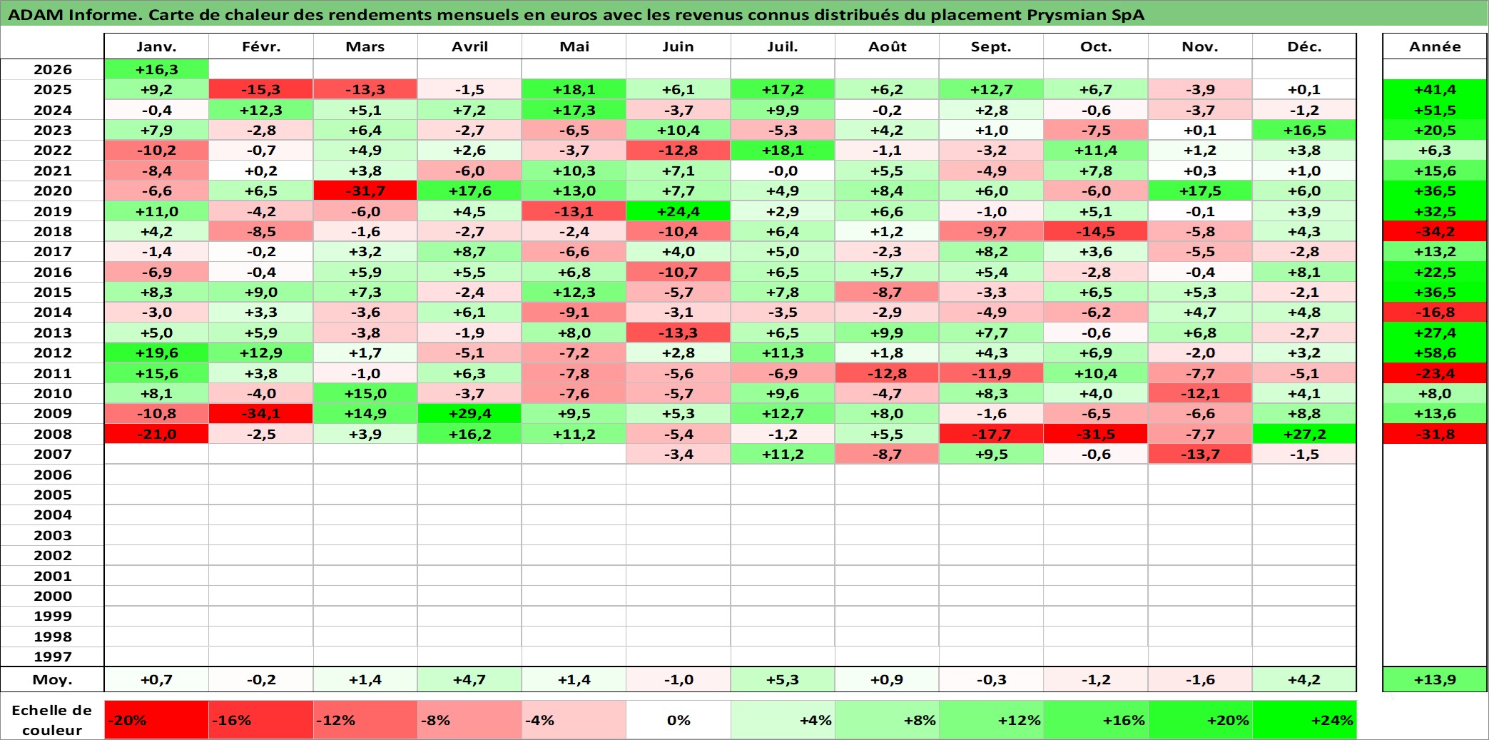 Site dédié aux investisseursPage dédiée sur site financeAnalyse des valorisations hebdomadaires de l'action Prysmian SpA. Cet actif est cote en EUR. Les valorisations couvrent les semaines 2007W18 a 2026W05. Les revenus de cet actif financier sont pris en compte depuis la semaine 2008W17. La note globale ESG de cet actif est estimee a 10.0 (apres rebasage entre 0 et 20).