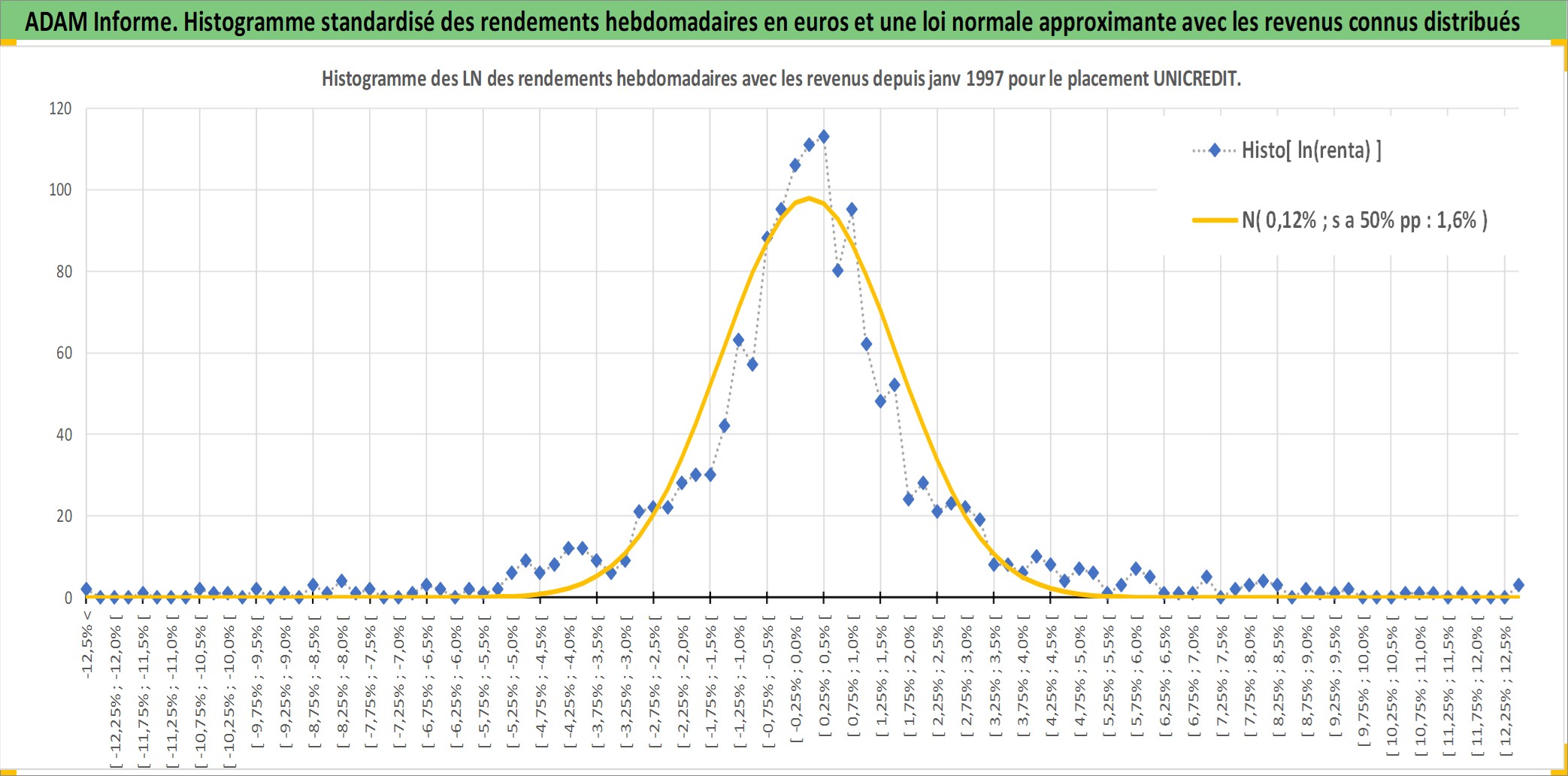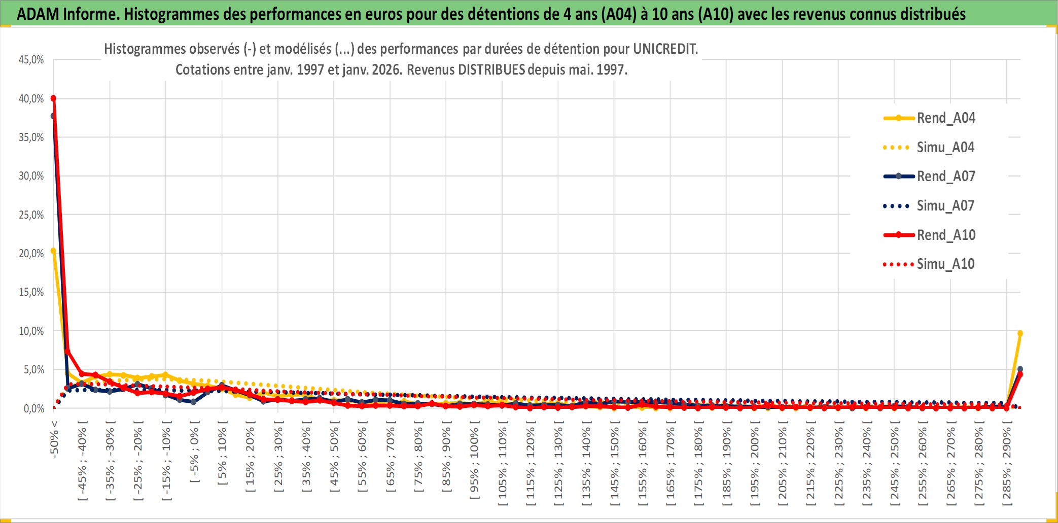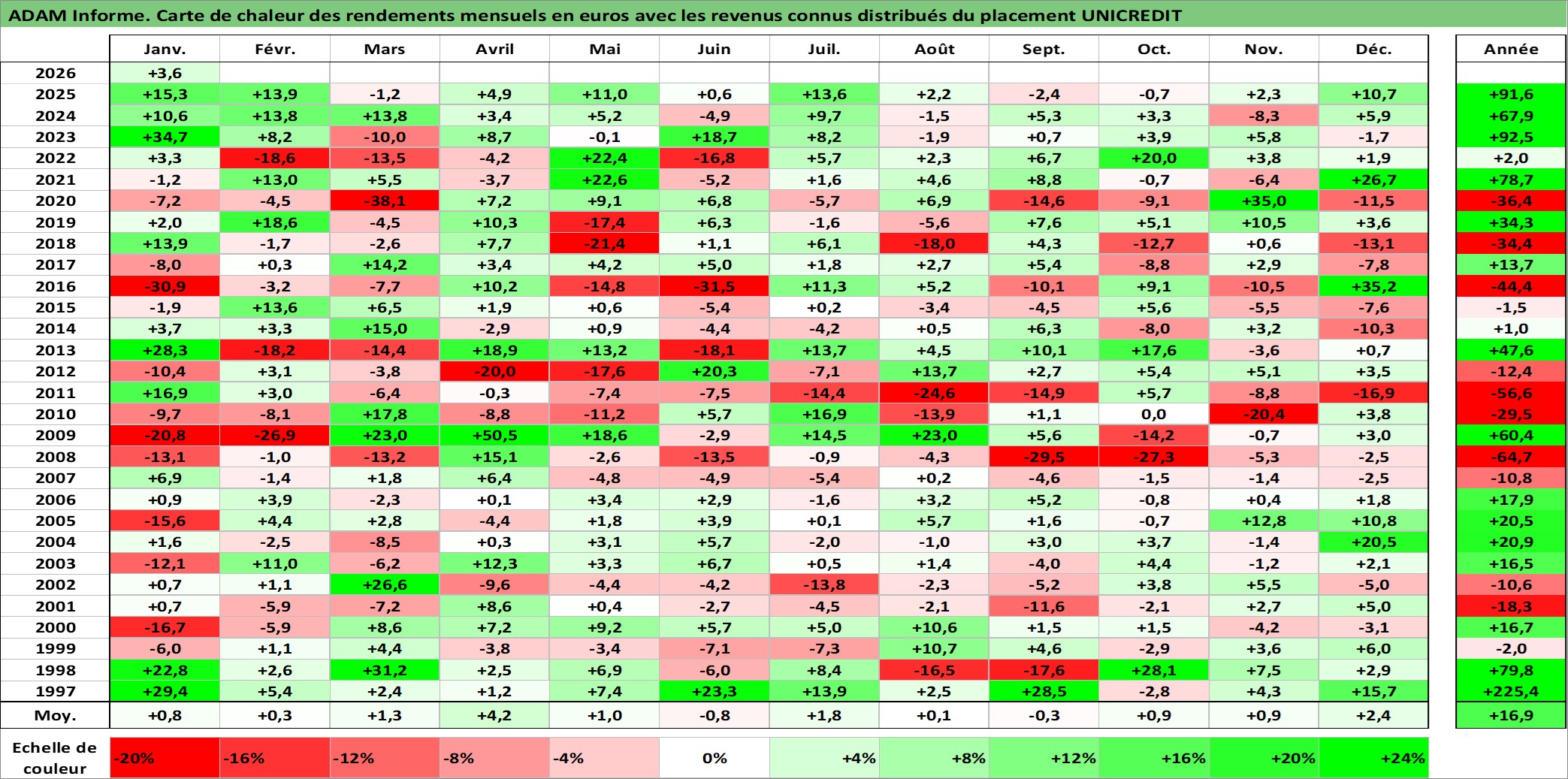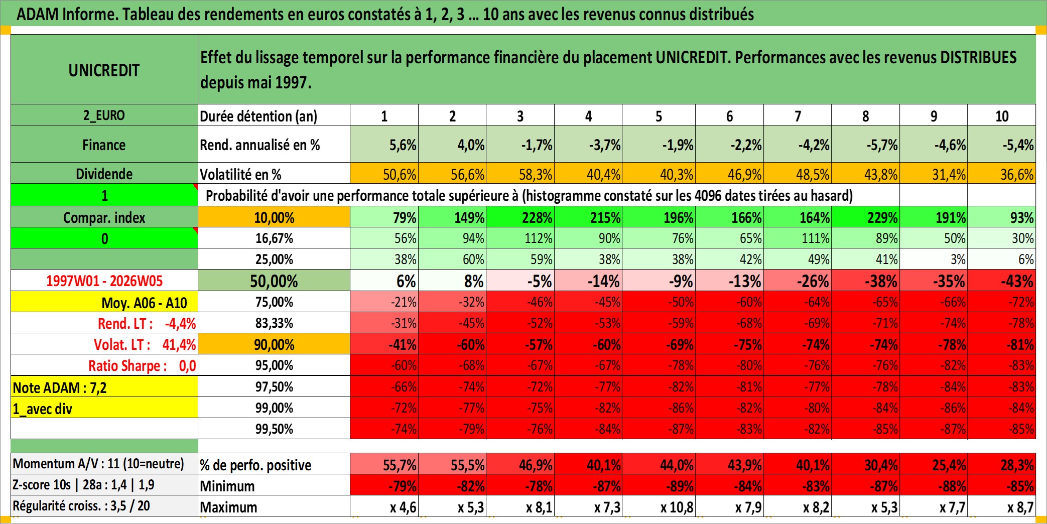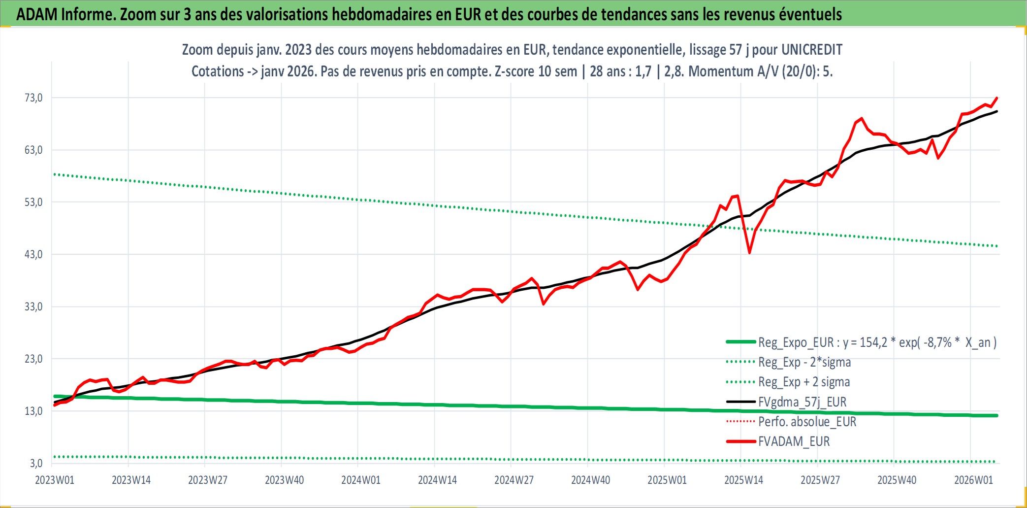 Site dédié aux investisseursPage dédiée sur site financeAnalyse des valorisations hebdomadaires de l'action UNICREDIT. Cet actif est cote en EUR. Les valorisations couvrent les semaines 1997W01 a 2026W05. Les revenus de cet actif financier sont pris en compte depuis la semaine 1997W21. La note globale ESG de cet actif est estimee a 11.0 (apres rebasage entre 0 et 20).