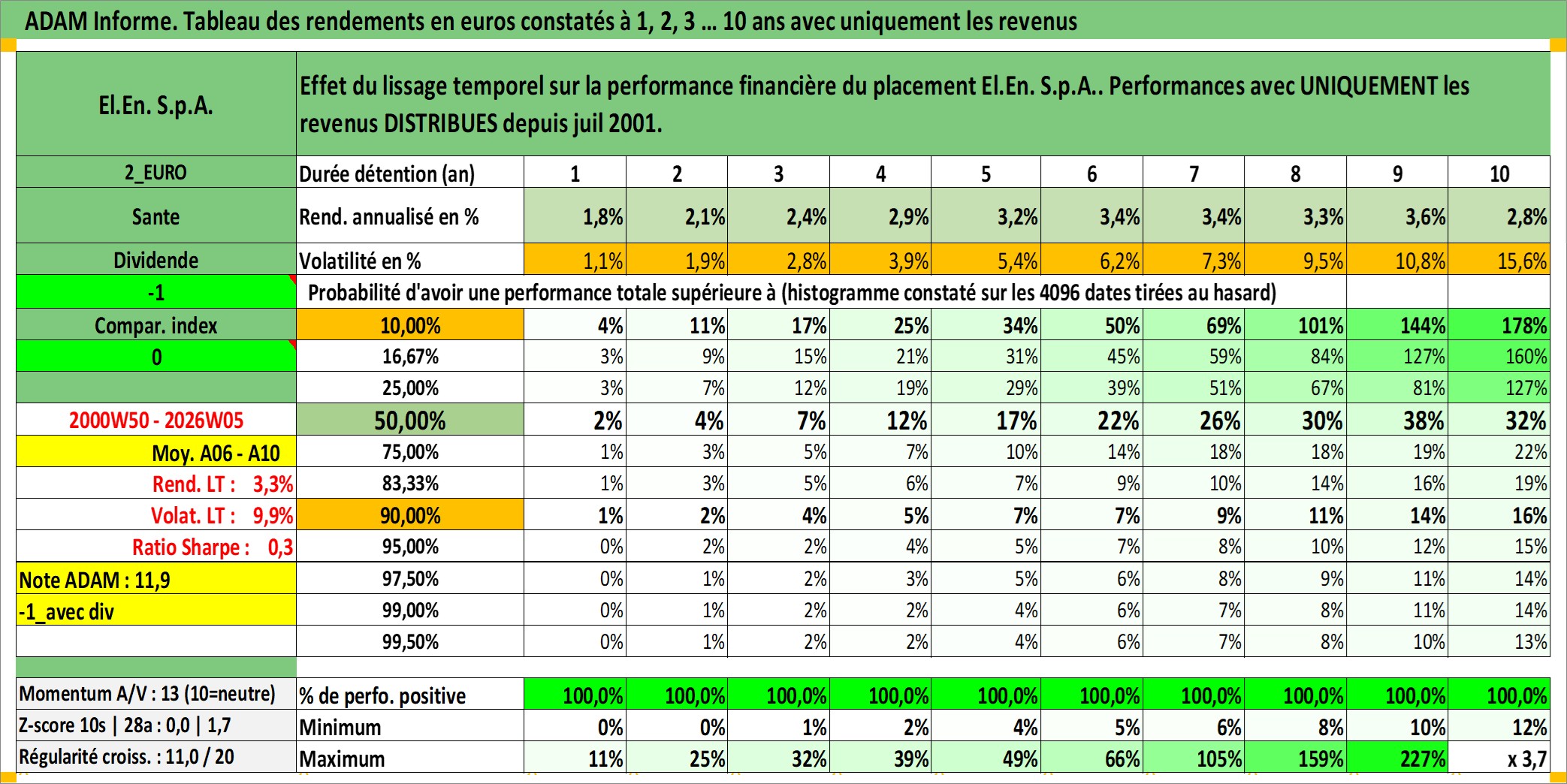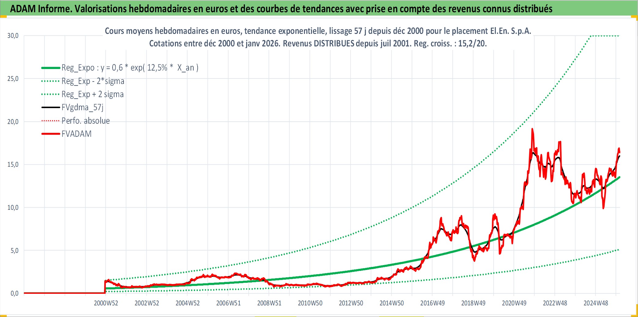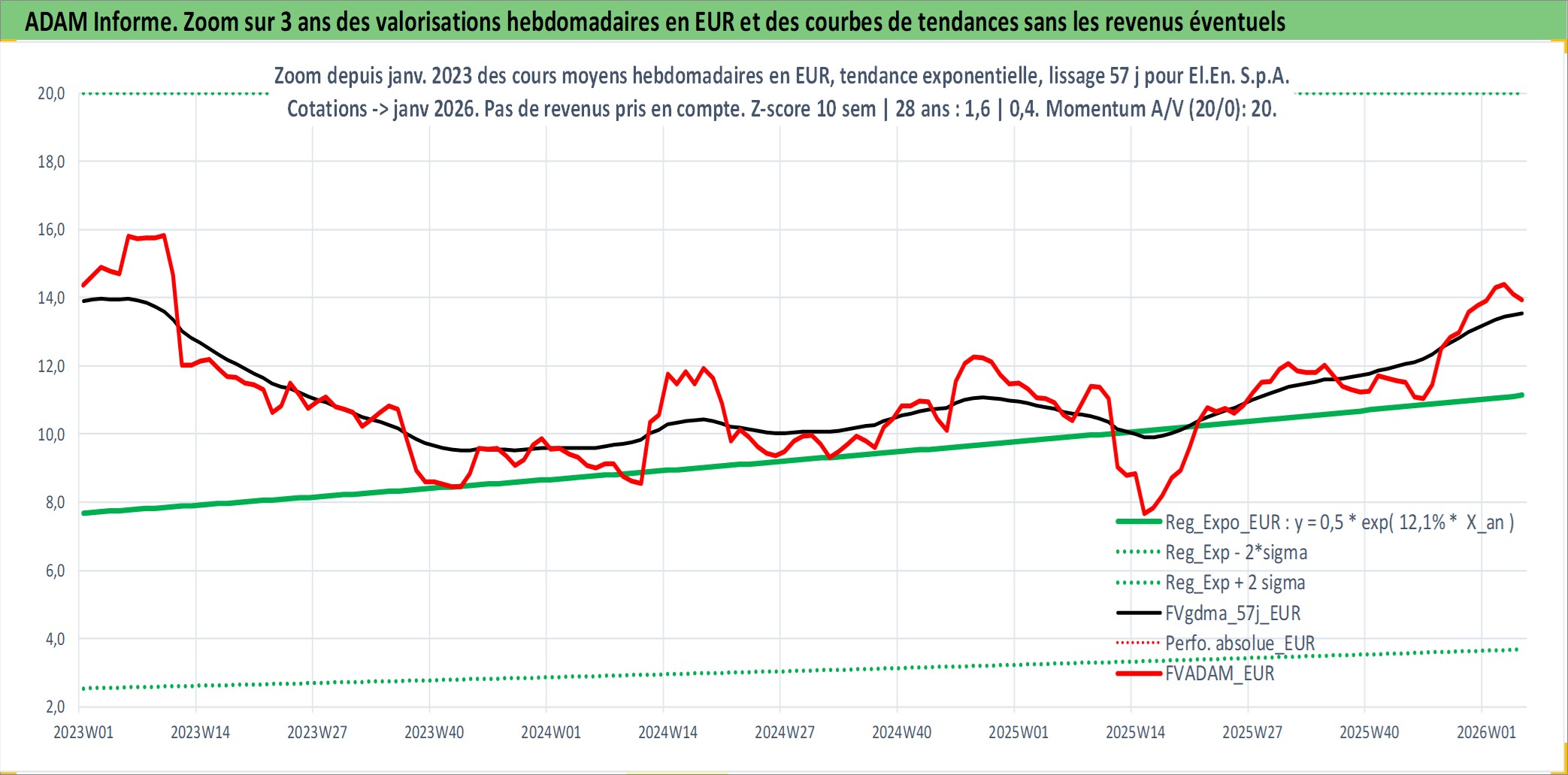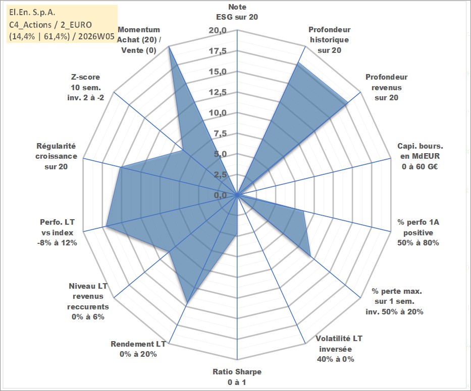 Site dédié aux investisseursPage dédiée sur site financeAnalyse des valorisations hebdomadaires de l'action El.En. S.p.A.. Cet actif est cote en EUR. Les valorisations couvrent les semaines 2000W50 a 2026W05. Les revenus de cet actif financier sont pris en compte depuis la semaine 2001W30. La note ESG de cet actif n'est pas connue.