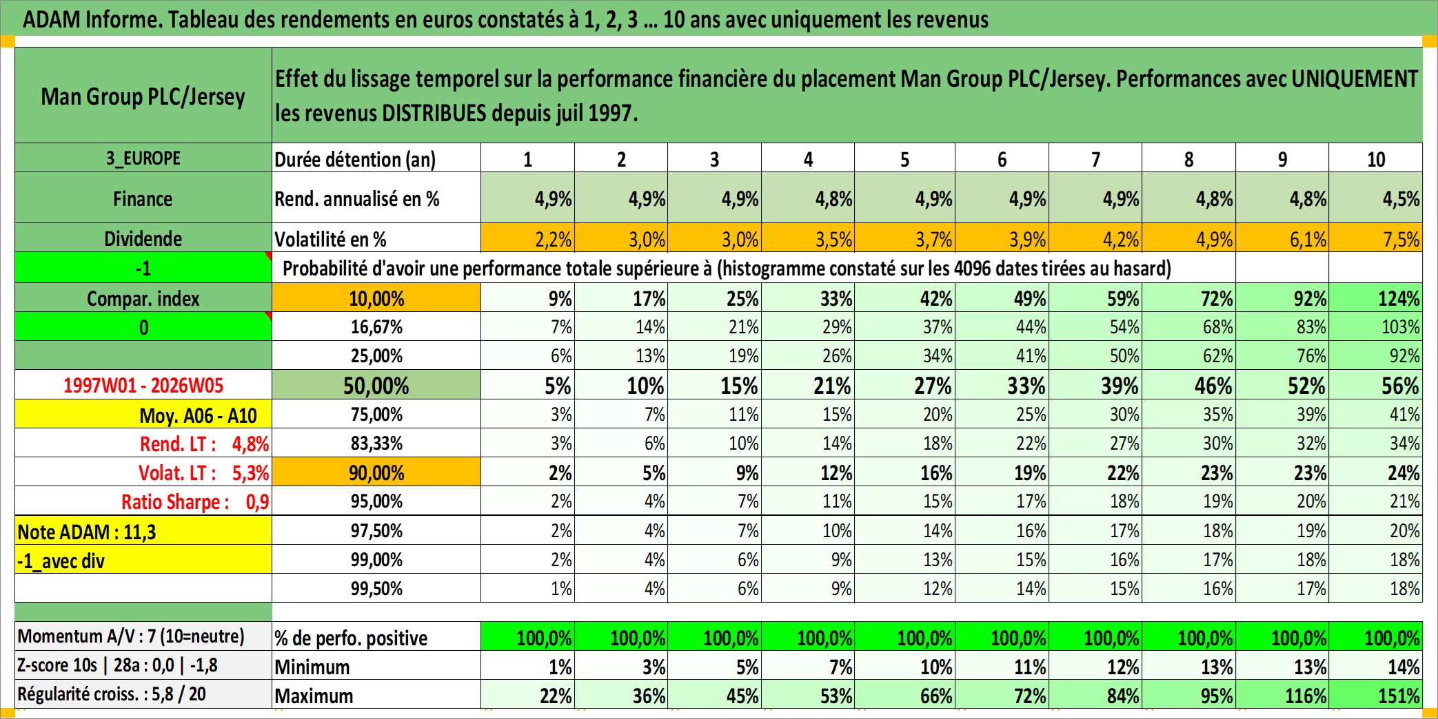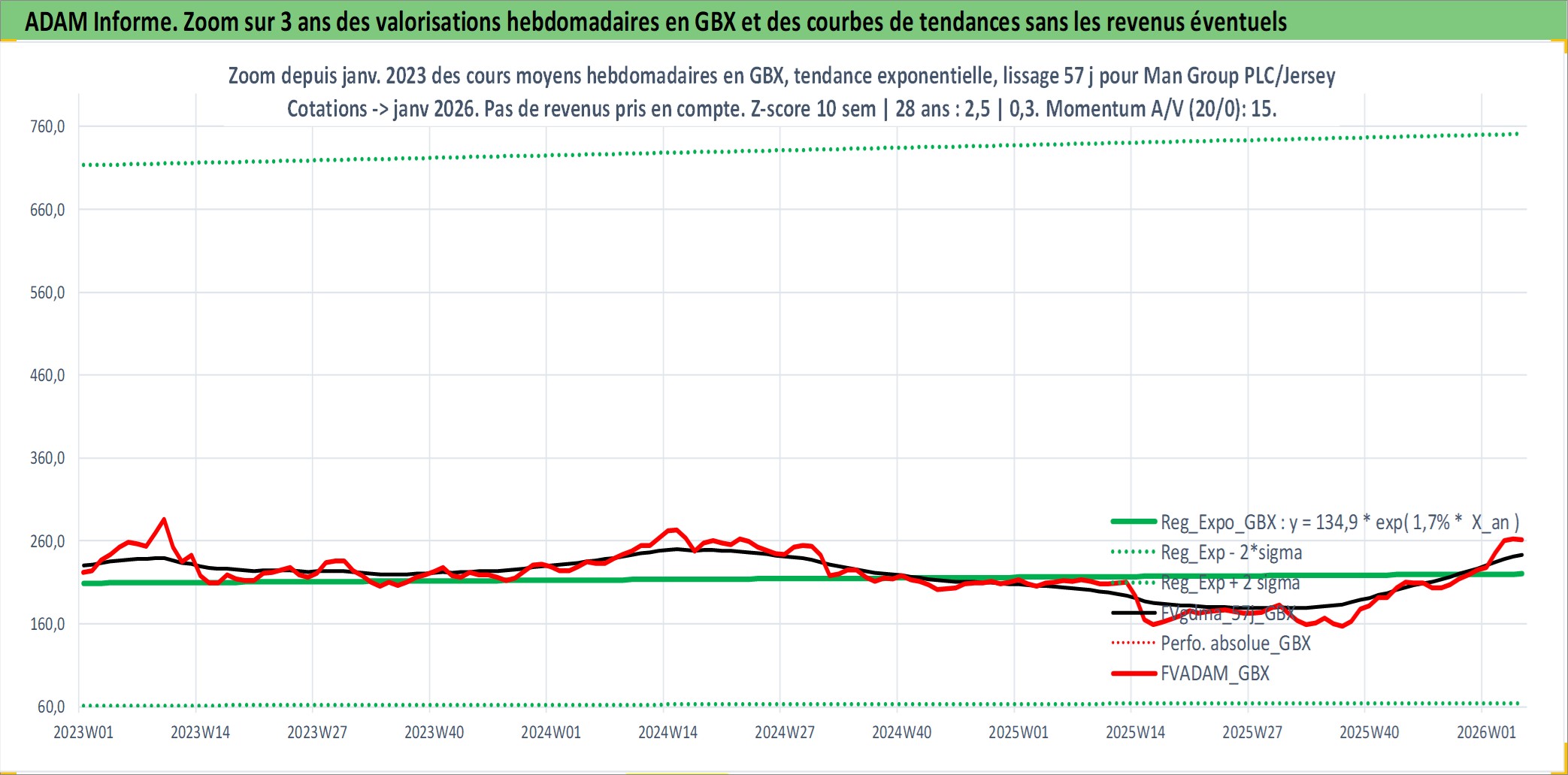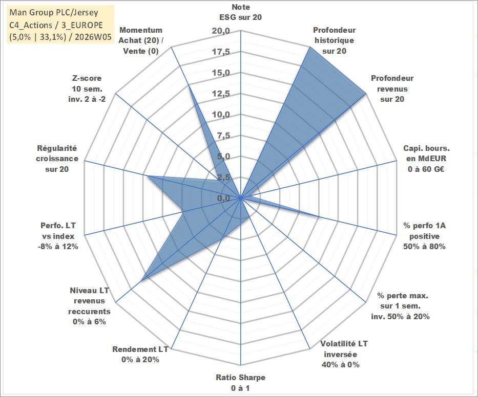 Site dédié aux investisseursPage dédiée sur site financeAnalyse des valorisations hebdomadaires de l'action Man Group PLC/Jersey. Cet actif est cote en GBX. Les valorisations sont en contrevaleur EURO et couvrent les semaines 1997W01 a 2026W05. Les revenus de cet actif financier sont pris en compte depuis la semaine 1997W29. La note ESG de cet actif n'est pas connue.