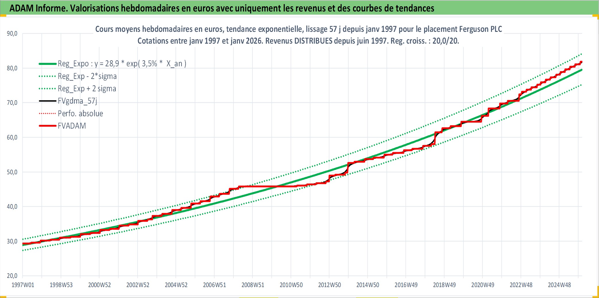 Site dédié aux investisseursPage dédiée sur site financeAnalyse des valorisations hebdomadaires de l'action Ferguson PLC. Cet actif est cote en GBX. Les valorisations sont en contrevaleur EURO et couvrent les semaines 1997W01 a 2026W05. Les revenus de cet actif financier sont pris en compte depuis la semaine 1997W24. La note ESG de cet actif n'est pas connue.