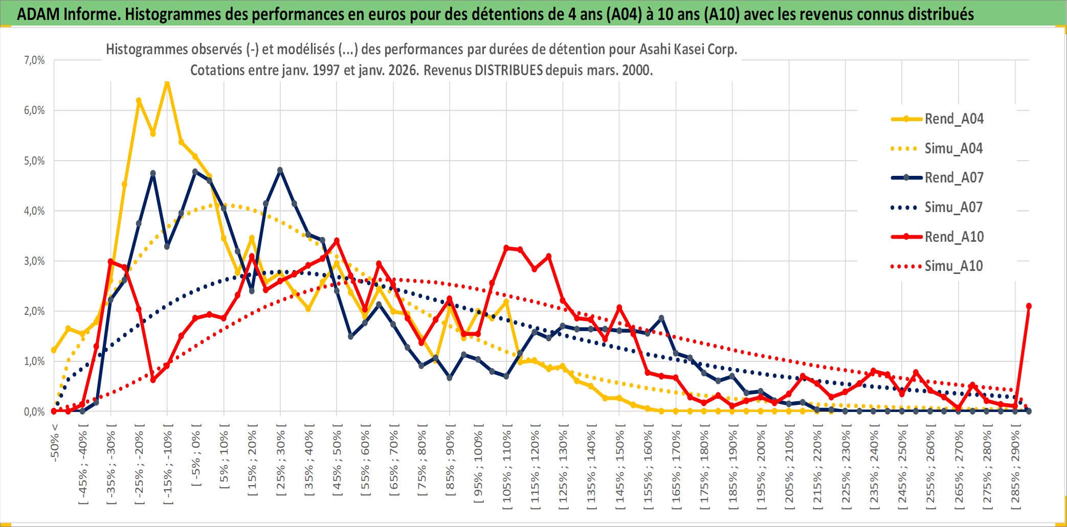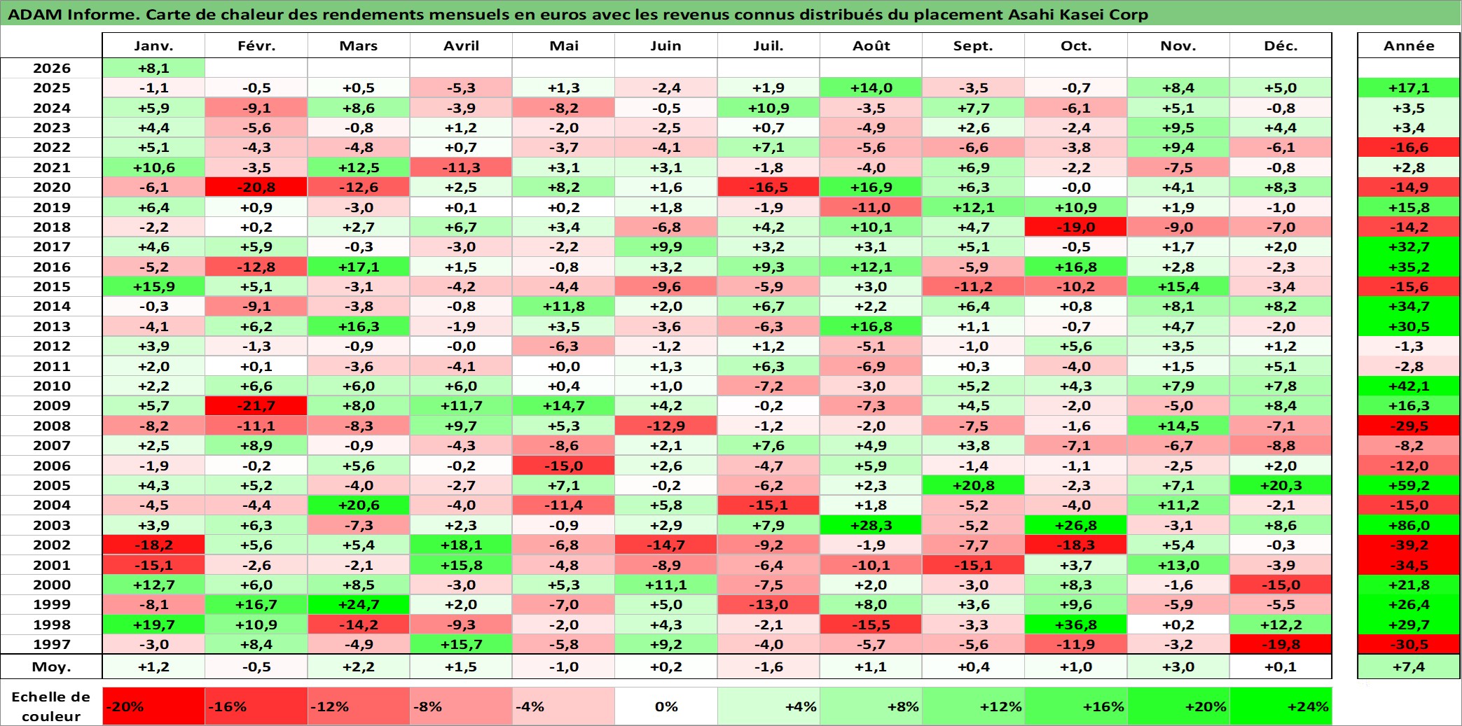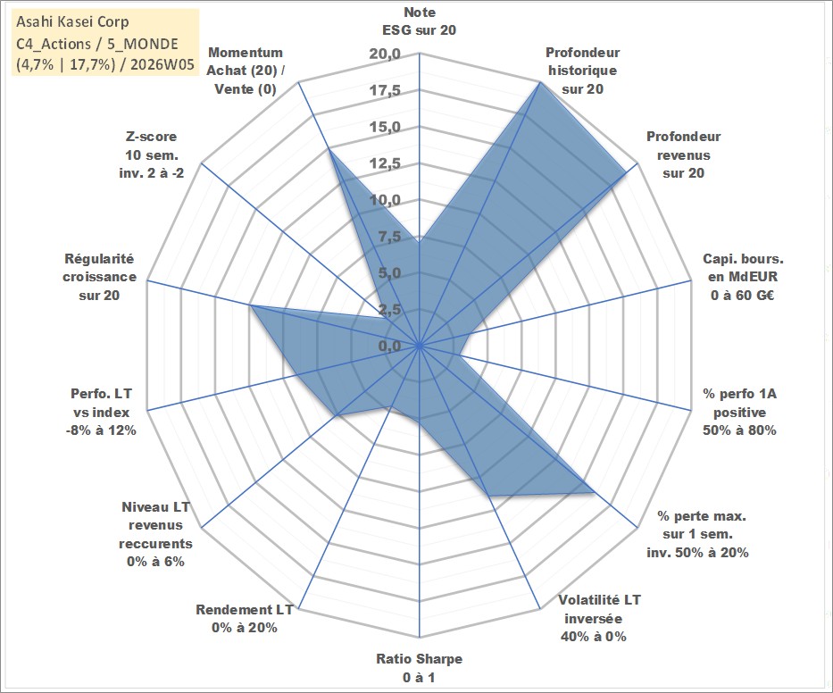 Site dédié aux investisseursPage dédiée sur site financeAnalyse des valorisations hebdomadaires de l'action Asahi Kasei Corp. Cet actif est cote en JPY. Les valorisations sont en contrevaleur EURO et couvrent les semaines 1997W01 a 2026W05. Les revenus de cet actif financier sont pris en compte depuis la semaine 2000W13. La note globale ESG de cet actif est estimee a 7.0 (apres rebasage entre 0 et 20).