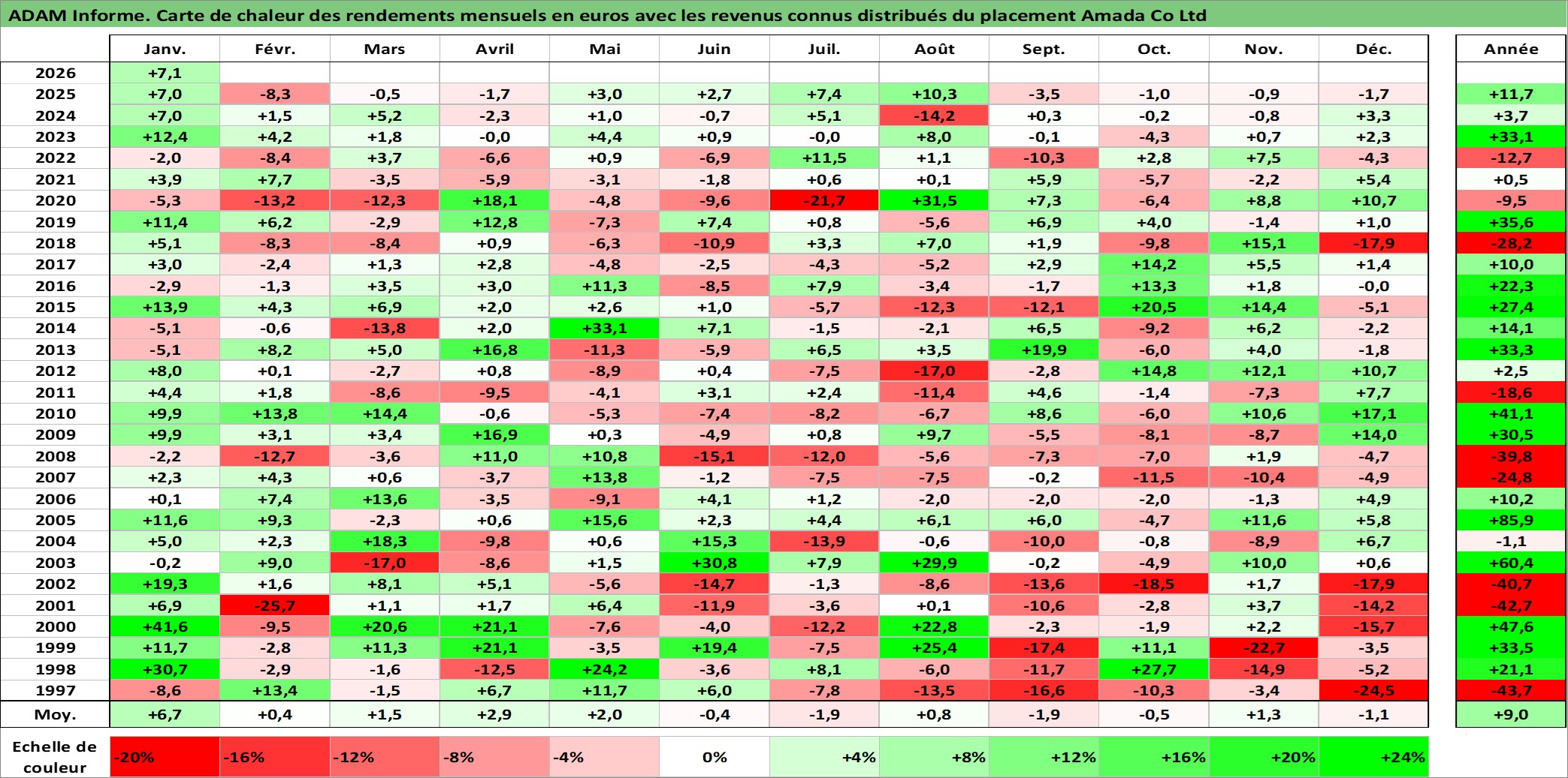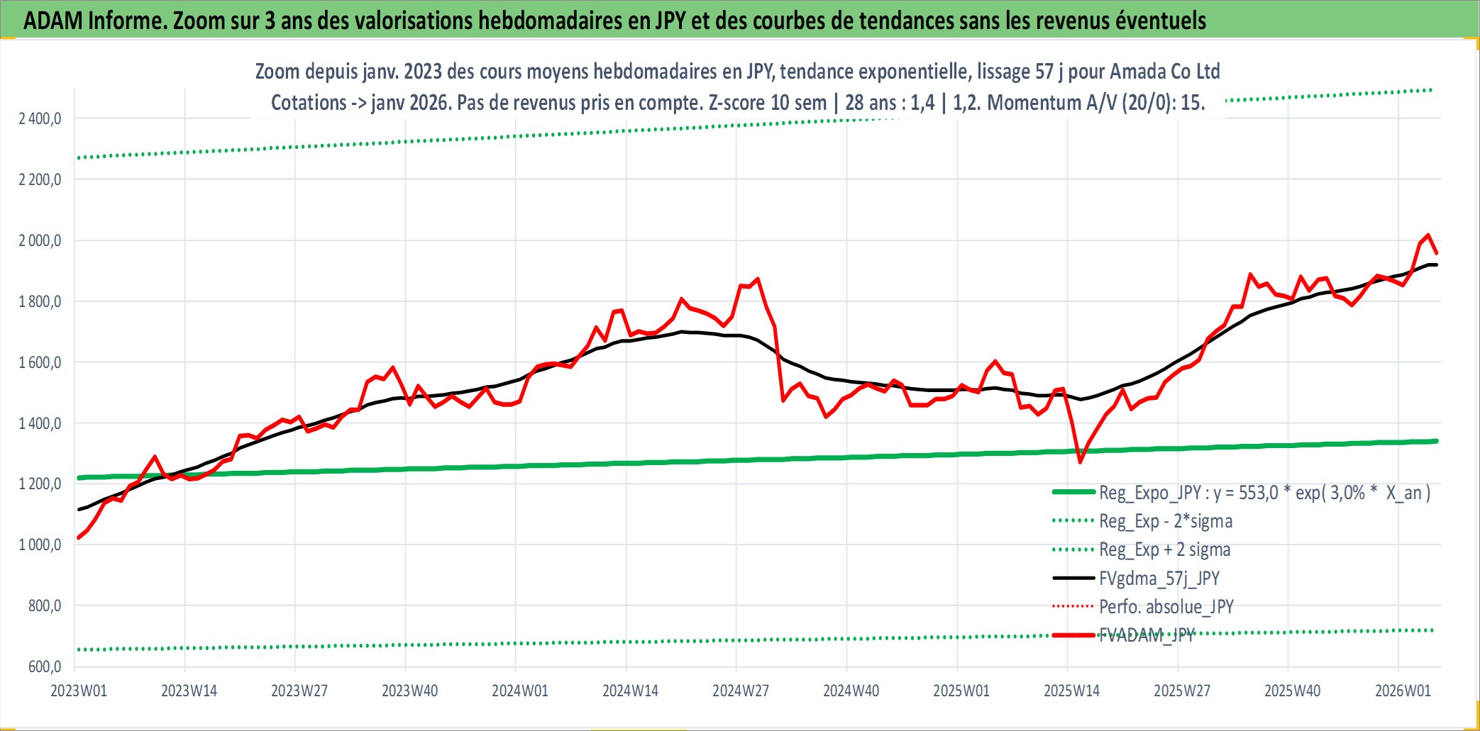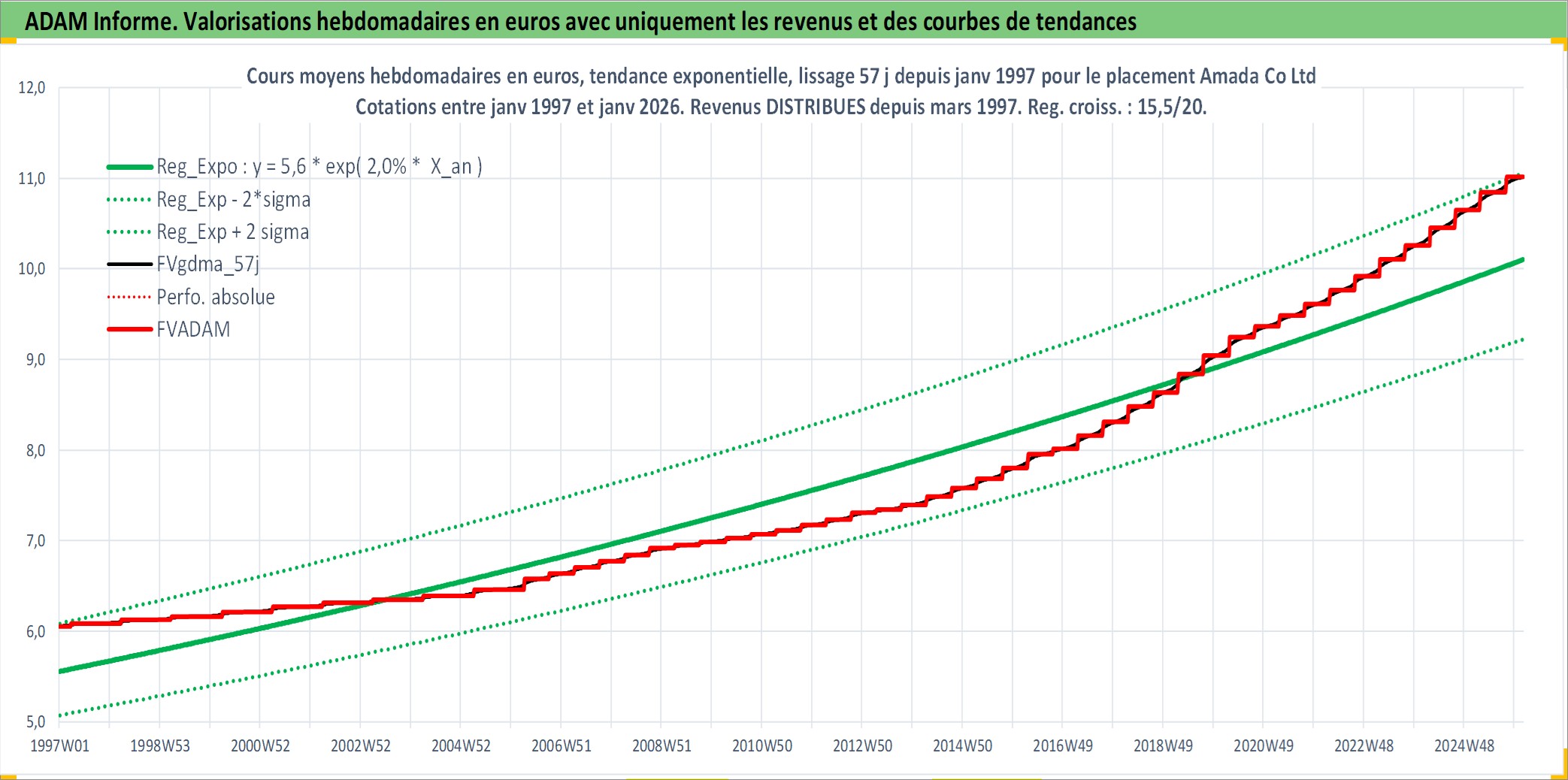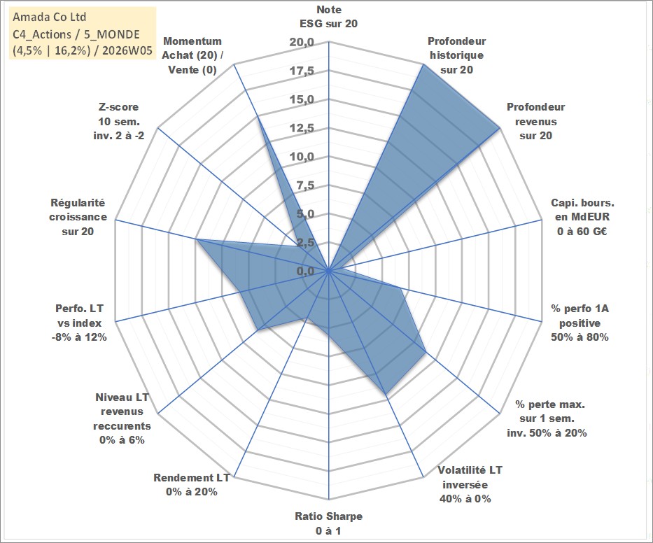 Site dédié aux investisseursPage dédiée sur site financeAnalyse des valorisations hebdomadaires de l'action Amada Co Ltd. Cet actif est cote en JPY. Les valorisations sont en contrevaleur EURO et couvrent les semaines 1997W01 a 2026W05. Les revenus de cet actif financier sont pris en compte depuis la semaine 1997W13. La note ESG de cet actif n'est pas connue.