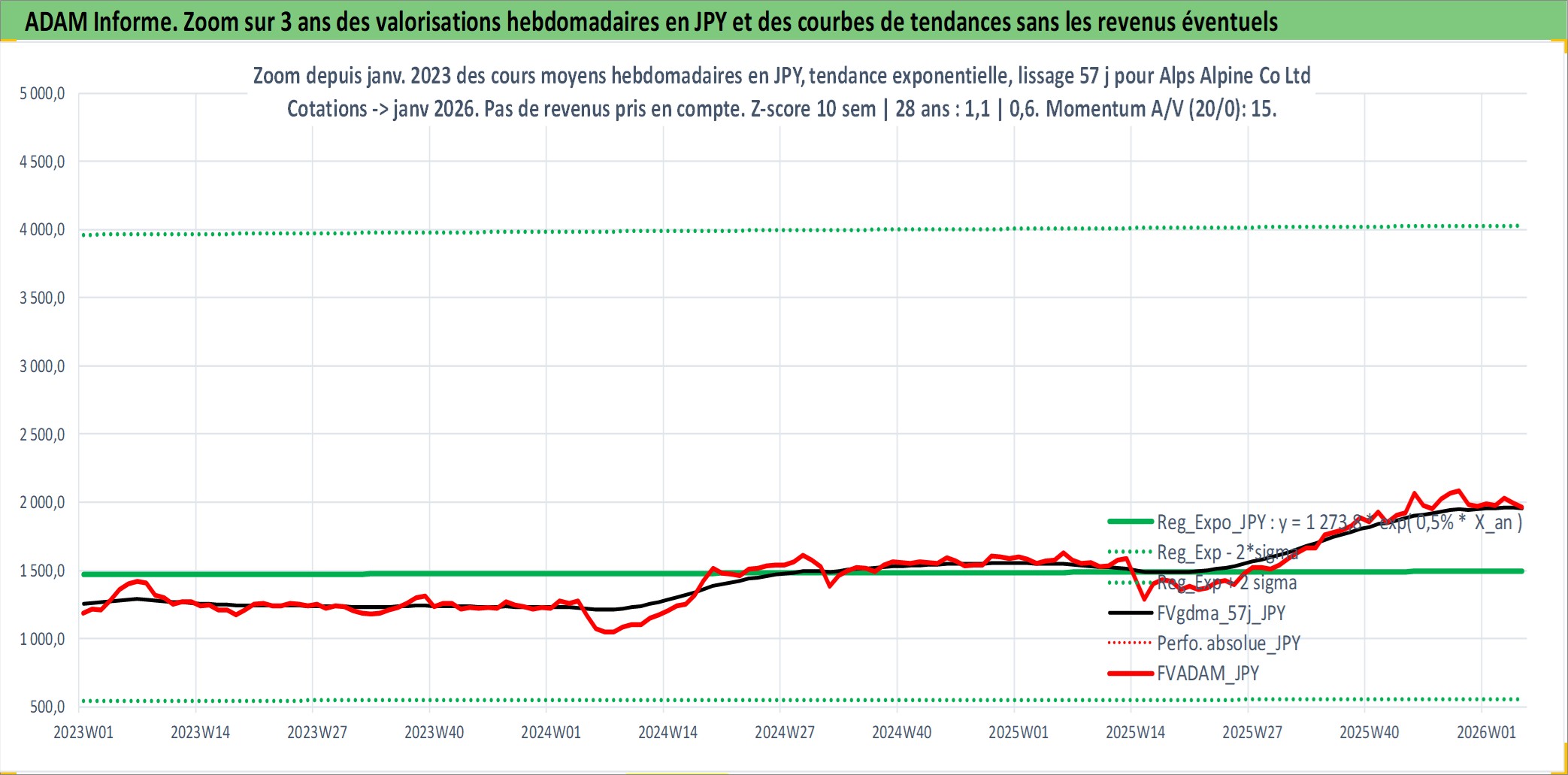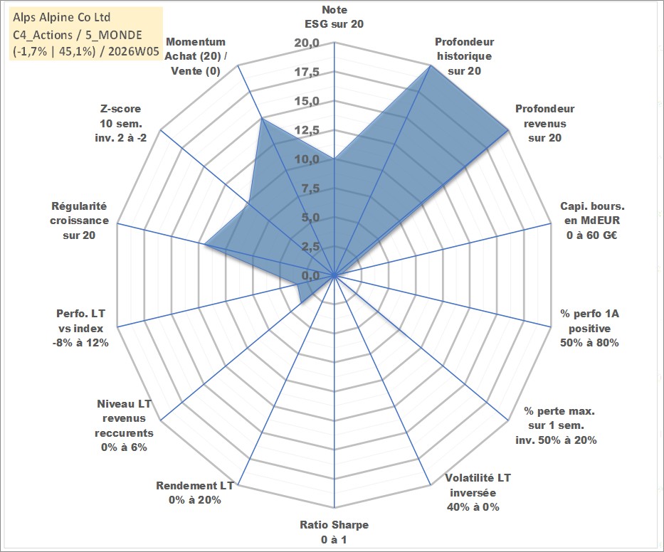 Site dédié aux investisseursPage dédiée sur site financeAnalyse des valorisations hebdomadaires de l'action Alps Alpine Co Ltd. Cet actif est cote en JPY. Les valorisations sont en contrevaleur EURO et couvrent les semaines 1997W01 a 2026W05. Les revenus de cet actif financier sont pris en compte depuis la semaine 1997W13. La note globale ESG de cet actif est estimee a 10.0 (apres rebasage entre 0 et 20).