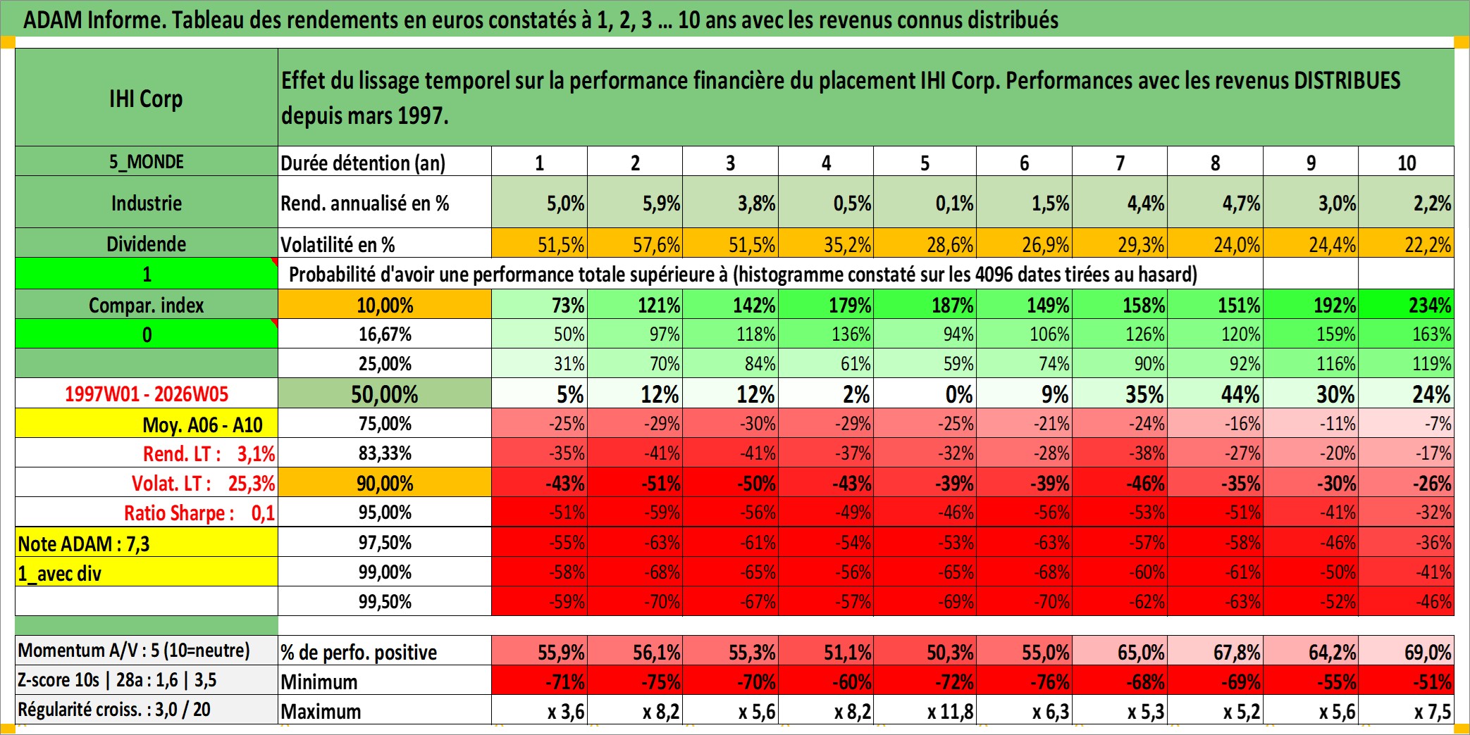 Site dédié aux investisseursPage dédiée sur site financeAnalyse des valorisations hebdomadaires de l'action IHI Corp. Cet actif est cote en JPY. Les valorisations sont en contrevaleur EURO et couvrent les semaines 1997W01 a 2026W05. Les revenus de cet actif financier sont pris en compte depuis la semaine 1997W13. La note ESG de cet actif n'est pas connue.