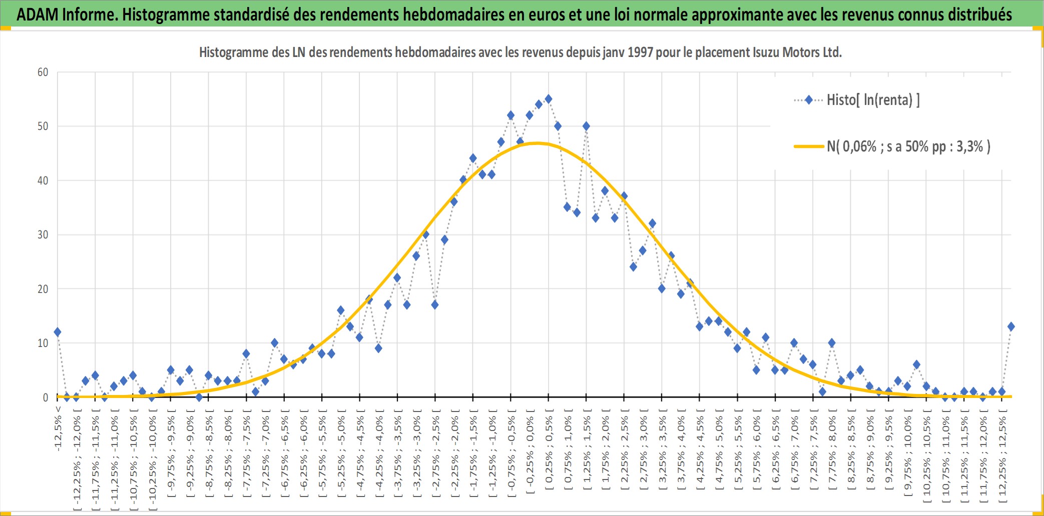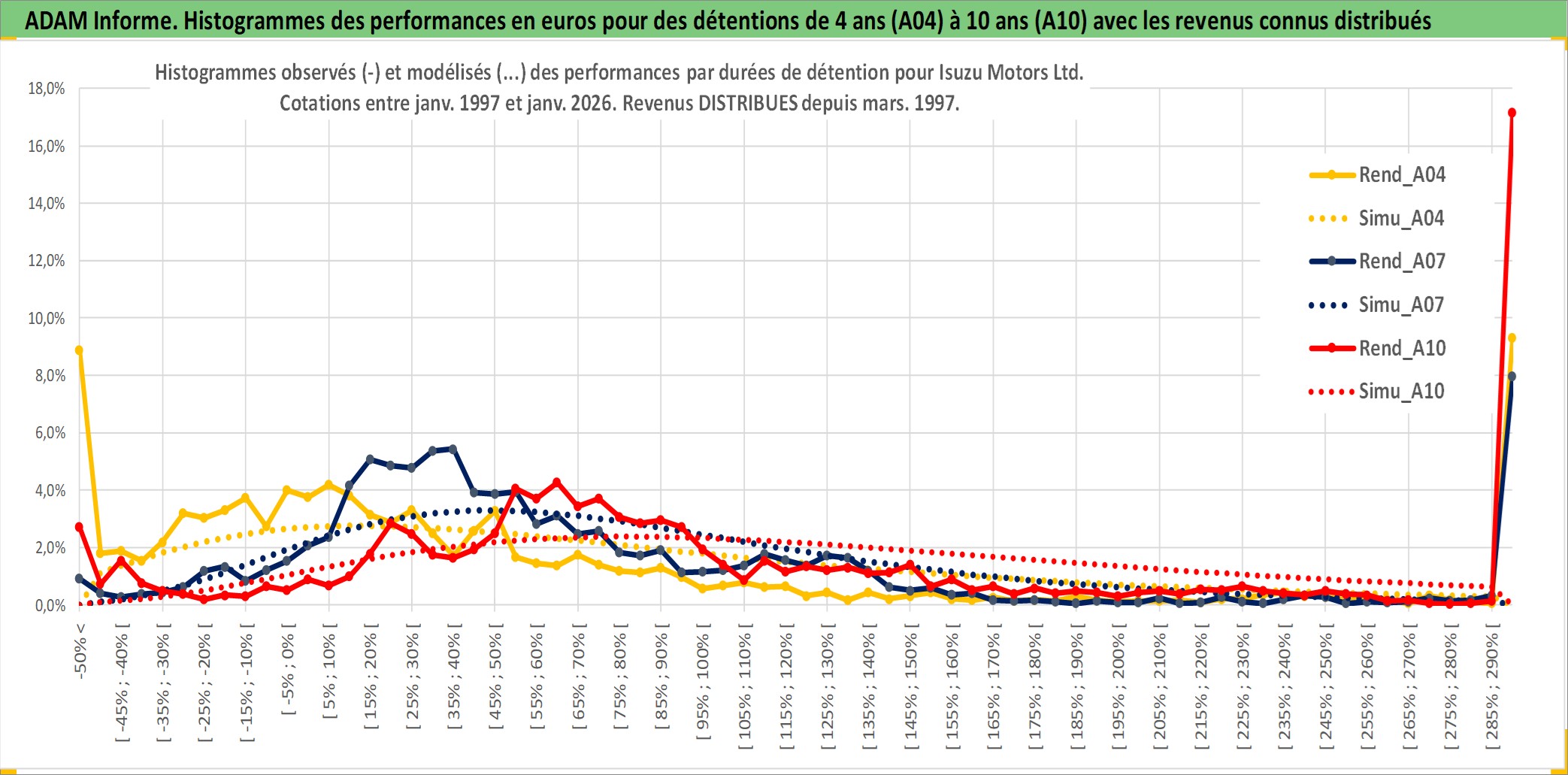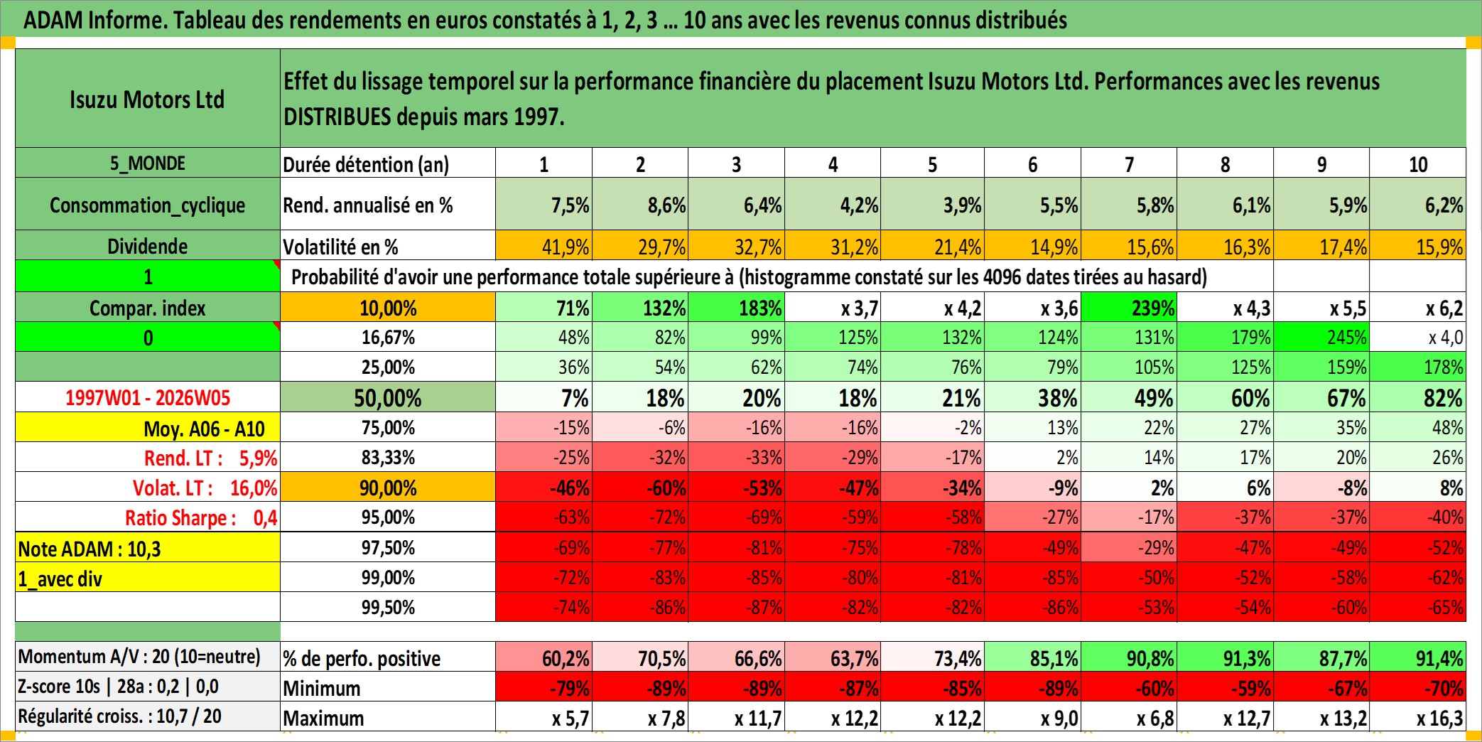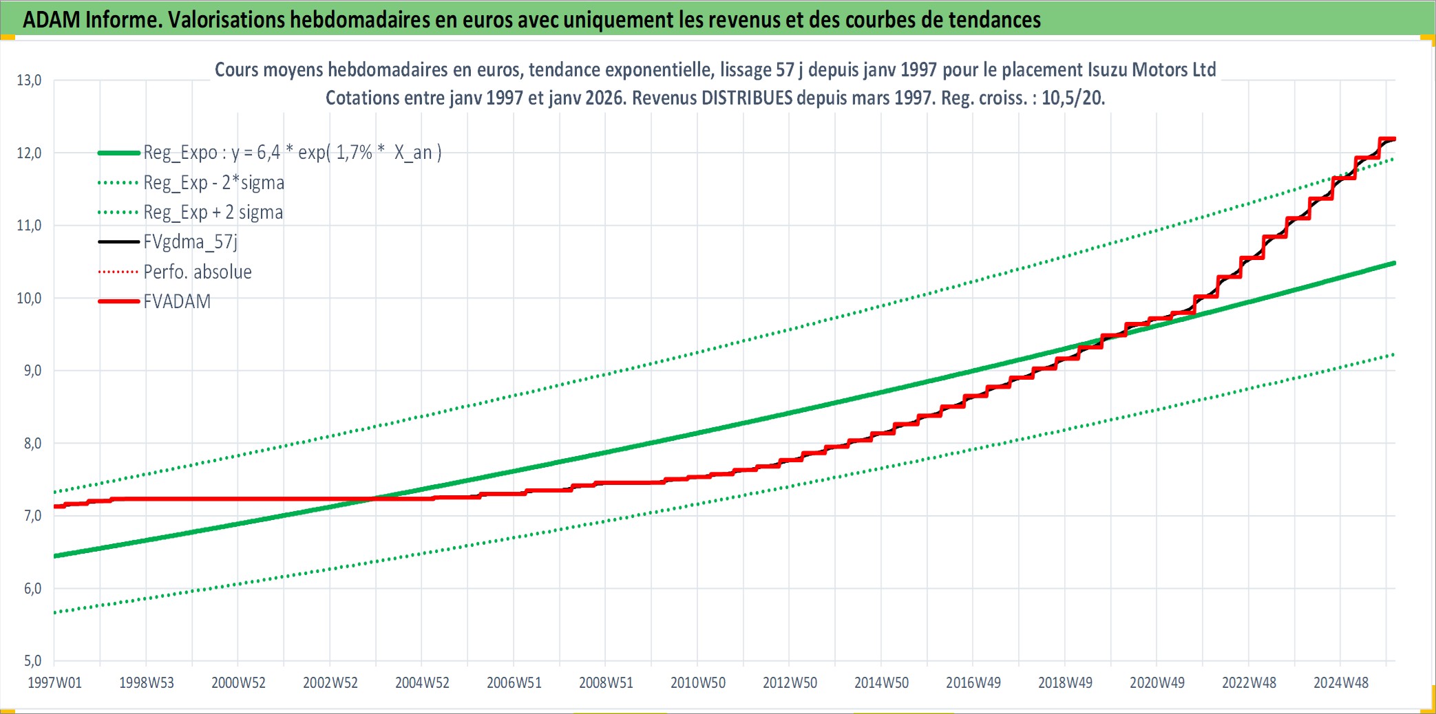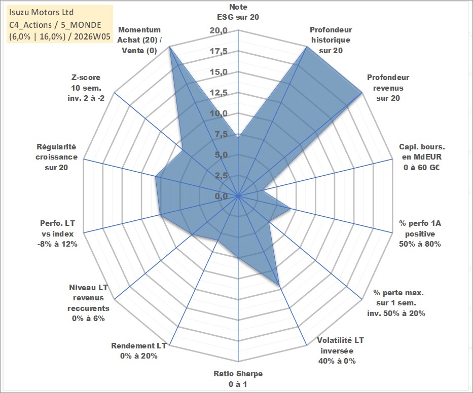 Site dédié aux investisseursPage dédiée sur site financeAnalyse des valorisations hebdomadaires de l'action Isuzu Motors Ltd. Cet actif est cote en JPY. Les valorisations sont en contrevaleur EURO et couvrent les semaines 1997W01 a 2026W05. Les revenus de cet actif financier sont pris en compte depuis la semaine 1997W13. La note globale ESG de cet actif est estimee a 7.0 (apres rebasage entre 0 et 20).