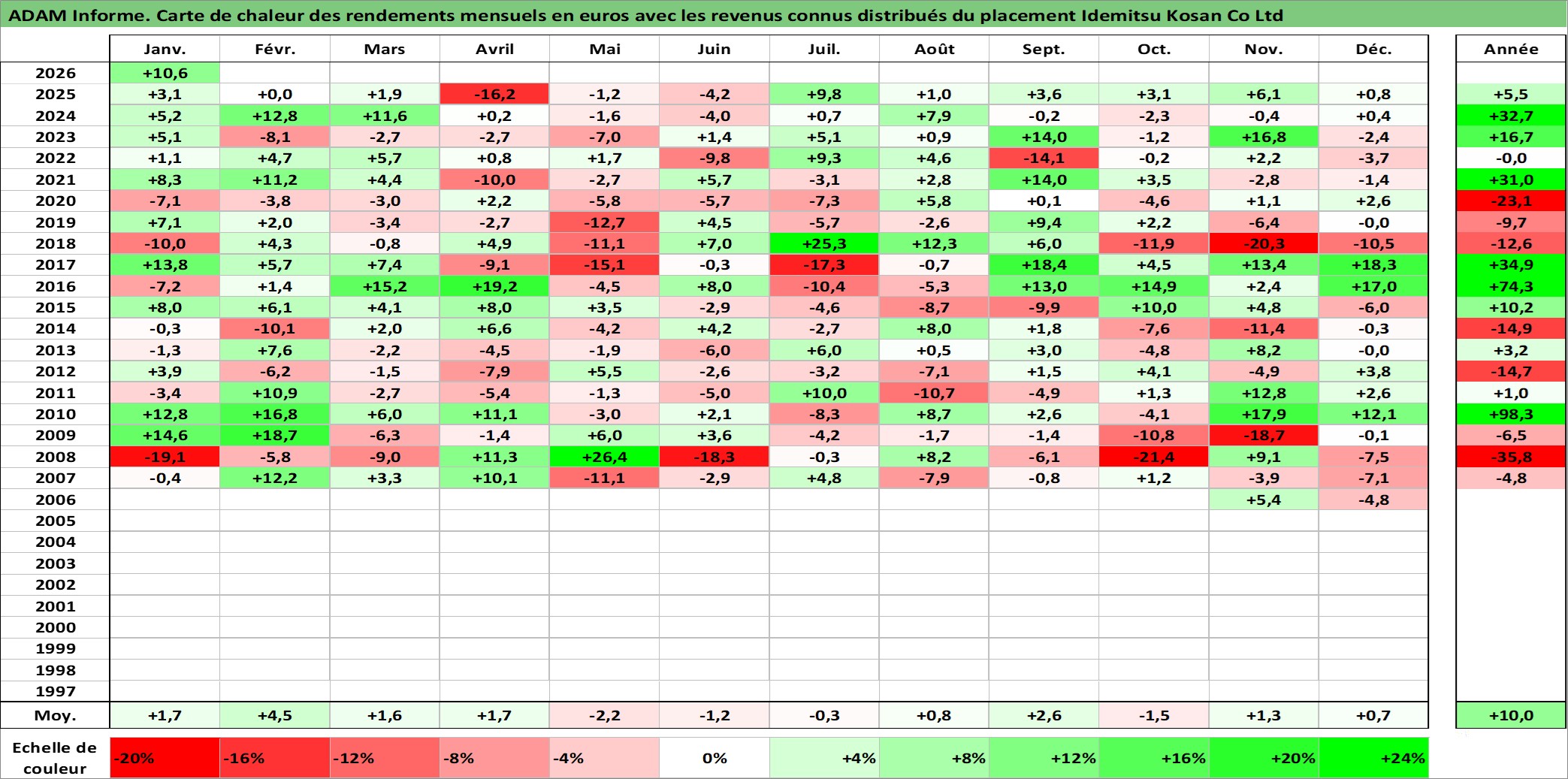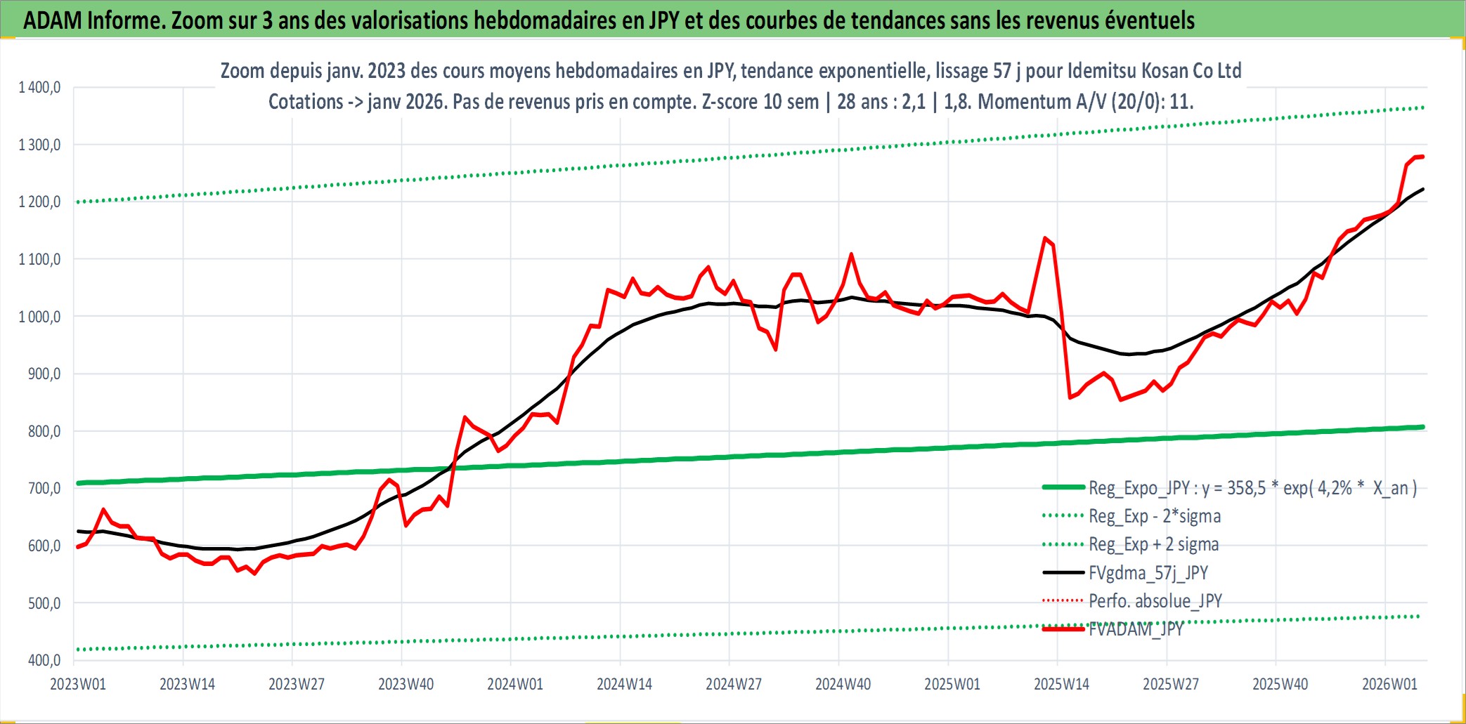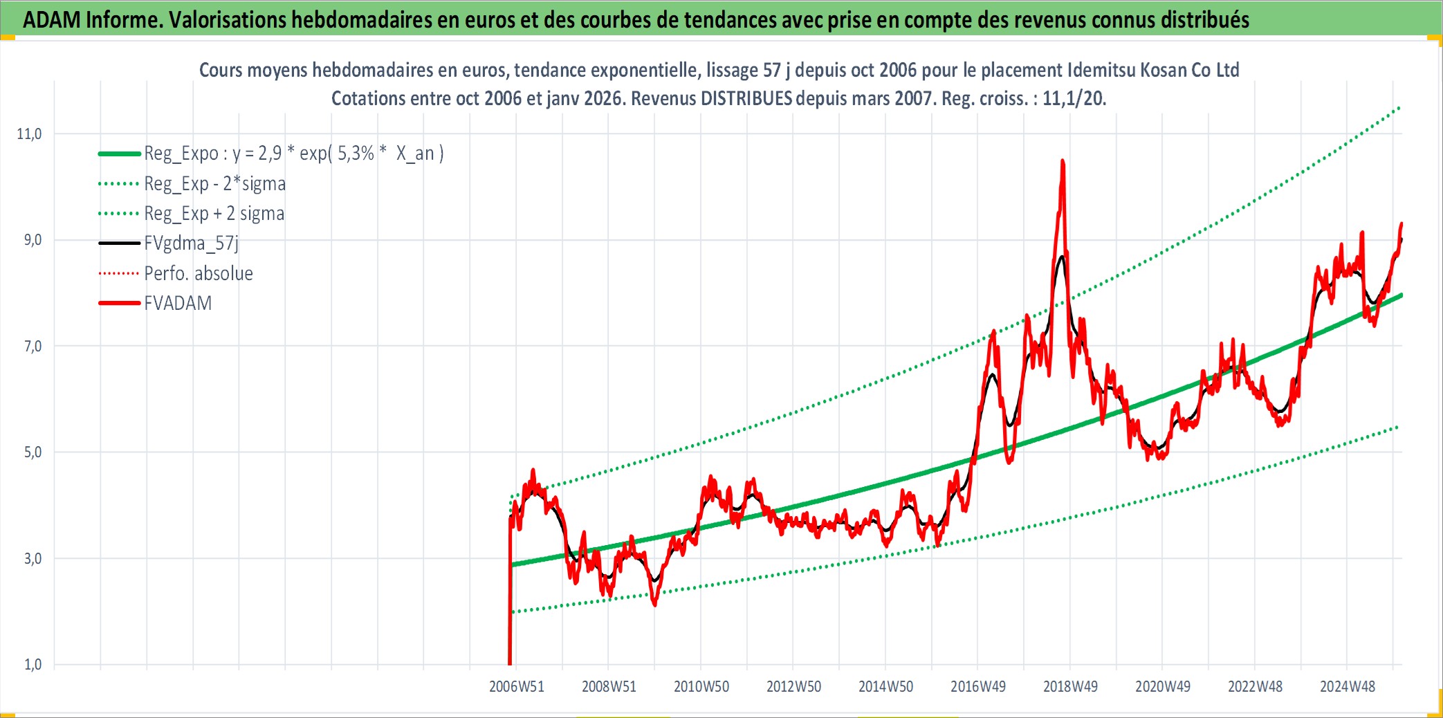 Site dédié aux investisseursPage dédiée sur site financeAnalyse des valorisations hebdomadaires de l'action Idemitsu Kosan Co Ltd. Cet actif est cote en JPY. Les valorisations sont en contrevaleur EURO et couvrent les semaines 2006W44 a 2026W05. Les revenus de cet actif financier sont pris en compte depuis la semaine 2007W13. La note ESG de cet actif n'est pas connue.