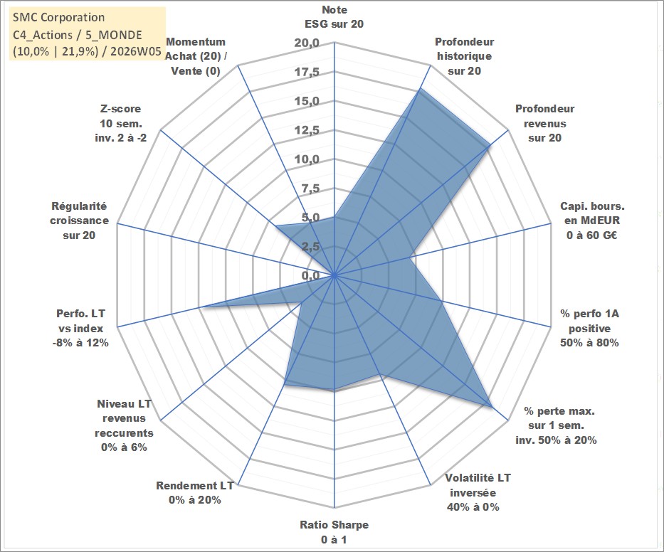 Site dédié aux investisseursPage dédiée sur site financeAnalyse des valorisations hebdomadaires de l'action SMC Corporation. Cet actif est cote en JPY. Les valorisations sont en contrevaleur EURO et couvrent les semaines 2001W02 a 2026W05. Les revenus de cet actif financier sont pris en compte depuis la semaine 2001W13. La note globale ESG de cet actif est estimee a 5.0 (apres rebasage entre 0 et 20).