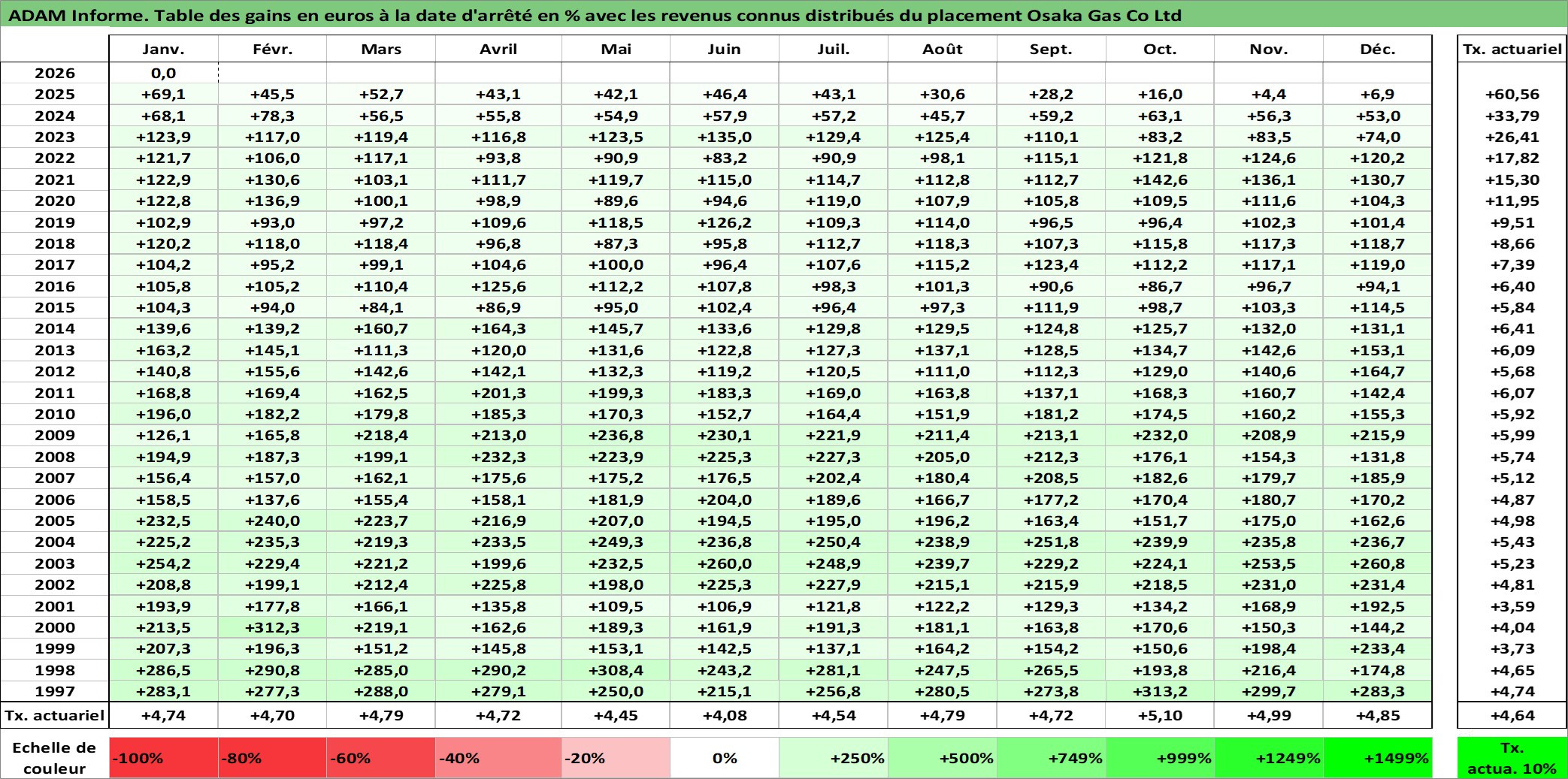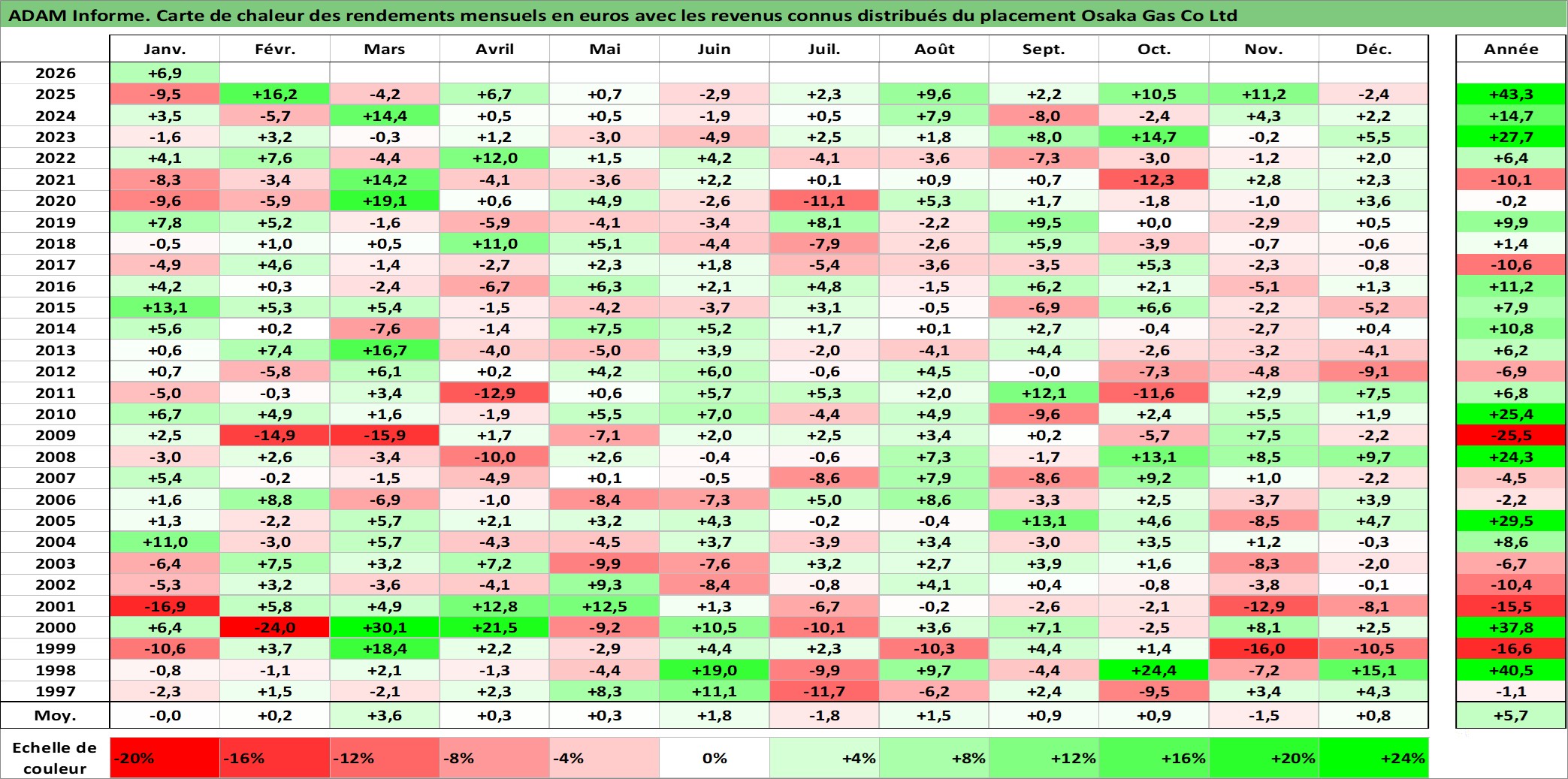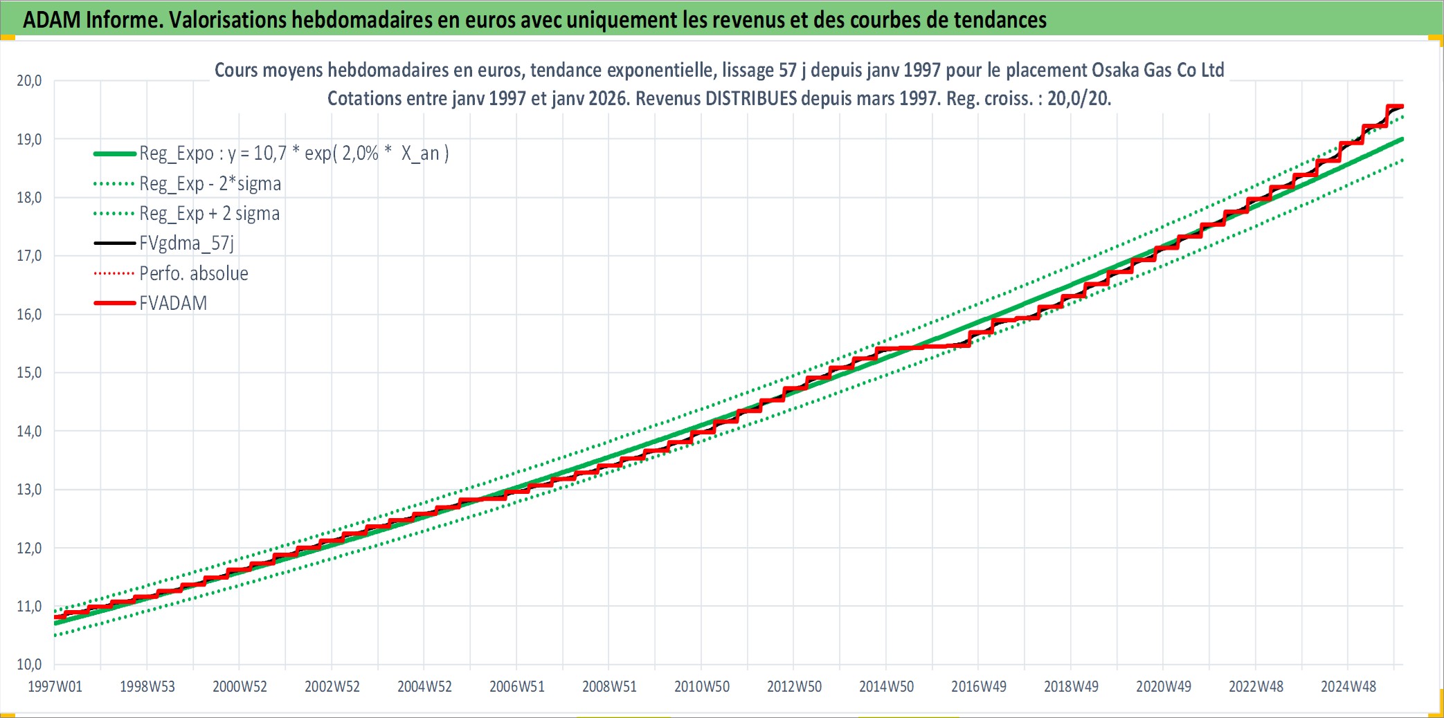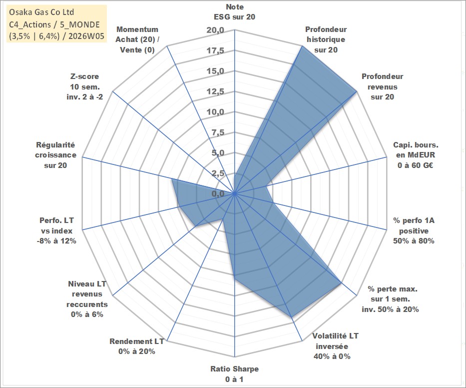Site dédié aux investisseursPage dédiée sur site financeAnalyse des valorisations hebdomadaires de l'action Osaka Gas Co Ltd. Cet actif est cote en JPY. Les valorisations sont en contrevaleur EURO et couvrent les semaines 1997W01 a 2026W05. Les revenus de cet actif financier sont pris en compte depuis la semaine 1997W13. La note globale ESG de cet actif est estimee a 2.0 (apres rebasage entre 0 et 20).