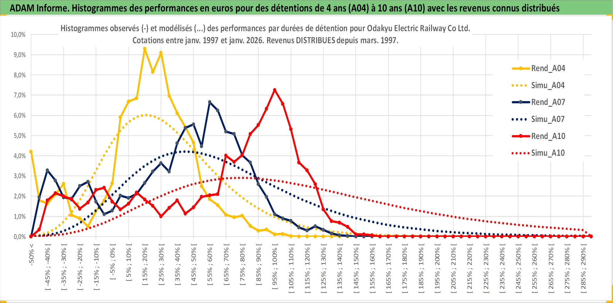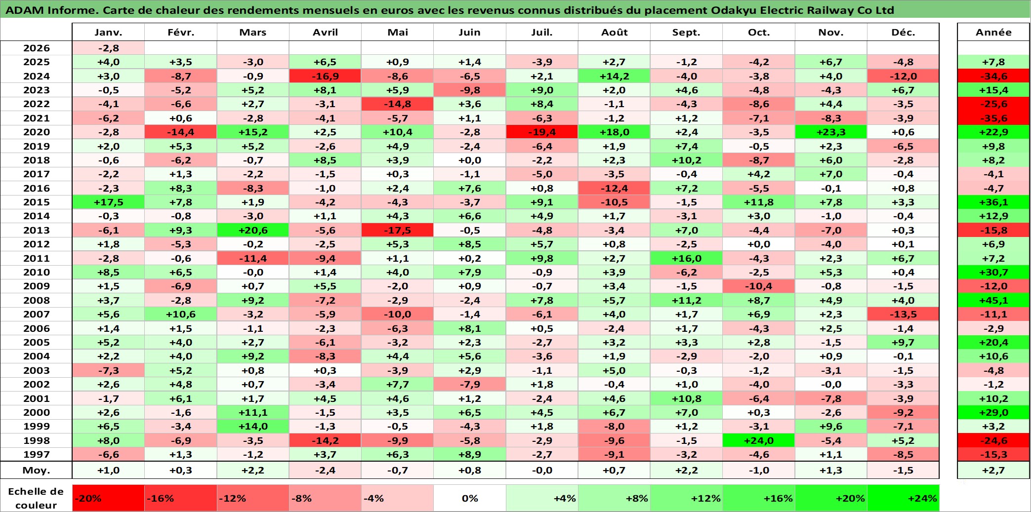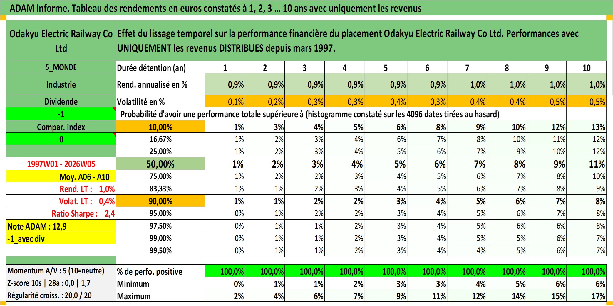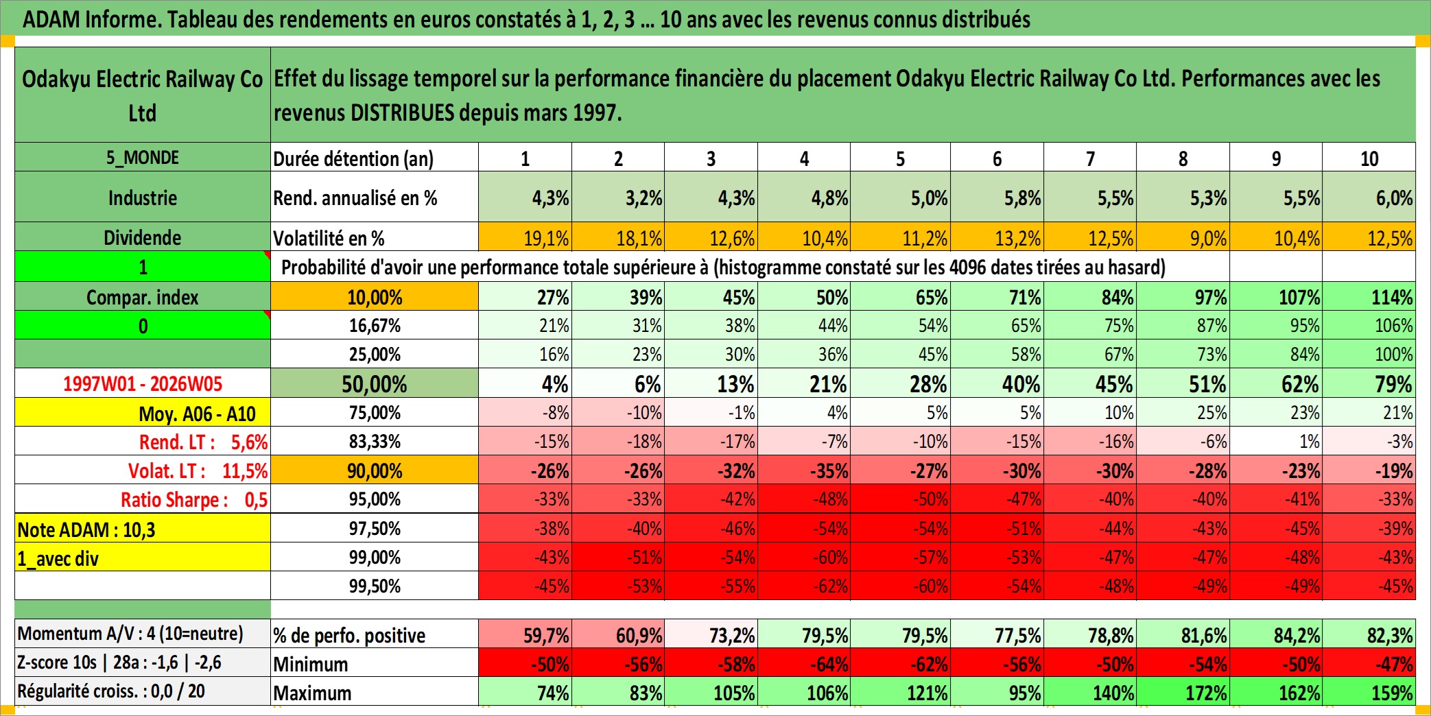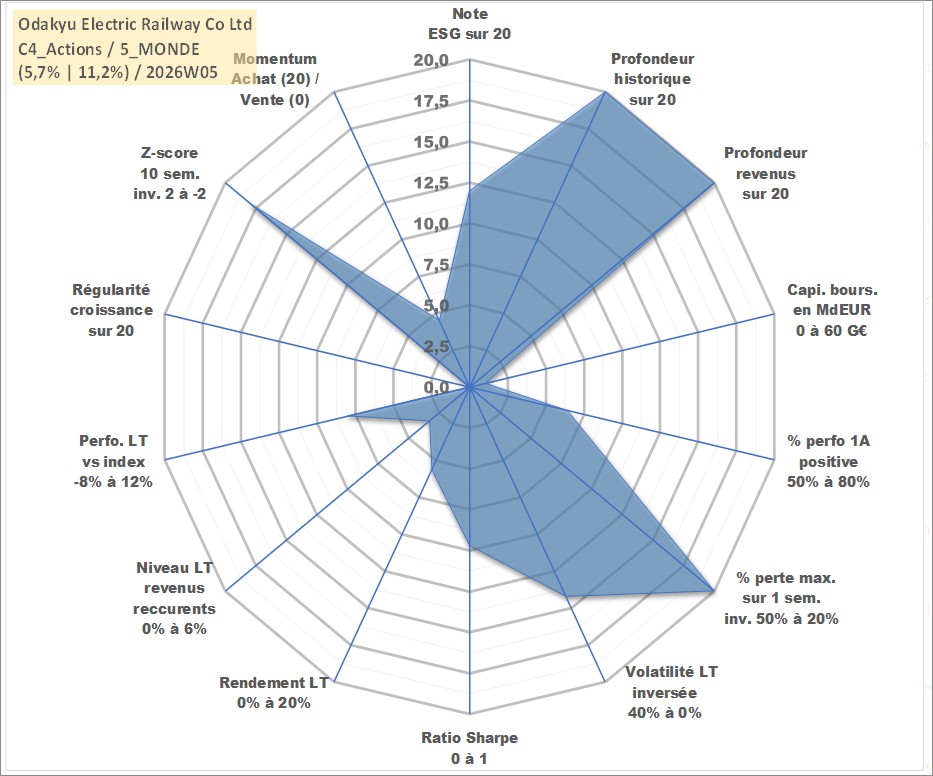 Site dédié aux investisseursPage dédiée sur site financeAnalyse des valorisations hebdomadaires de l'action Odakyu Electric Railway Co Ltd. Cet actif est cote en JPY. Les valorisations sont en contrevaleur EURO et couvrent les semaines 1997W01 a 2026W05. Les revenus de cet actif financier sont pris en compte depuis la semaine 1997W13. La note globale ESG de cet actif est estimee a 12.0 (apres rebasage entre 0 et 20).