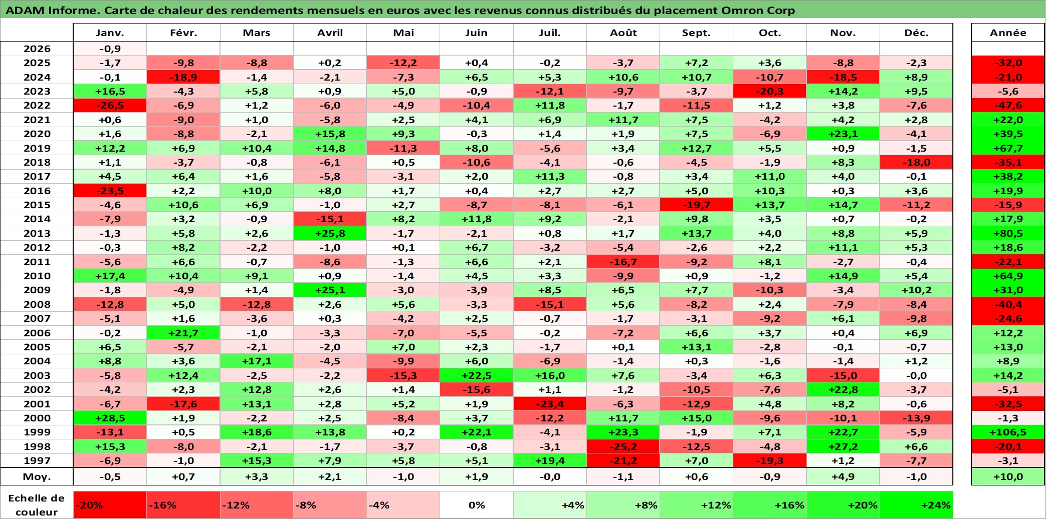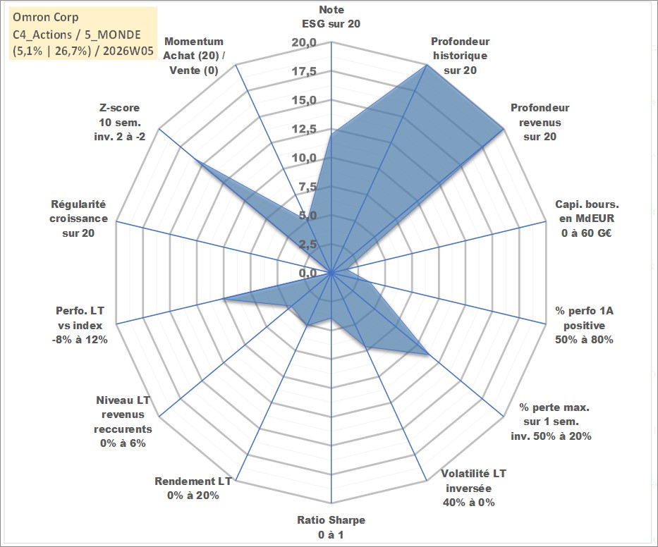 Site dédié aux investisseursPage dédiée sur site financeAnalyse des valorisations hebdomadaires de l'action Omron Corp. Cet actif est cote en JPY. Les valorisations sont en contrevaleur EURO et couvrent les semaines 1997W01 a 2026W05. Les revenus de cet actif financier sont pris en compte depuis la semaine 1997W13. La note globale ESG de cet actif est estimee a 12.0 (apres rebasage entre 0 et 20).