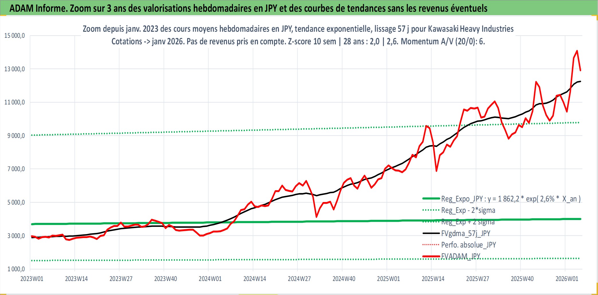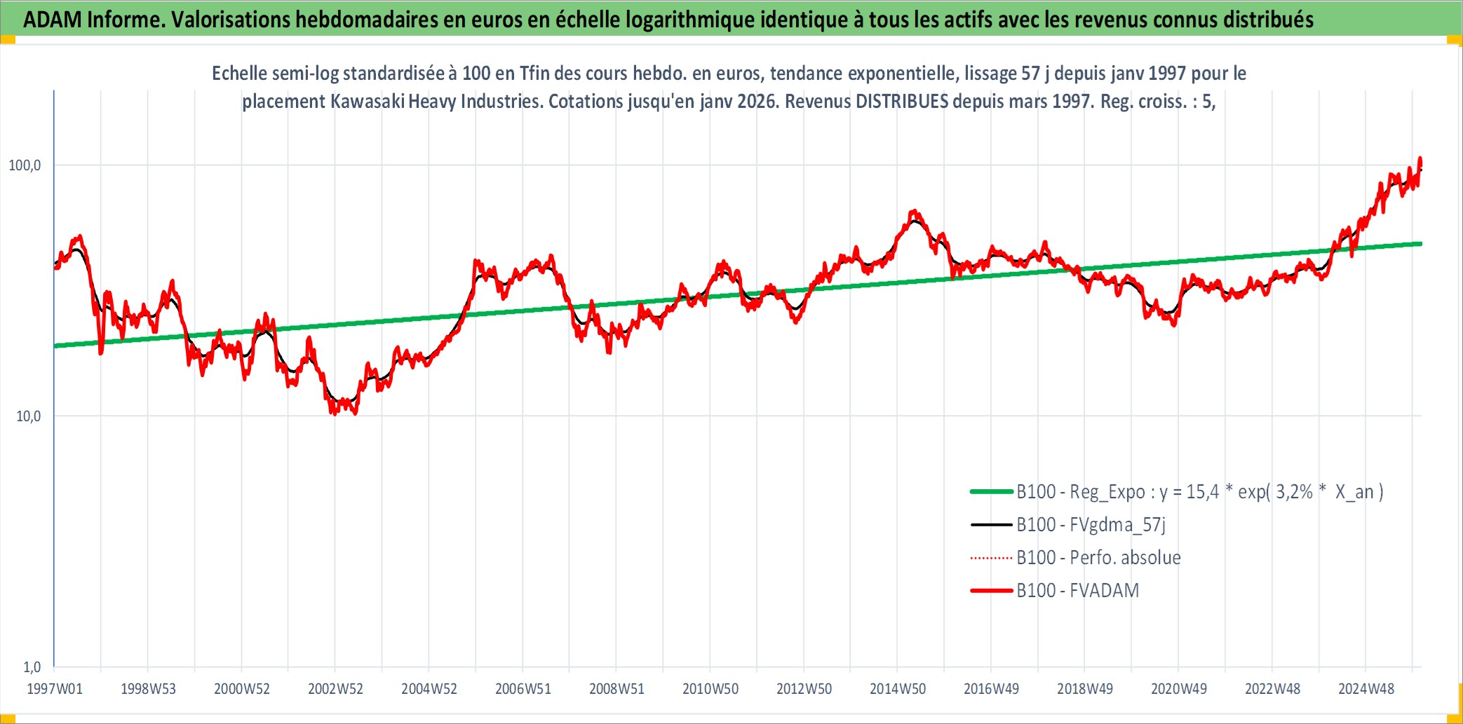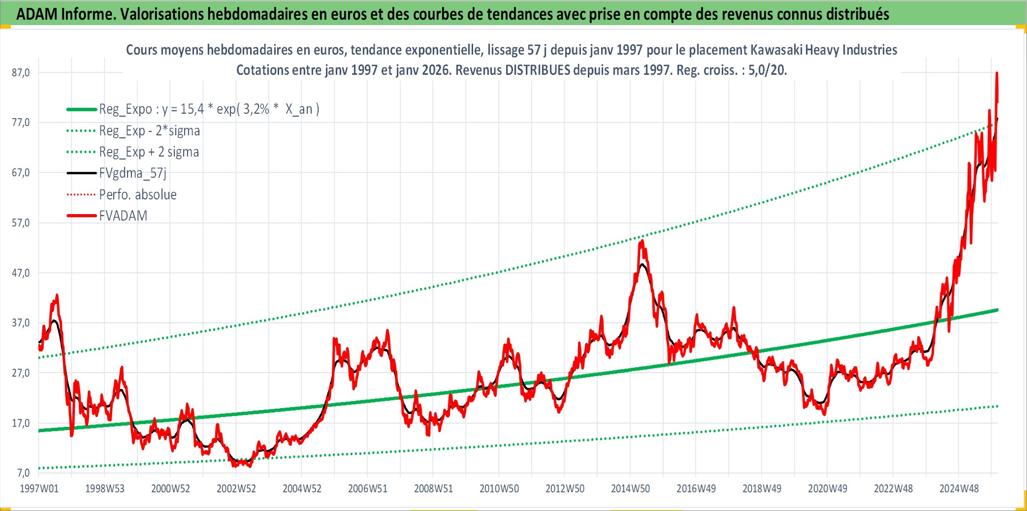 Site dédié aux investisseursPage dédiée sur site financeAnalyse des valorisations hebdomadaires de l'action Kawasaki Heavy Industries Ltd. Cet actif est cote en JPY. Les valorisations sont en contrevaleur EURO et couvrent les semaines 1997W01 a 2026W05. Les revenus de cet actif financier sont pris en compte depuis la semaine 1997W13. La note globale ESG de cet actif est estimee a 2.0 (apres rebasage entre 0 et 20).