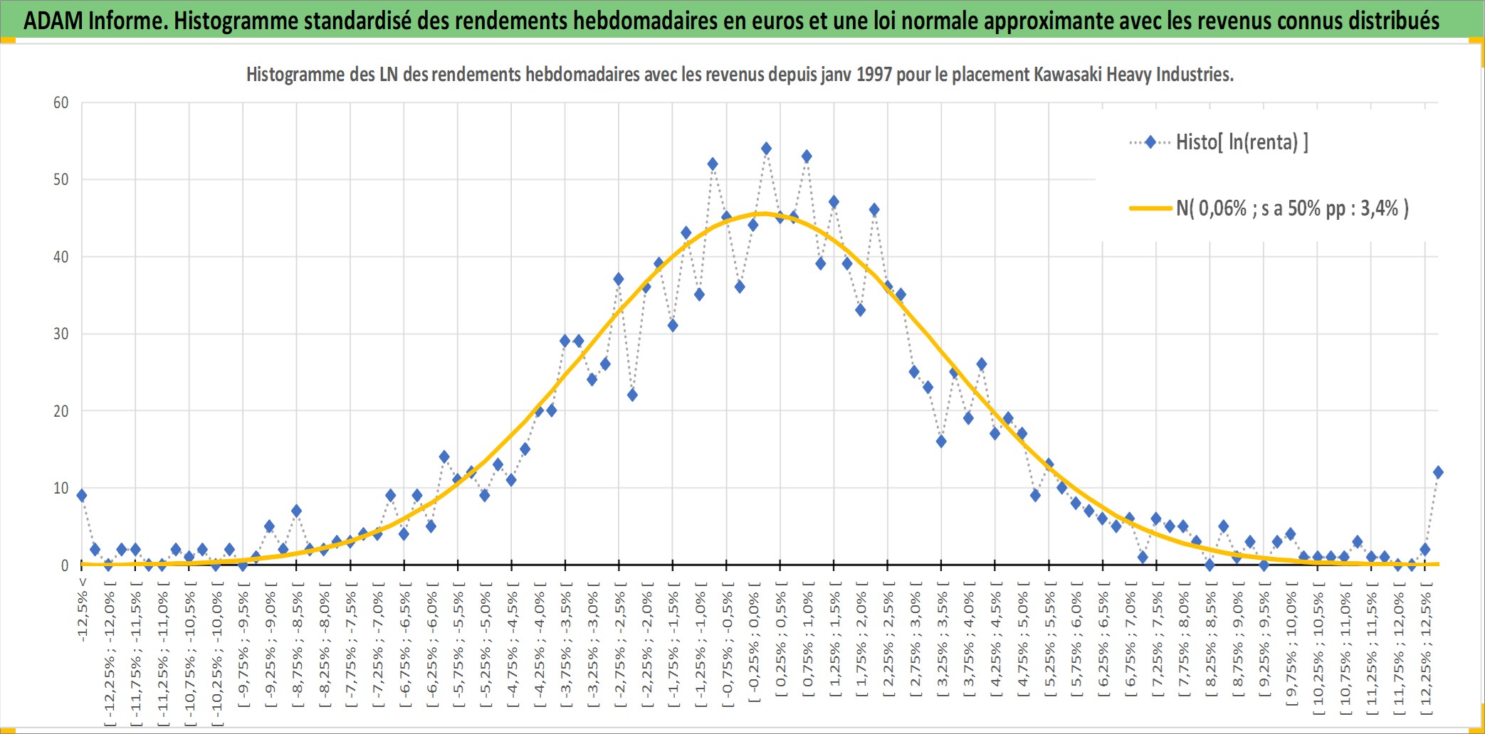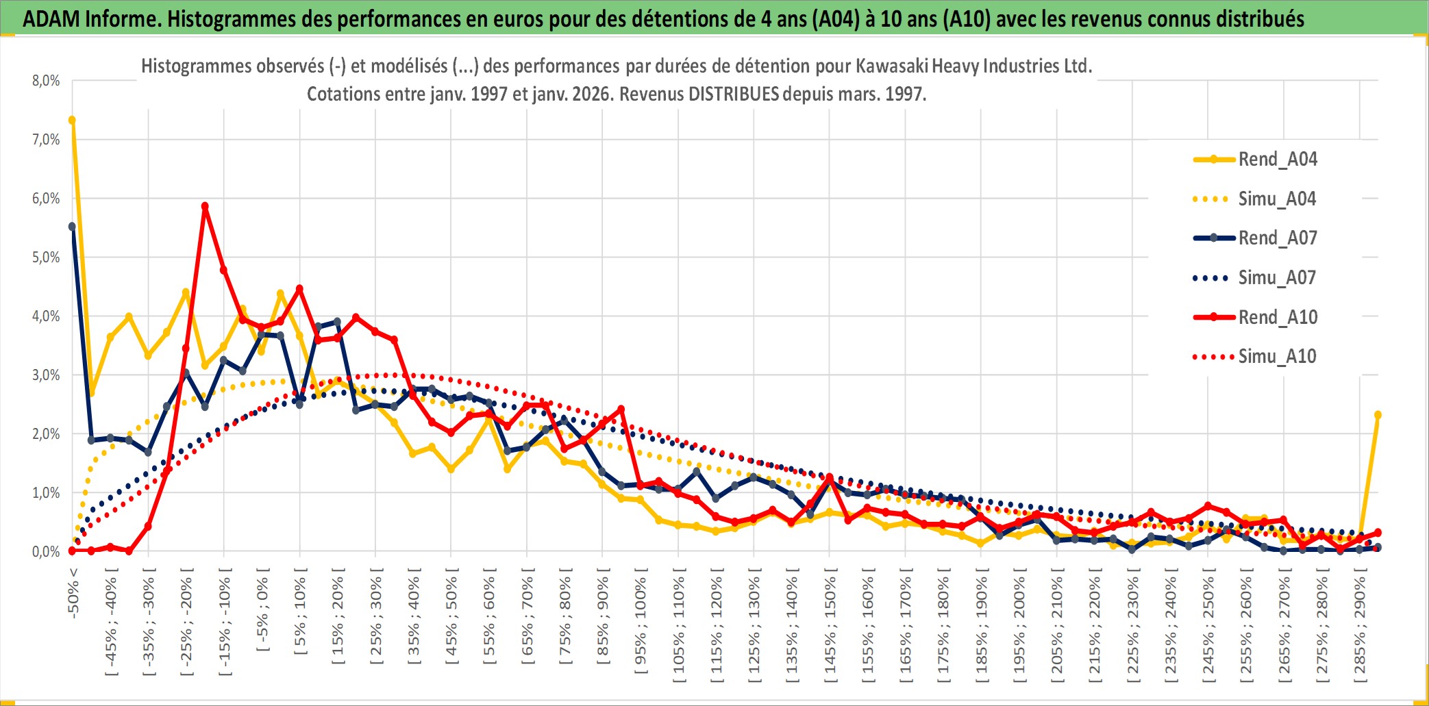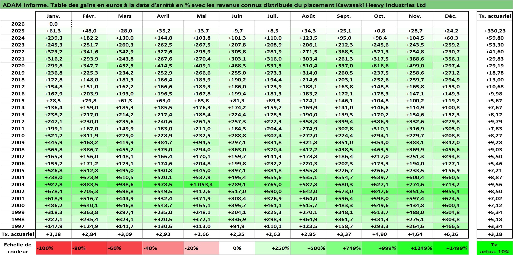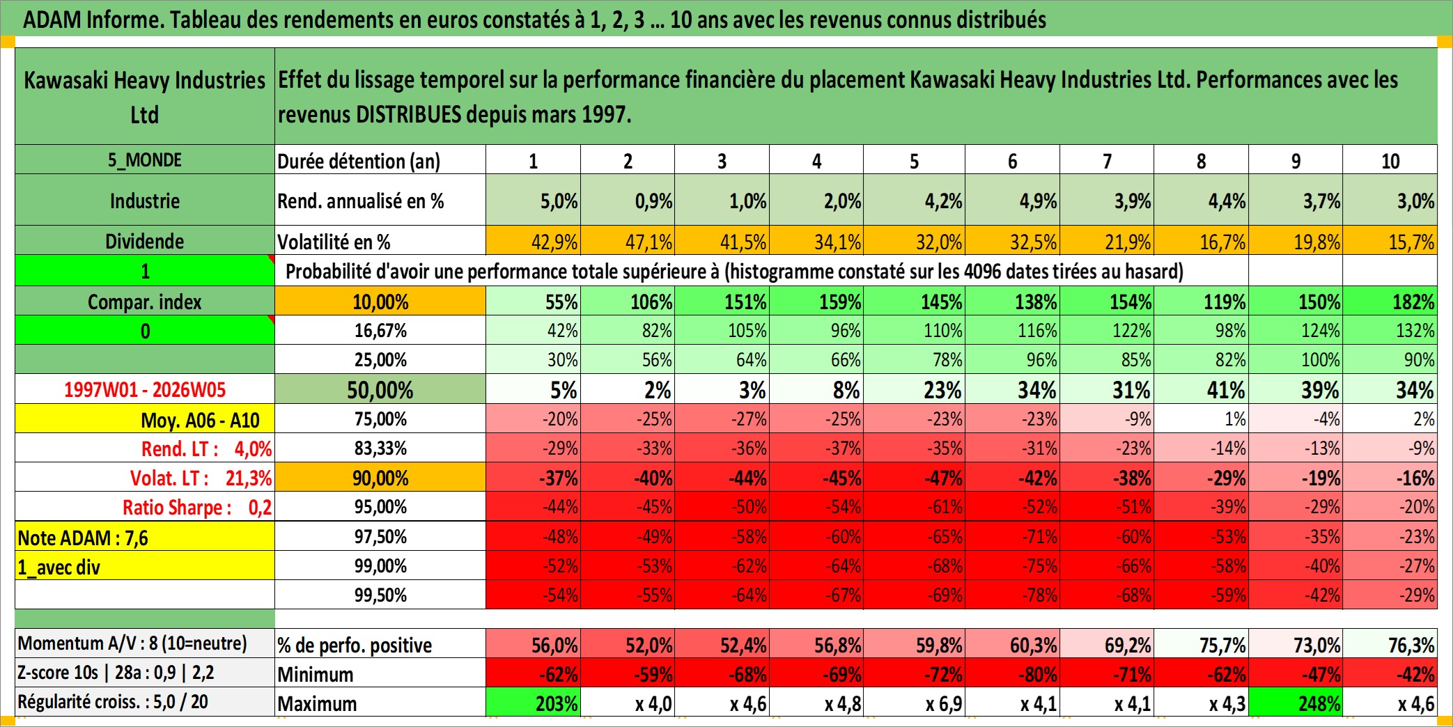 Site dédié aux investisseursPage dédiée sur site financeAnalyse des valorisations hebdomadaires de l'action Kawasaki Heavy Industries Ltd. Cet actif est cote en JPY. Les valorisations sont en contrevaleur EURO et couvrent les semaines 1997W01 a 2026W05. Les revenus de cet actif financier sont pris en compte depuis la semaine 1997W13. La note globale ESG de cet actif est estimee a 2.0 (apres rebasage entre 0 et 20).