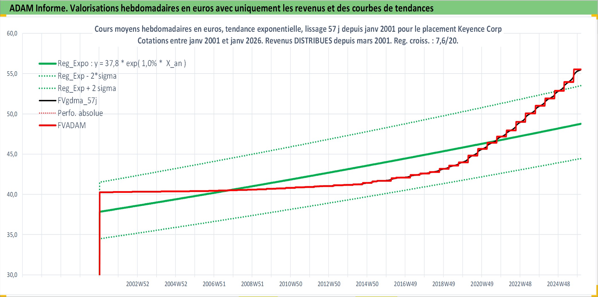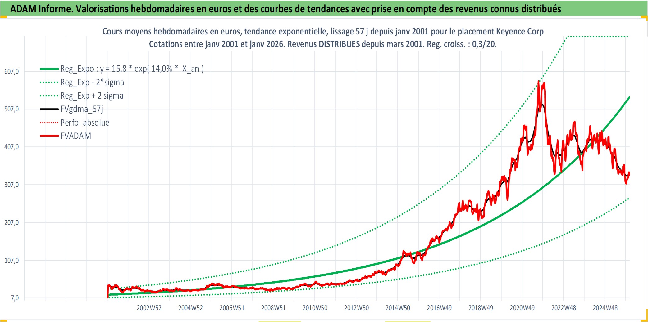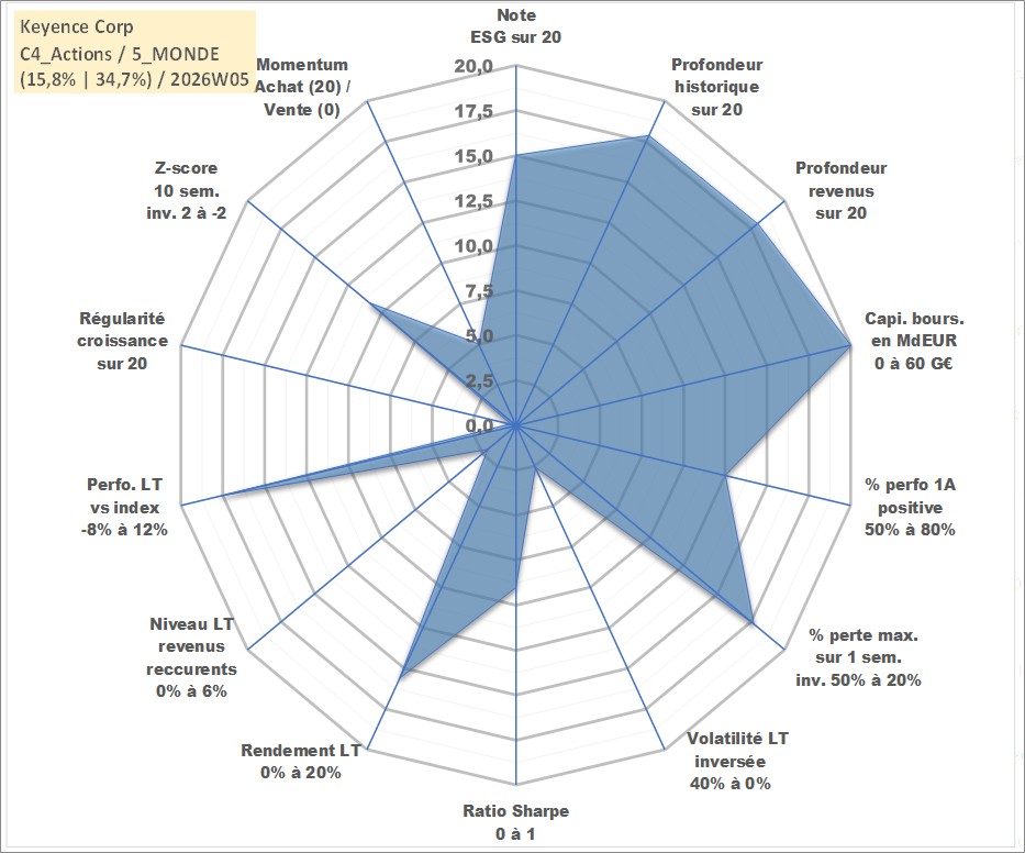 Site dédié aux investisseursPage dédiée sur site financeAnalyse des valorisations hebdomadaires de l'action Keyence Corp. Cet actif est cote en JPY. Les valorisations sont en contrevaleur EURO et couvrent les semaines 2001W01 a 2026W05. Les revenus de cet actif financier sont pris en compte depuis la semaine 2001W11. La note globale ESG de cet actif est estimee a 15.0 (apres rebasage entre 0 et 20).