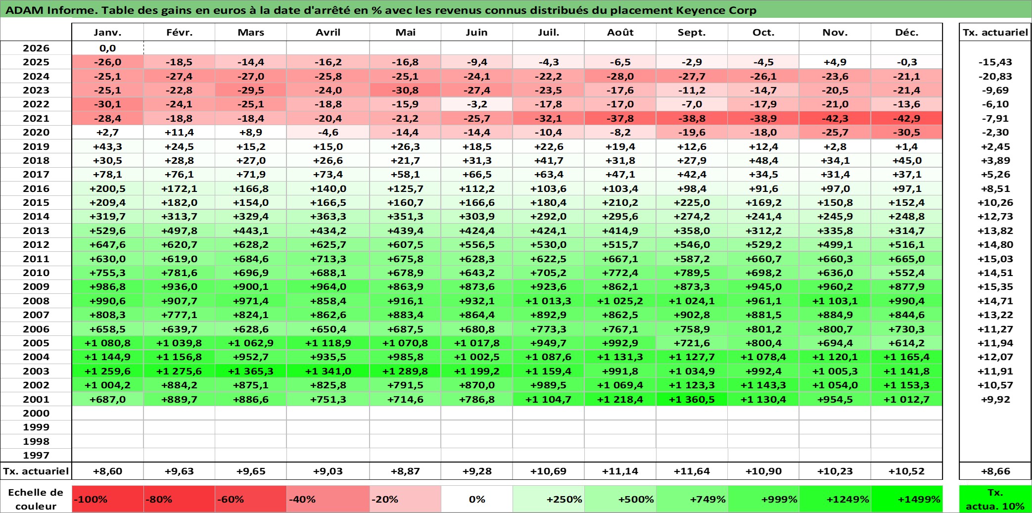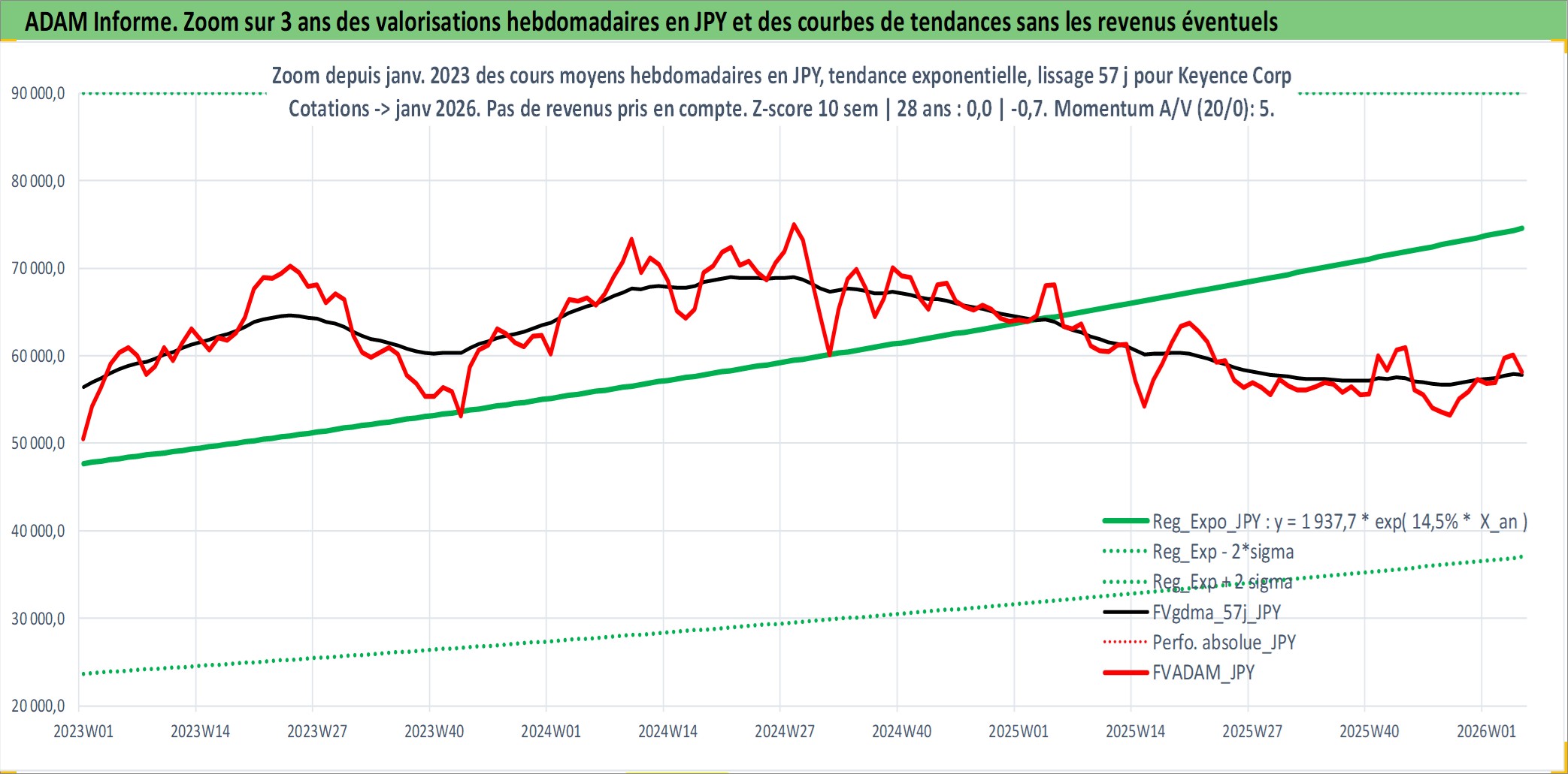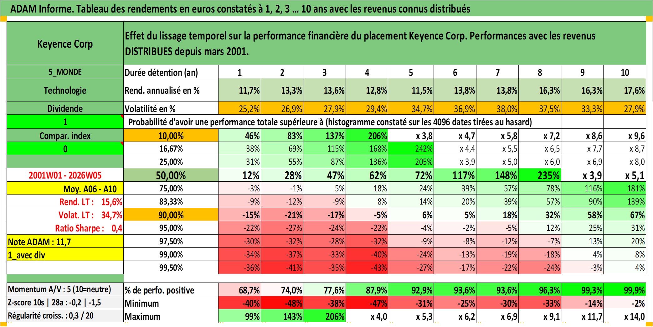 Site dédié aux investisseursPage dédiée sur site financeAnalyse des valorisations hebdomadaires de l'action Keyence Corp. Cet actif est cote en JPY. Les valorisations sont en contrevaleur EURO et couvrent les semaines 2001W01 a 2026W05. Les revenus de cet actif financier sont pris en compte depuis la semaine 2001W11. La note globale ESG de cet actif est estimee a 15.0 (apres rebasage entre 0 et 20).