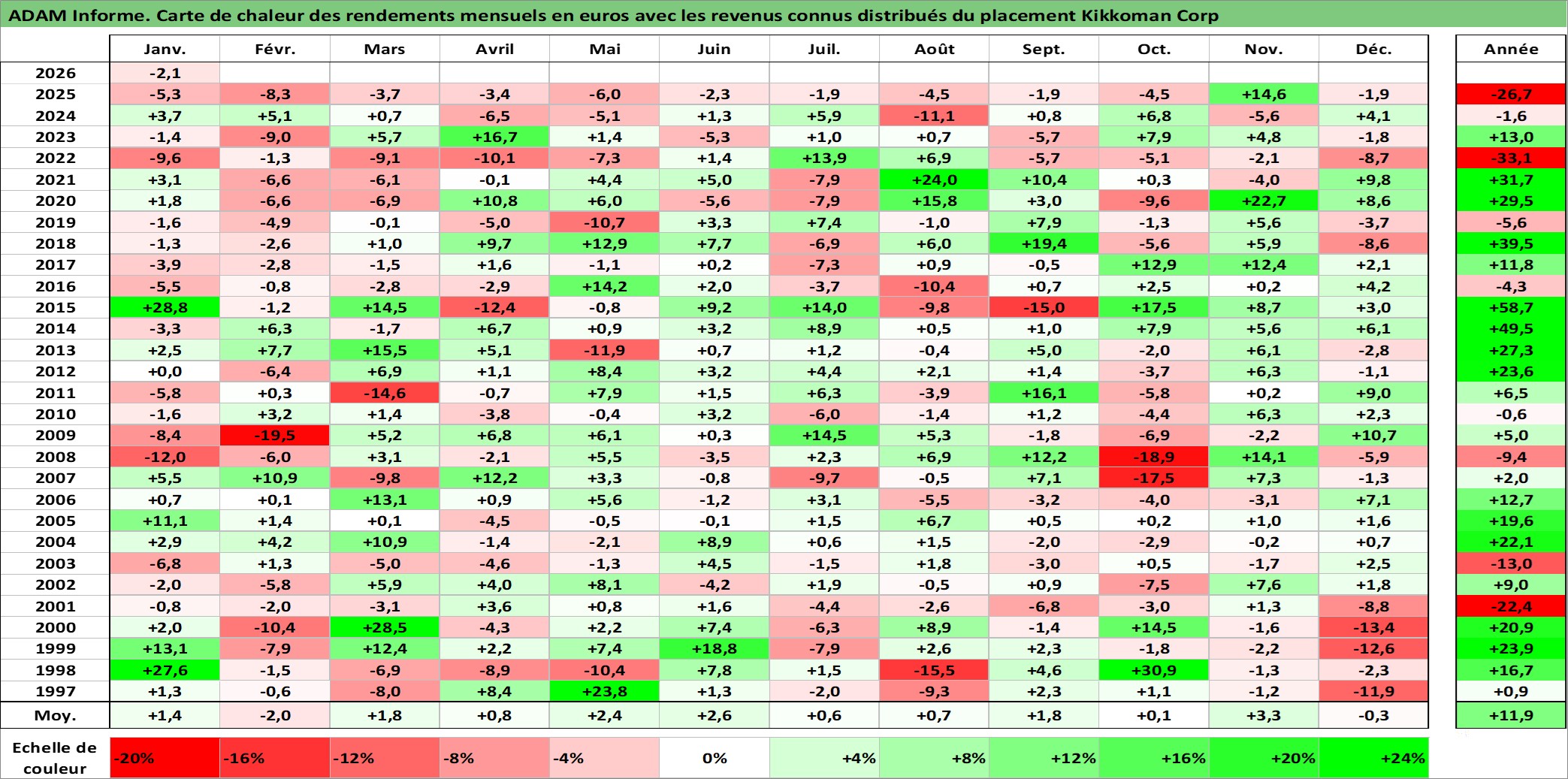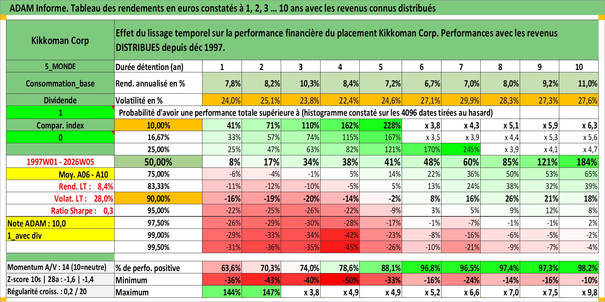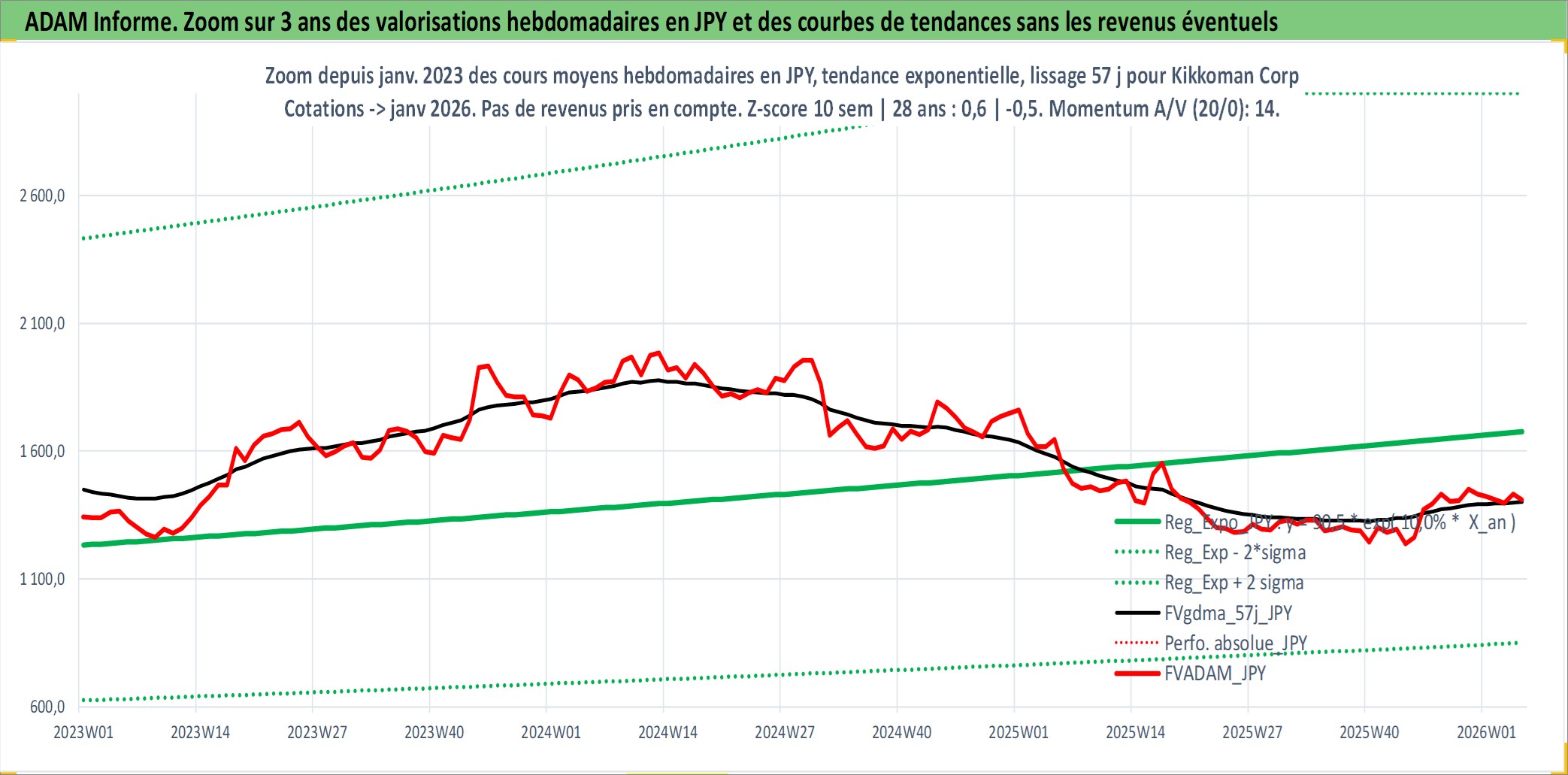 Site dédié aux investisseursPage dédiée sur site financeAnalyse des valorisations hebdomadaires de l'action Kikkoman Corp. Cet actif est cote en JPY. Les valorisations sont en contrevaleur EURO et couvrent les semaines 1997W01 a 2026W05. Les revenus de cet actif financier sont pris en compte depuis la semaine 1997W52. La note globale ESG de cet actif est estimee a 3.0 (apres rebasage entre 0 et 20).