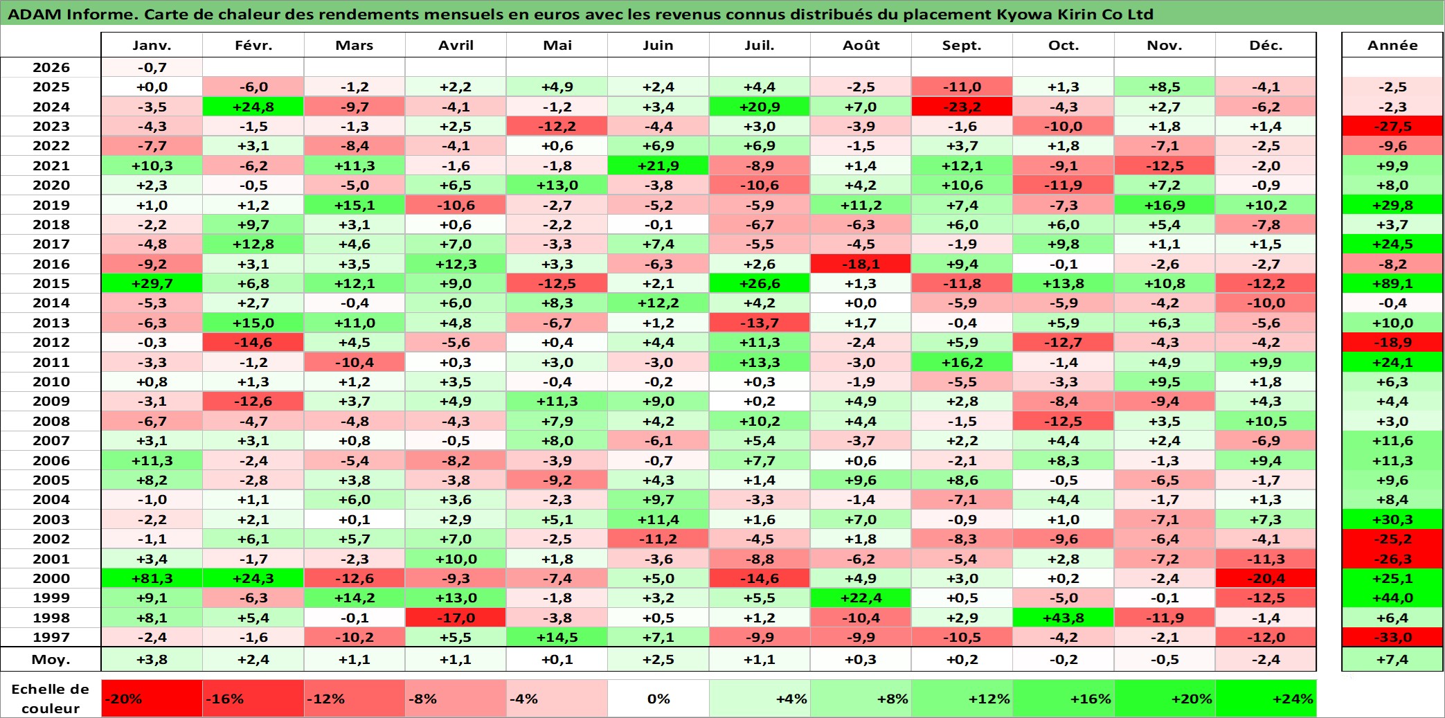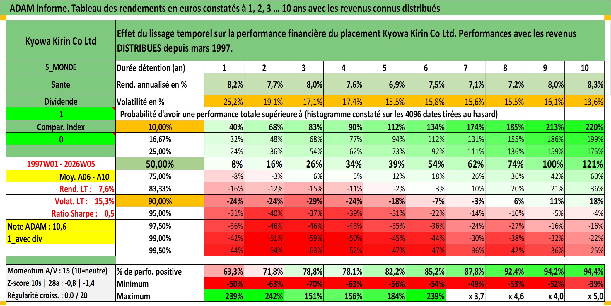 Site dédié aux investisseursPage dédiée sur site financeAnalyse des valorisations hebdomadaires de l'action Kyowa Kirin Co Ltd. Cet actif est cote en JPY. Les valorisations sont en contrevaleur EURO et couvrent les semaines 1997W01 a 2026W05. Les revenus de cet actif financier sont pris en compte depuis la semaine 1997W13. La note globale ESG de cet actif est estimee a 8.0 (apres rebasage entre 0 et 20).