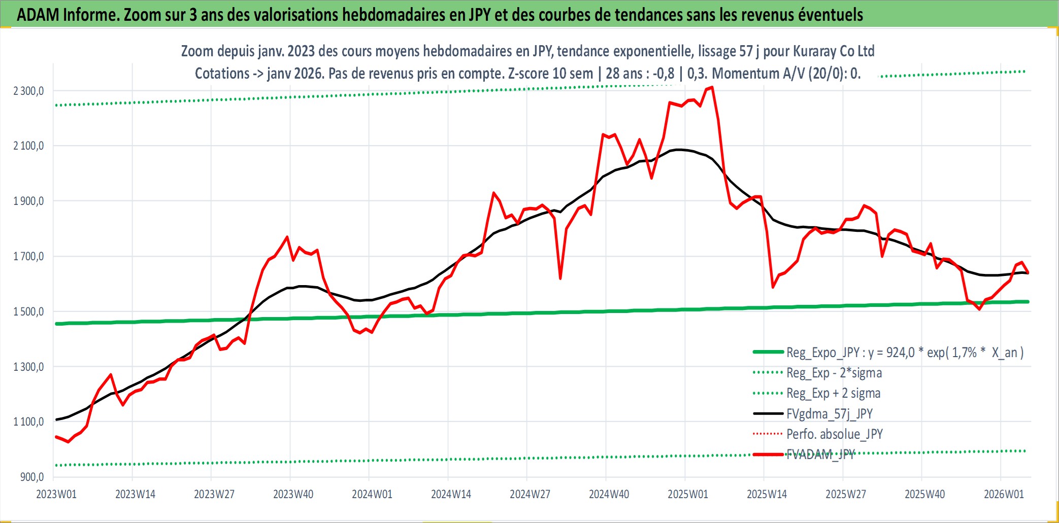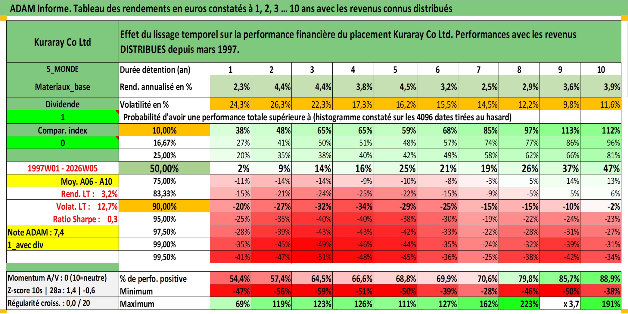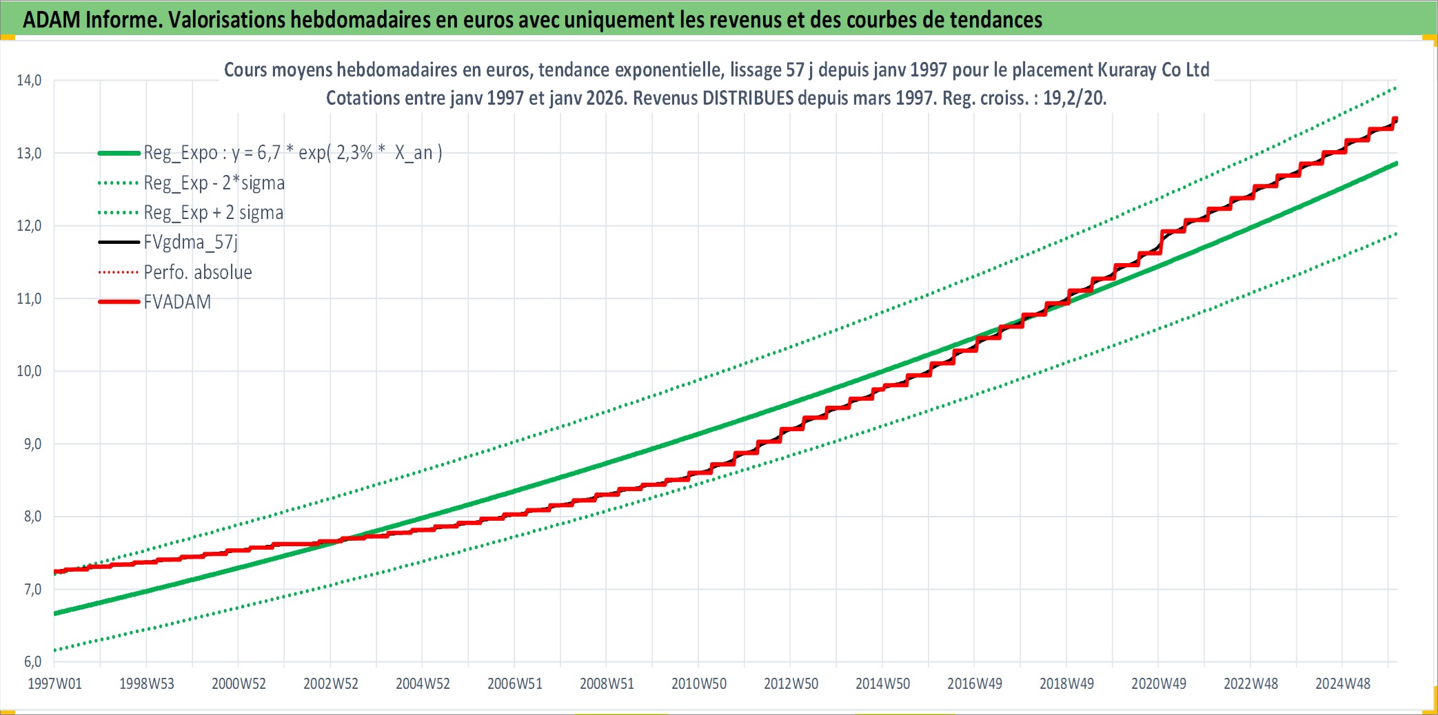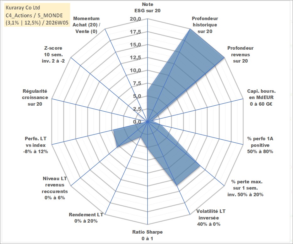 Site dédié aux investisseursPage dédiée sur site financeAnalyse des valorisations hebdomadaires de l'action Kuraray Co Ltd. Cet actif est cote en JPY. Les valorisations sont en contrevaleur EURO et couvrent les semaines 1997W01 a 2026W05. Les revenus de cet actif financier sont pris en compte depuis la semaine 1997W13. La note globale ESG de cet actif est estimee a 6.0 (apres rebasage entre 0 et 20).