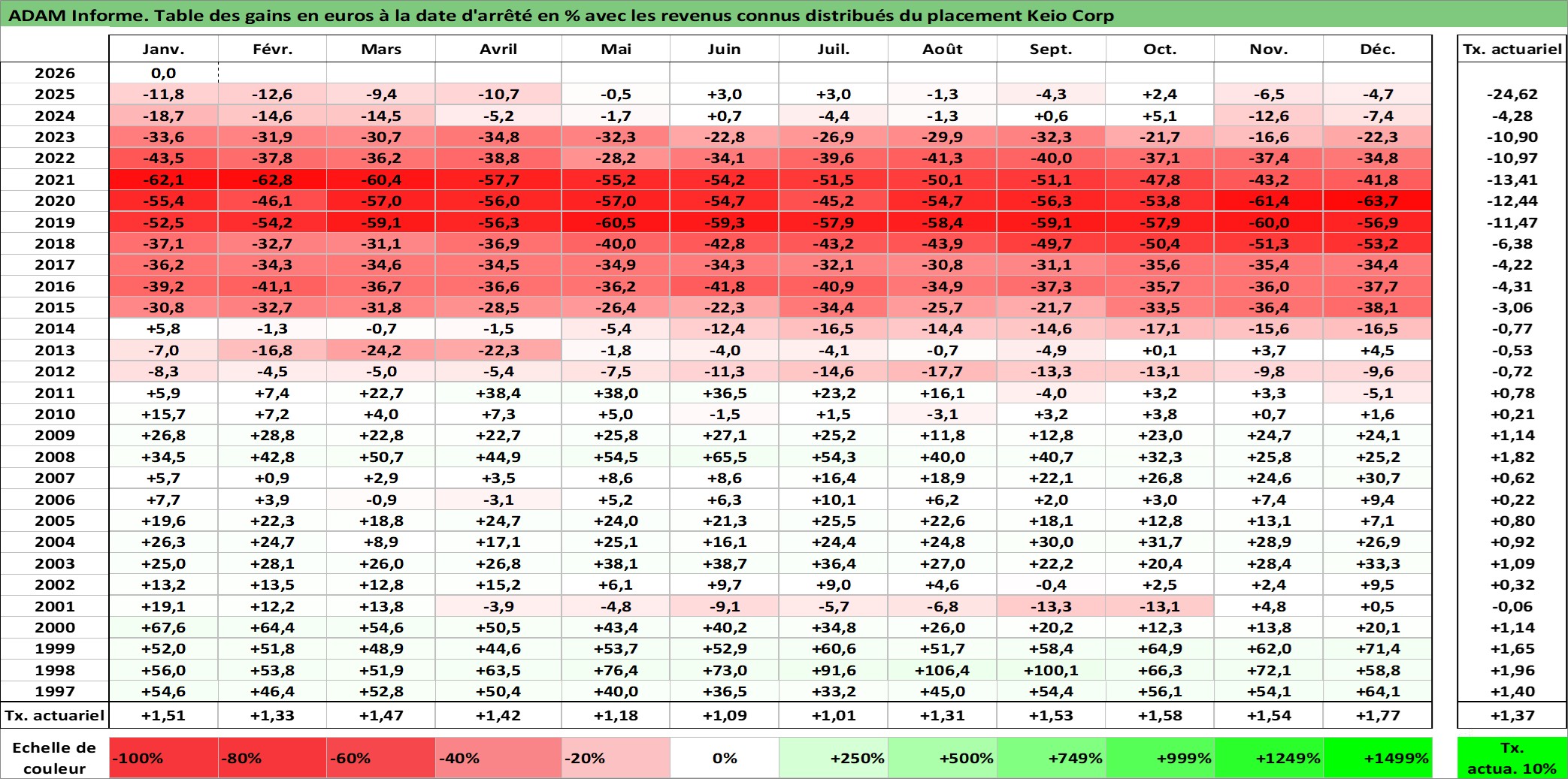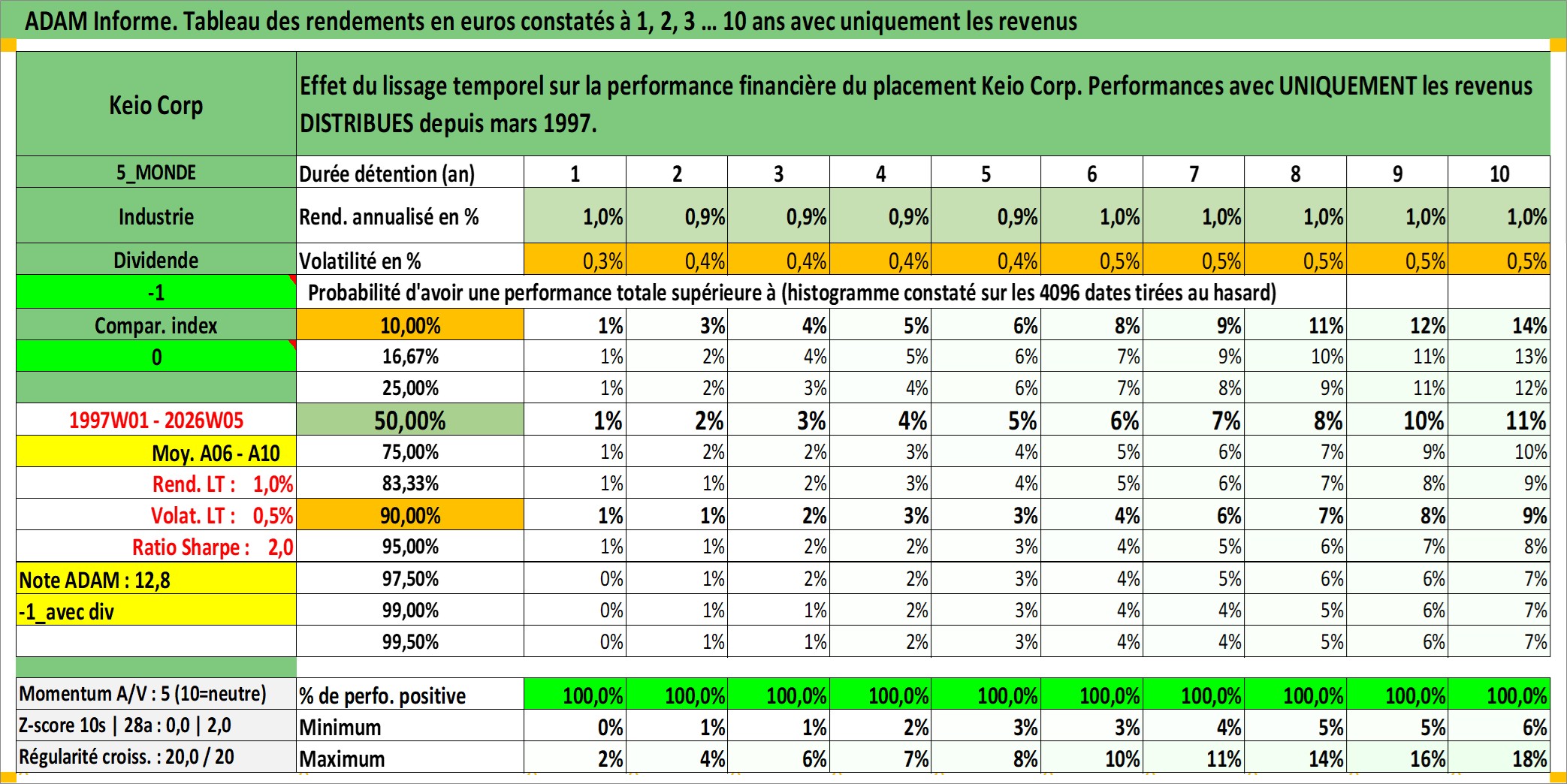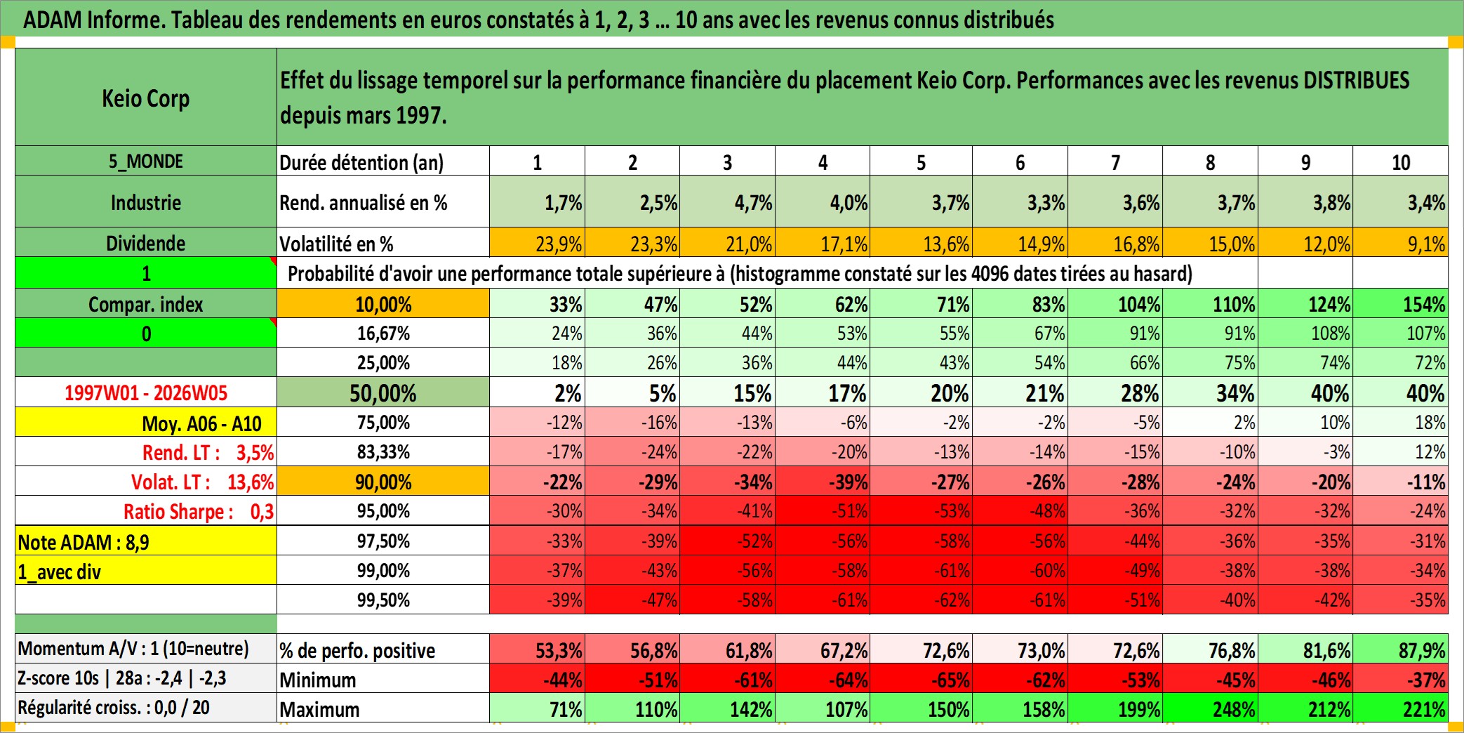 Site dédié aux investisseursPage dédiée sur site financeAnalyse des valorisations hebdomadaires de l'action Keio Corp. Cet actif est cote en JPY. Les valorisations sont en contrevaleur EURO et couvrent les semaines 1997W01 a 2026W05. Les revenus de cet actif financier sont pris en compte depuis la semaine 1997W13. La note ESG de cet actif n'est pas connue.