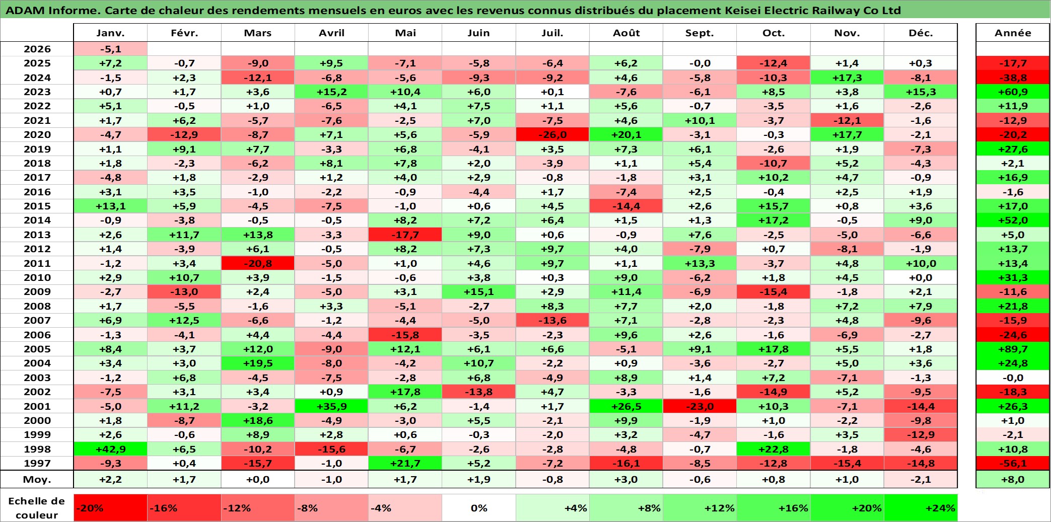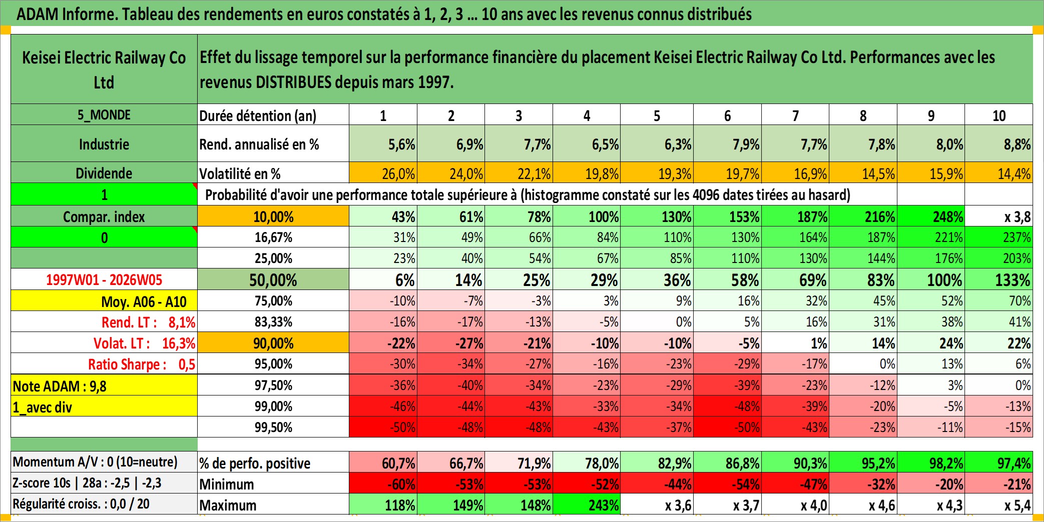 Site dédié aux investisseursPage dédiée sur site financeAnalyse des valorisations hebdomadaires de l'action Keisei Electric Railway Co Ltd. Cet actif est cote en JPY. Les valorisations sont en contrevaleur EURO et couvrent les semaines 1997W01 a 2026W05. Les revenus de cet actif financier sont pris en compte depuis la semaine 1997W13. La note ESG de cet actif n'est pas connue.