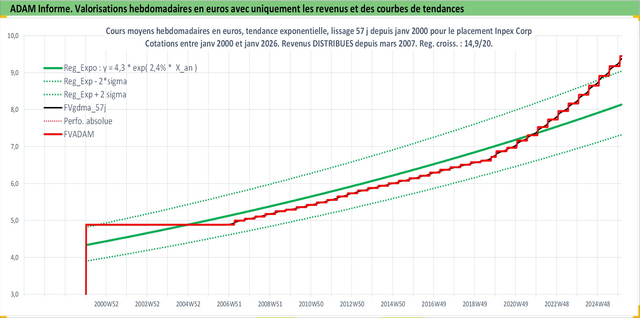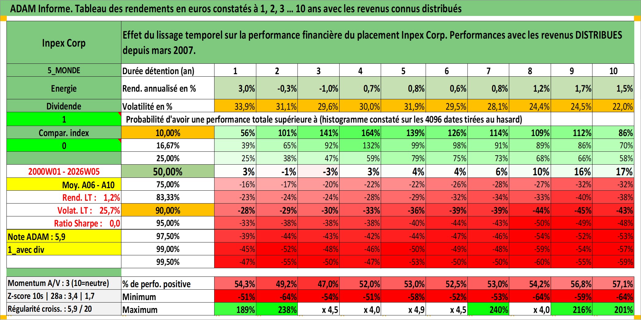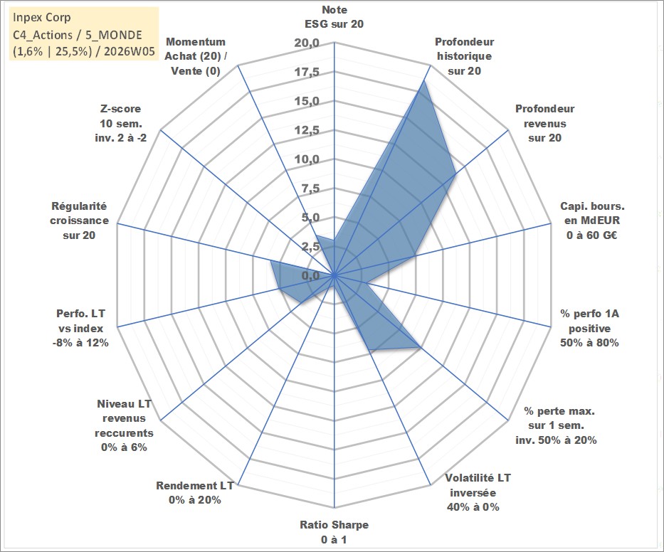 Site dédié aux investisseursPage dédiée sur site financeAnalyse des valorisations hebdomadaires de l'action Inpex Corp. Cet actif est cote en JPY. Les valorisations sont en contrevaleur EURO et couvrent les semaines 2000W01 a 2026W05. Les revenus de cet actif financier sont pris en compte depuis la semaine 2007W13. La note globale ESG de cet actif est estimee a 3.0 (apres rebasage entre 0 et 20).